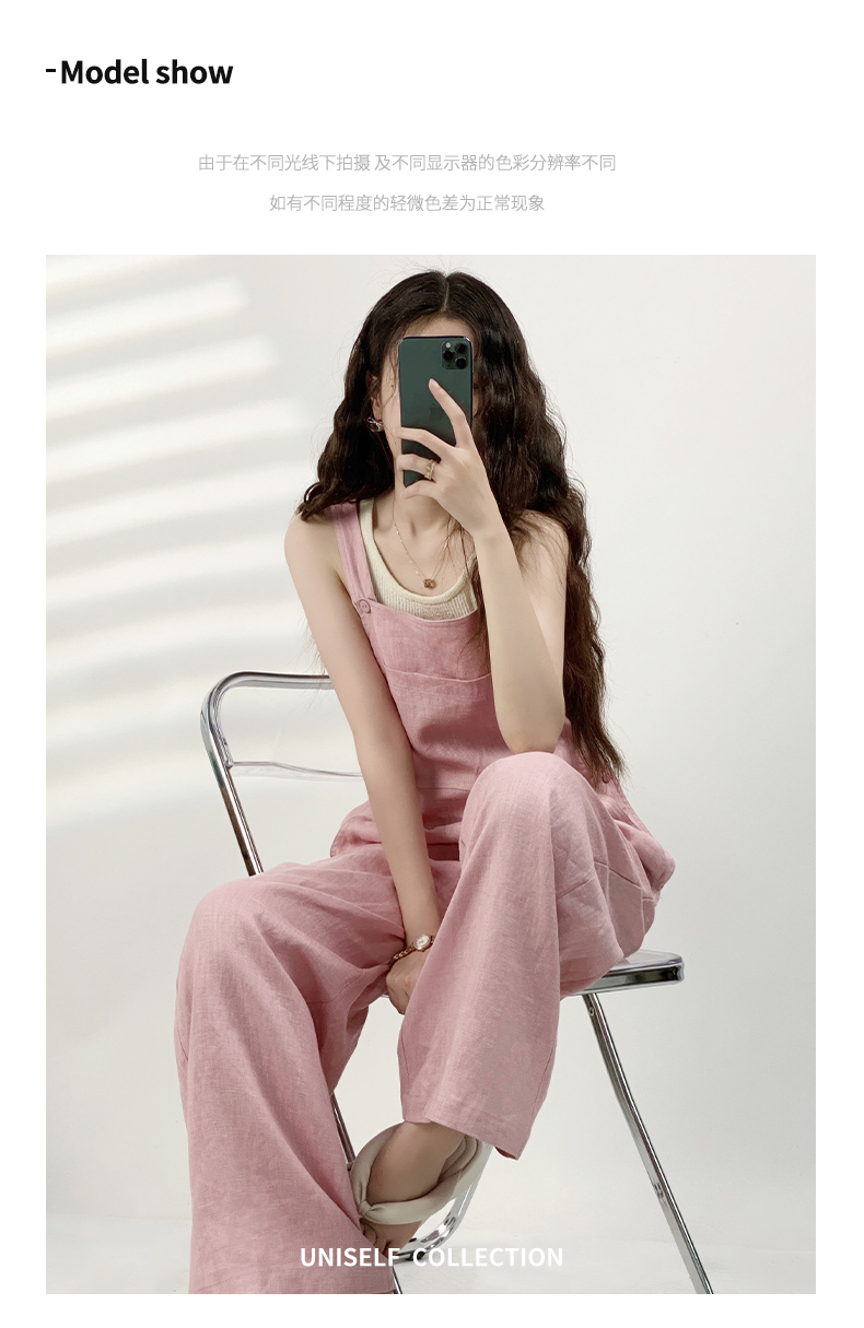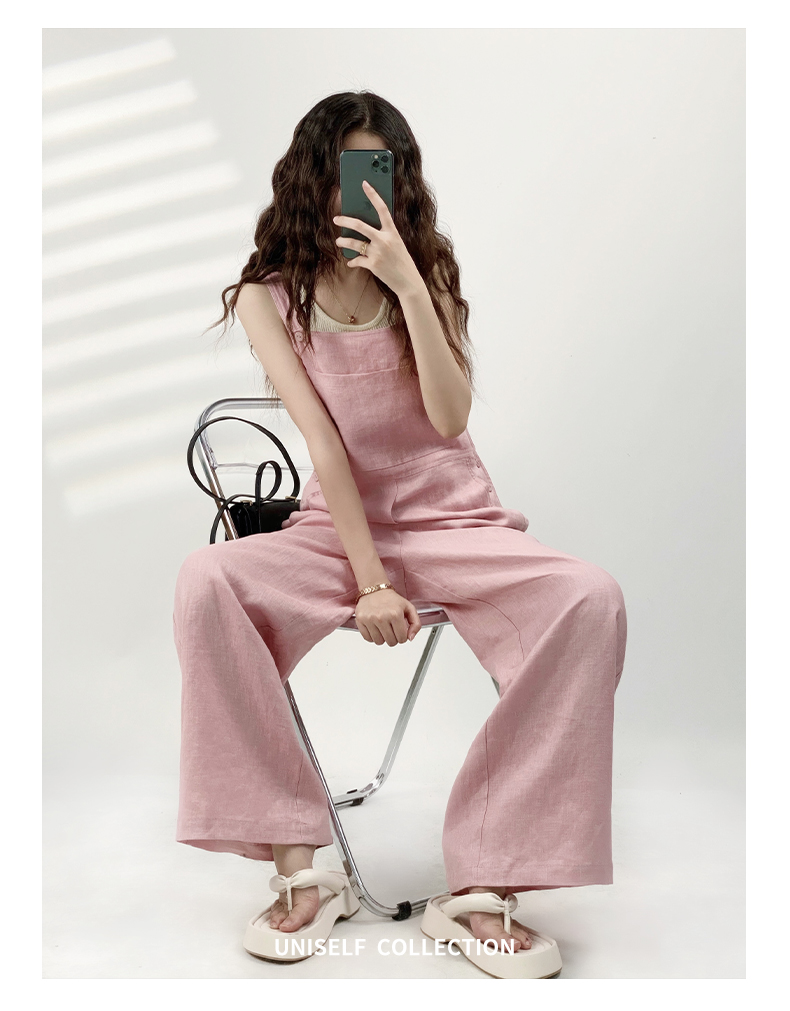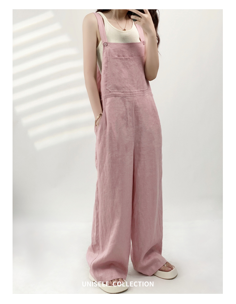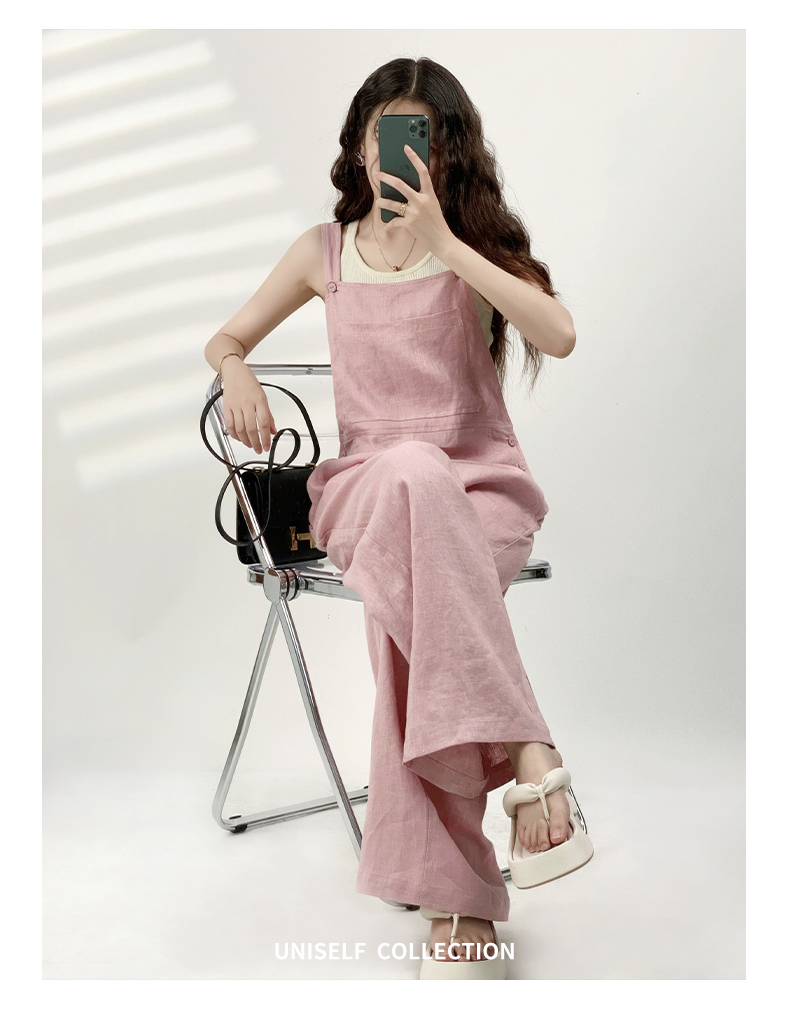 YN【现货7天】粉色法式亚麻背带裤女2023年夏季新款韩版休闲百搭慵懒宽松阔腿裤