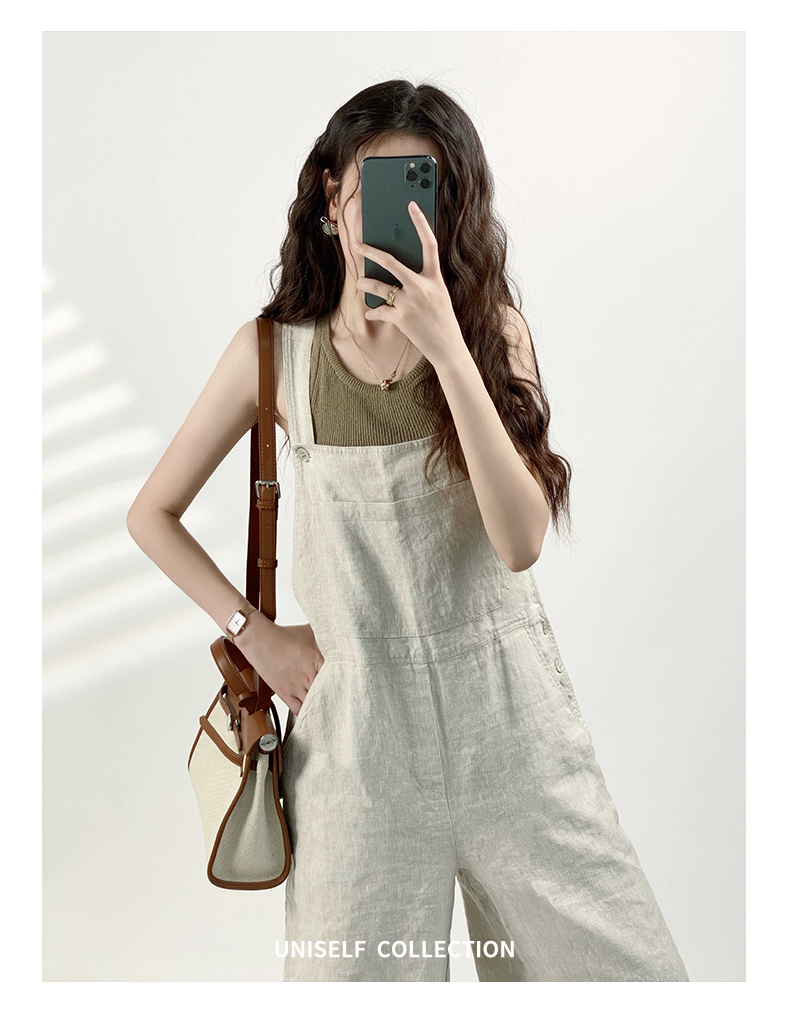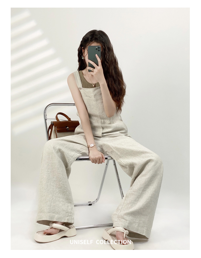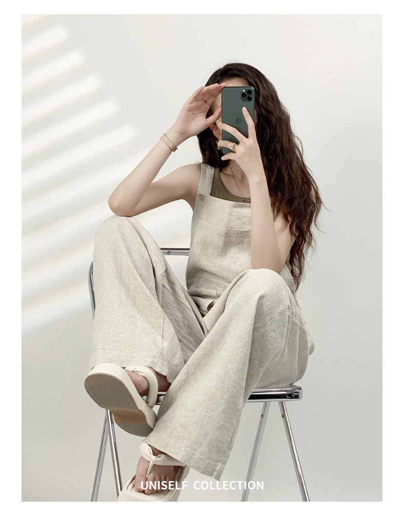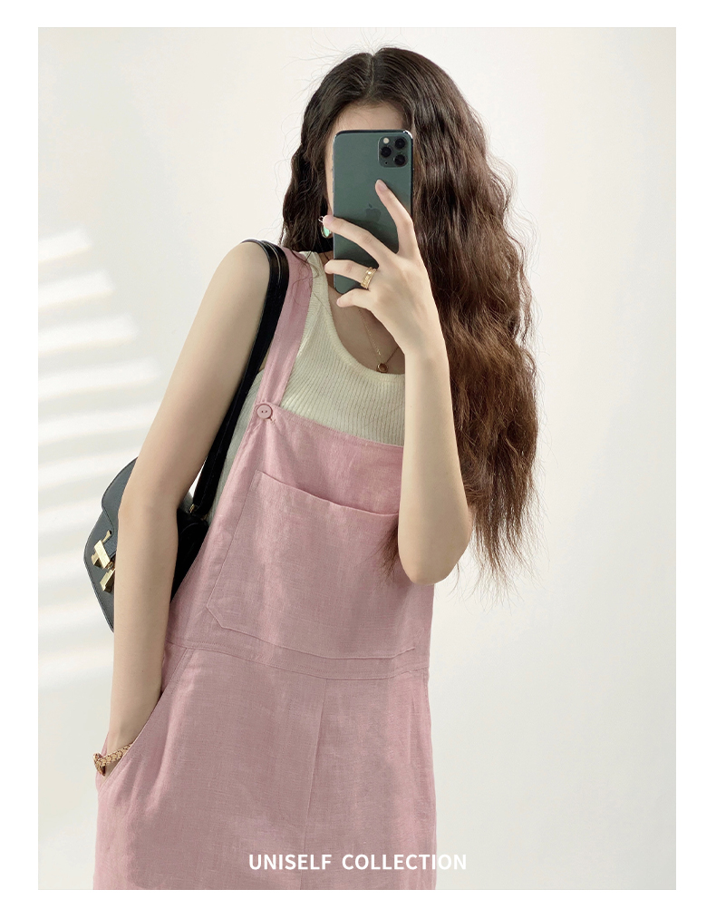 YN【现货7天】粉色法式亚麻背带裤女2023年夏季新款韩版休闲百搭慵懒宽松阔腿裤