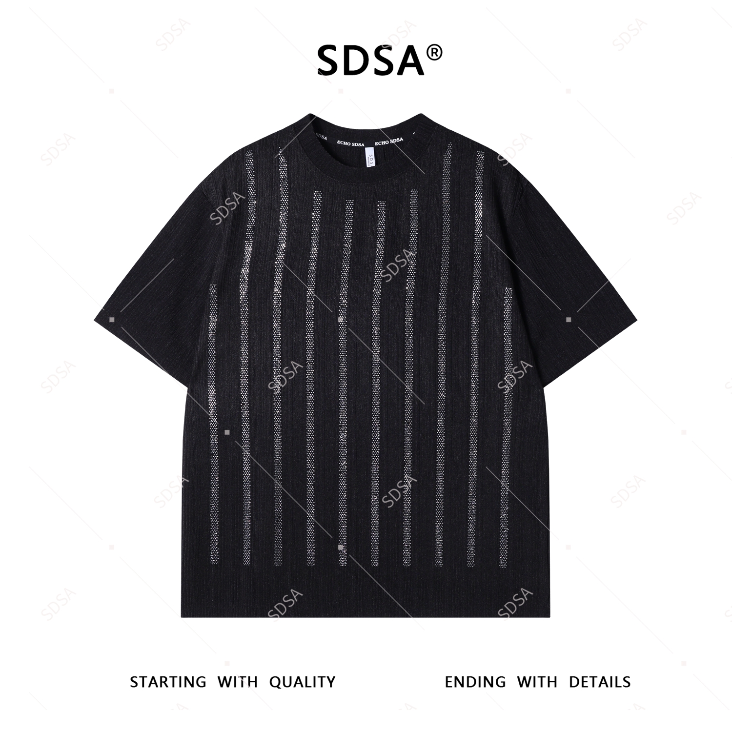 T4329SDSA夏季新款男士痞帅美式肌理感烫钻竖纹圆领短袖T恤百搭时尚