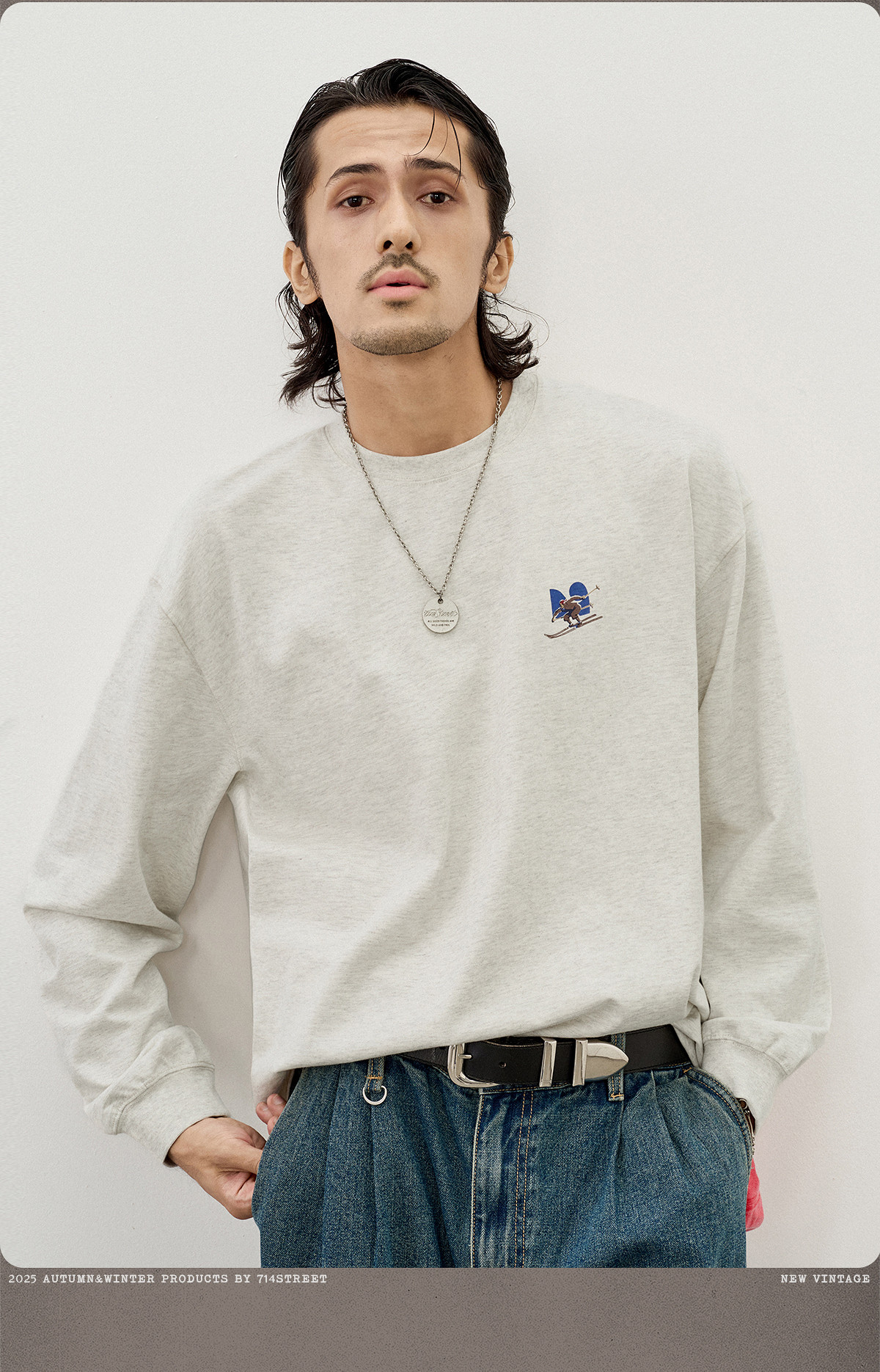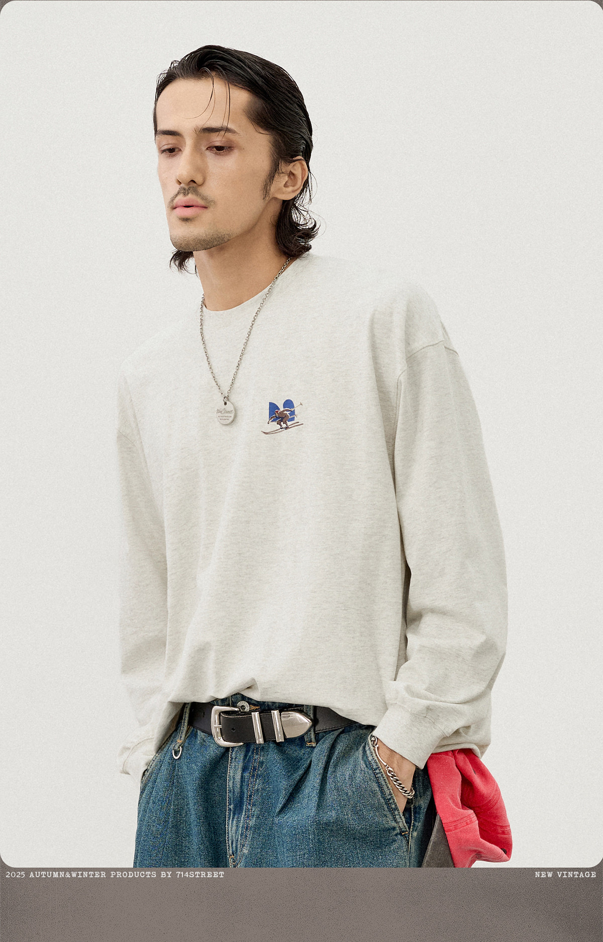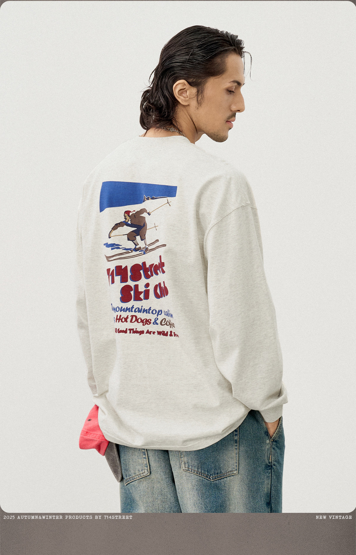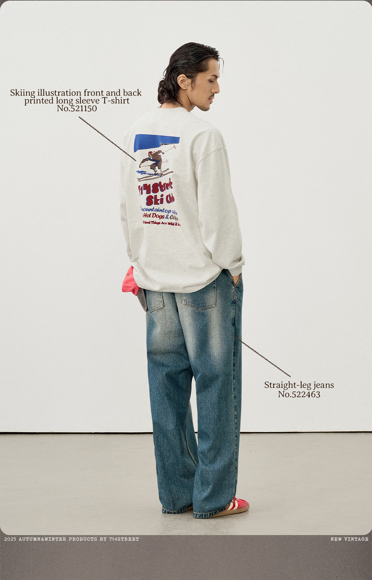 714street美式复古滑雪插画长袖上衣2025秋季情侣装纯棉印花T恤男