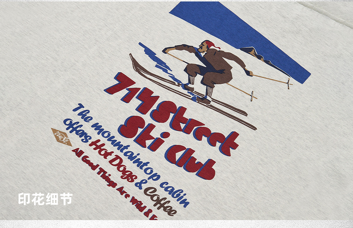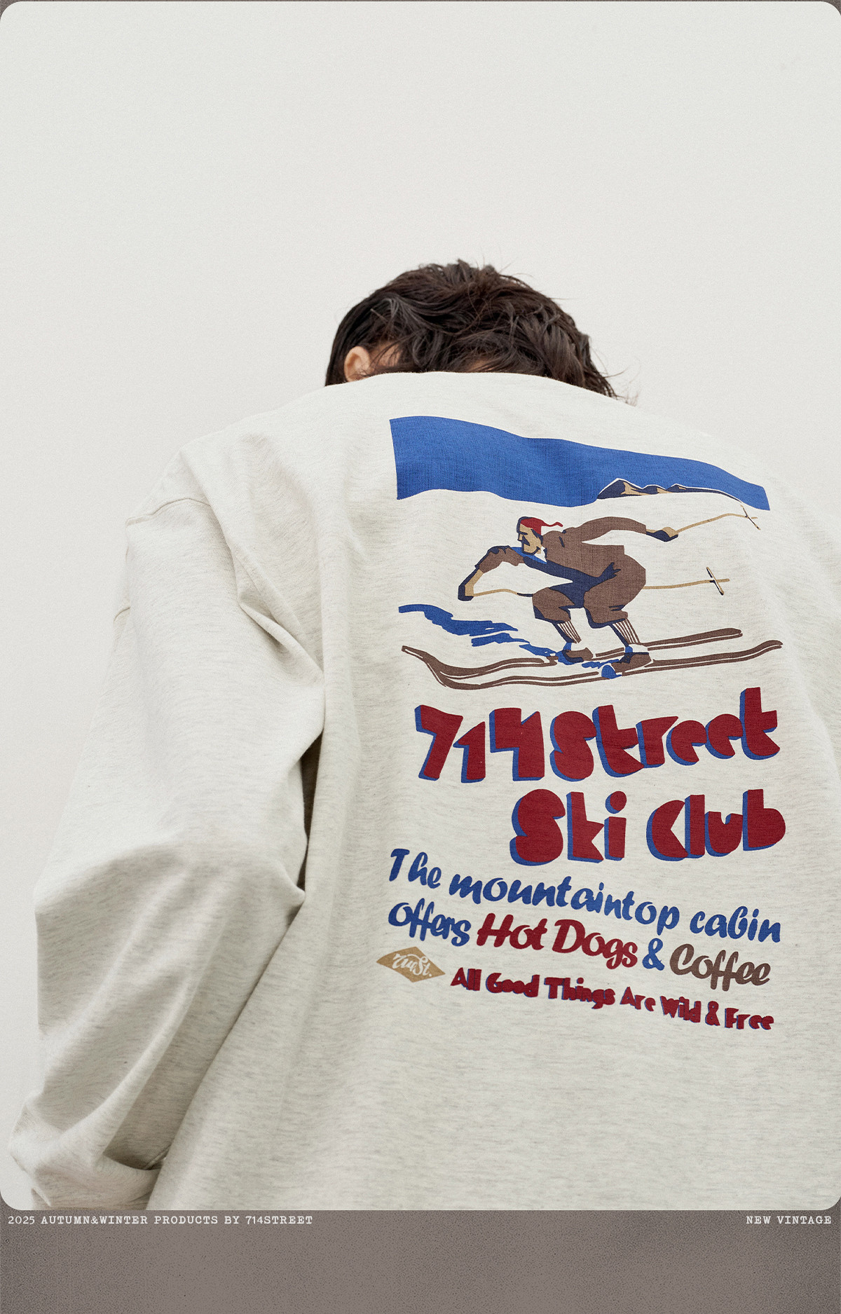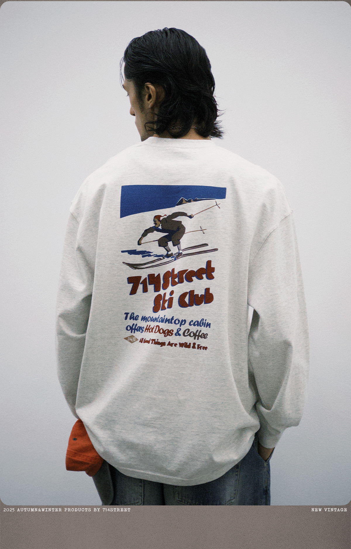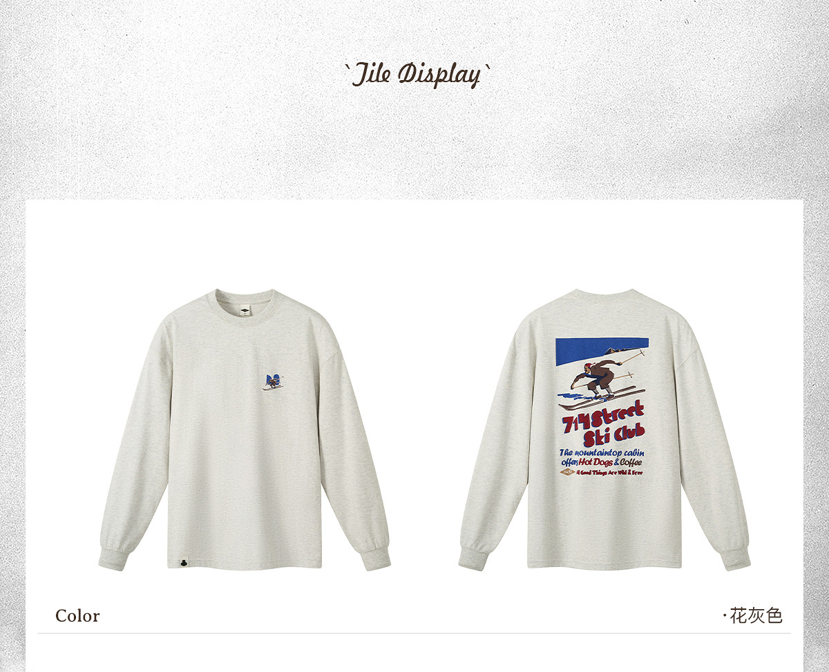 714street美式复古滑雪插画长袖上衣2025秋季情侣装纯棉印花T恤男
