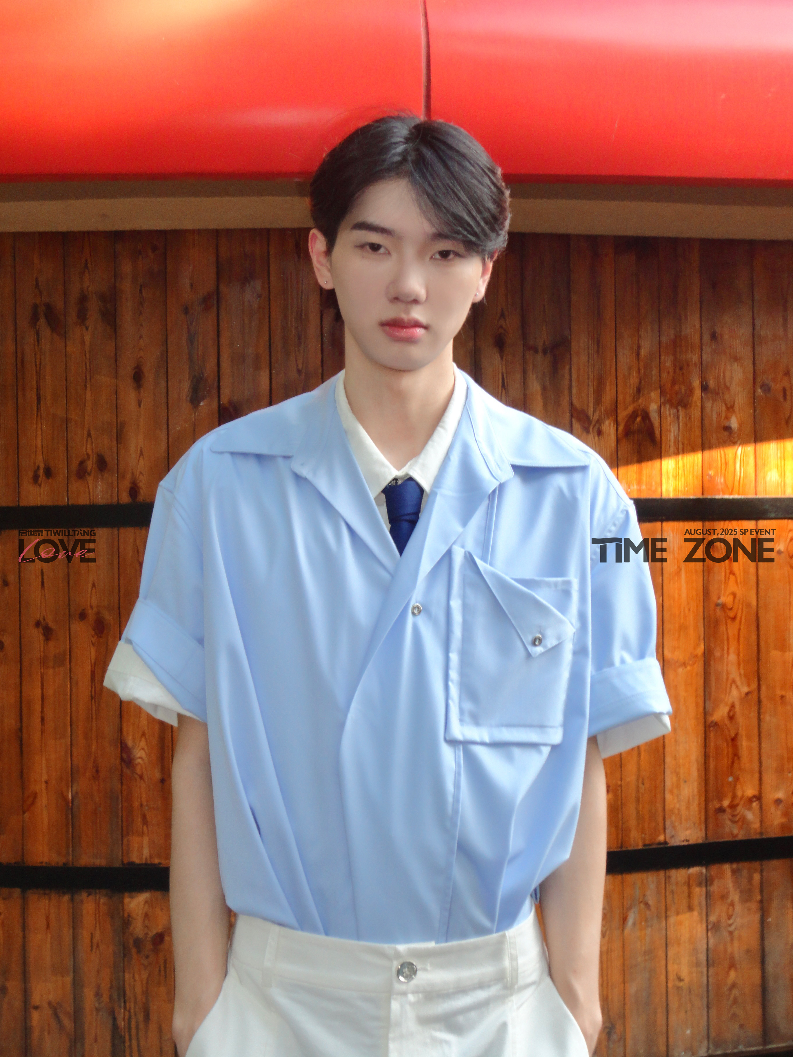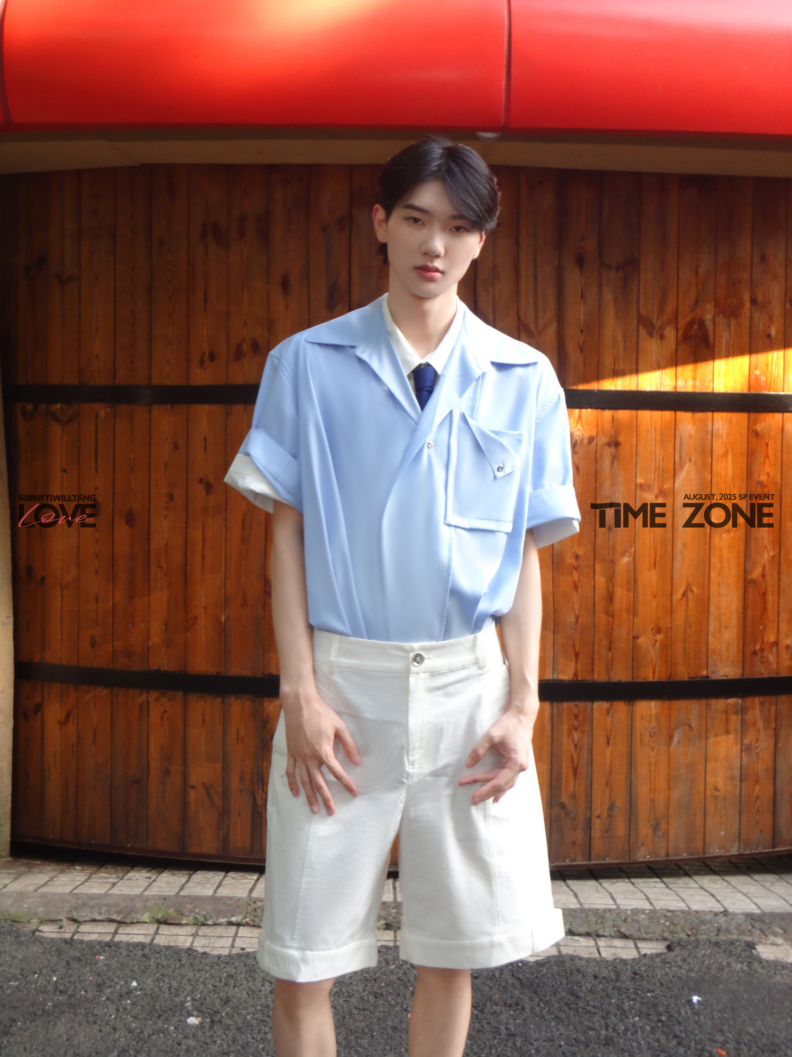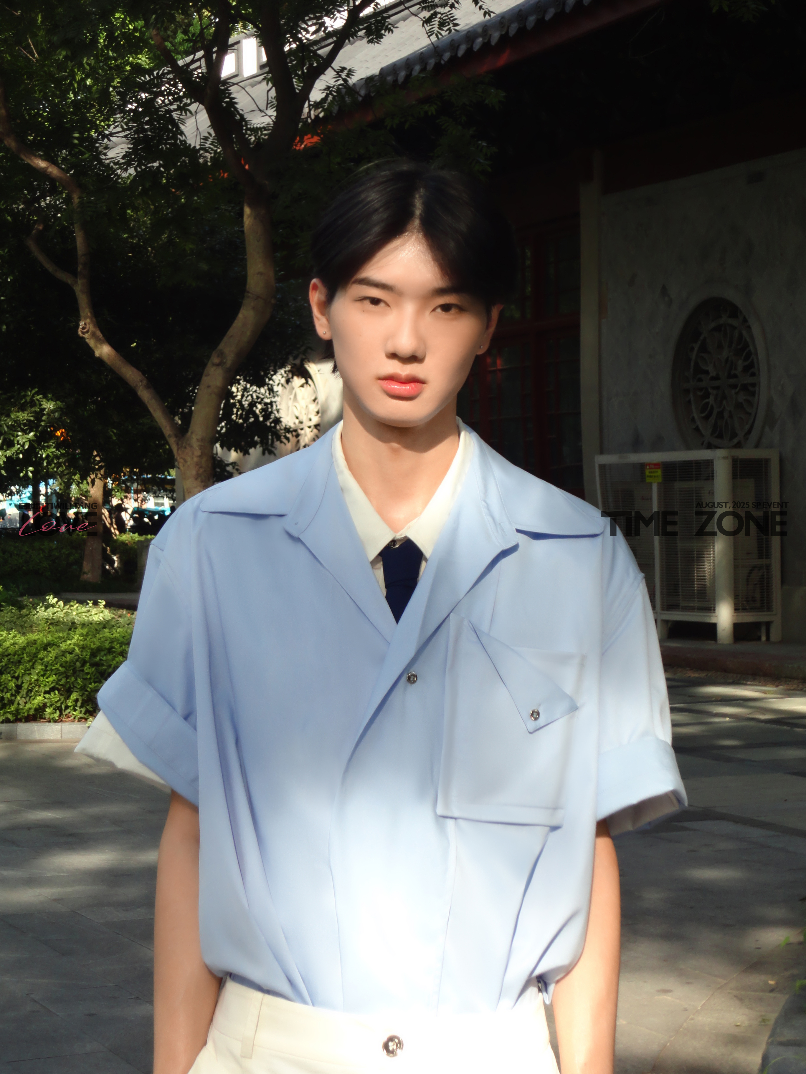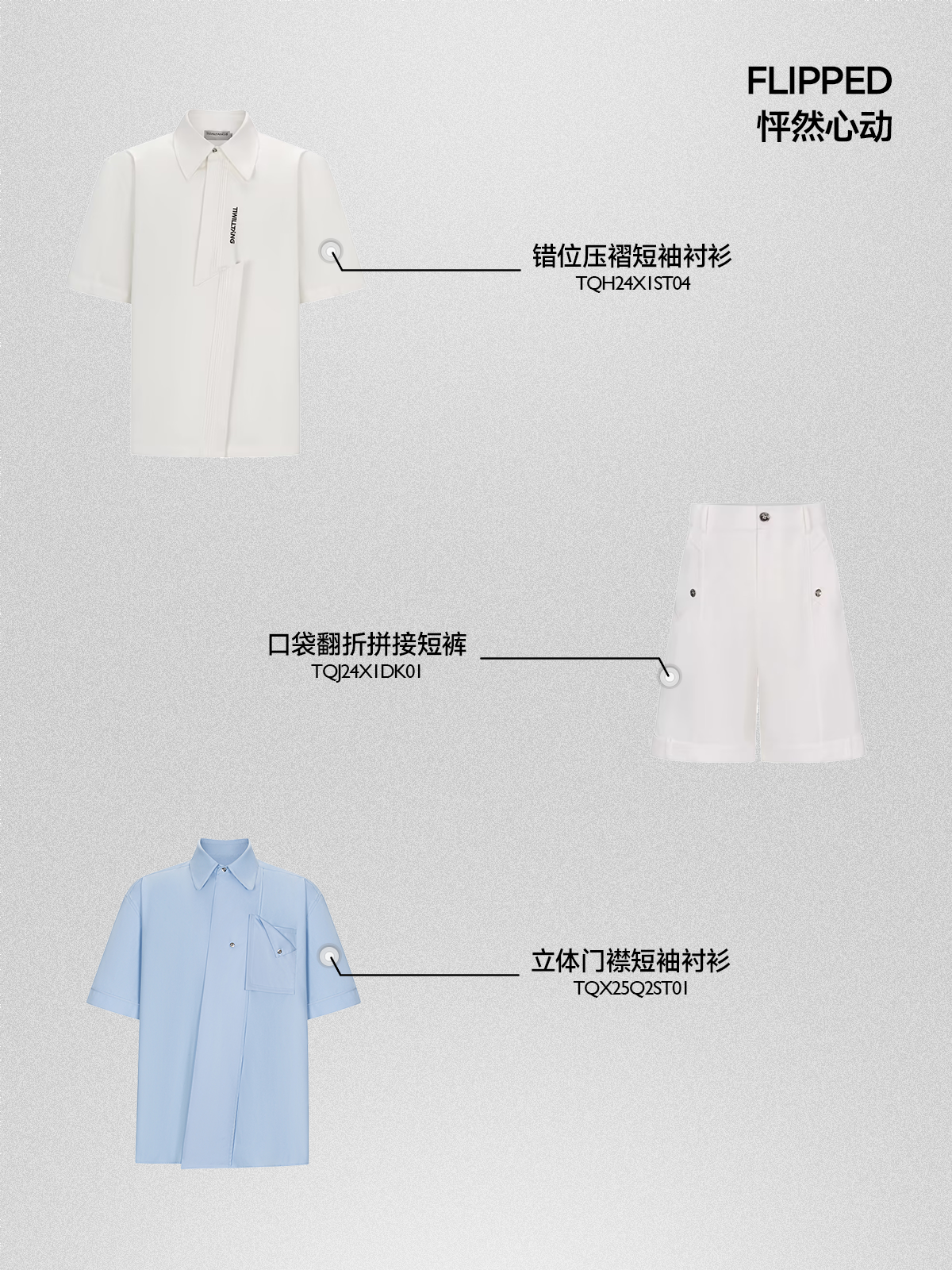 【七夕专属礼盒 | 怦然心动】启世录:白色错位压褶短袖衬衫+白色口袋翻折短裤+蓝色立体门襟短袖衬衫