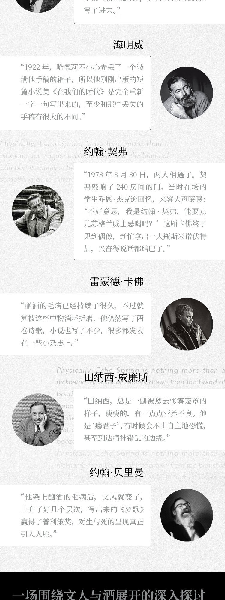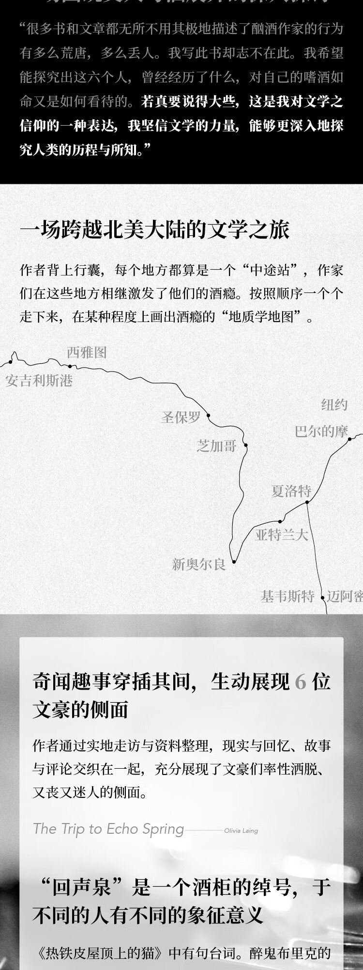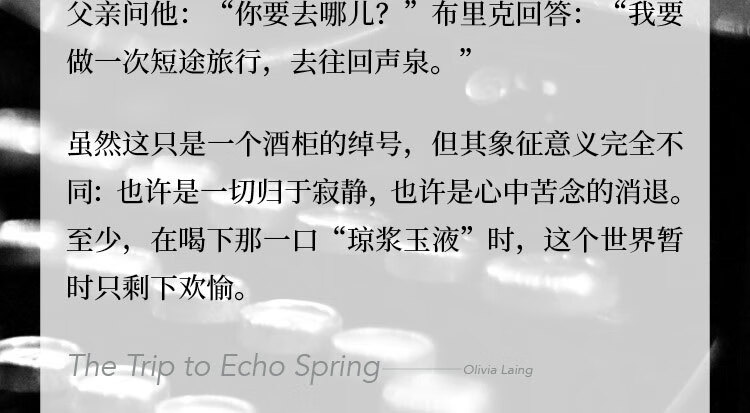 《沿河行》《孤独的城市》作者奥利维娅·莱恩又一力作。讲述六位文人与酒的故事:菲茨杰拉德、海明威、田纳西·威廉斯、约翰·契弗、约翰·贝里曼和雷蒙德·卡佛。作者踏上旅途,实地探访酒鬼作家们的足迹,经过纽约、新奥尔良和基韦斯特,再到安吉利斯港,带我们探寻在这六位作家传奇的一生中,酒与灵感的密切关系。
