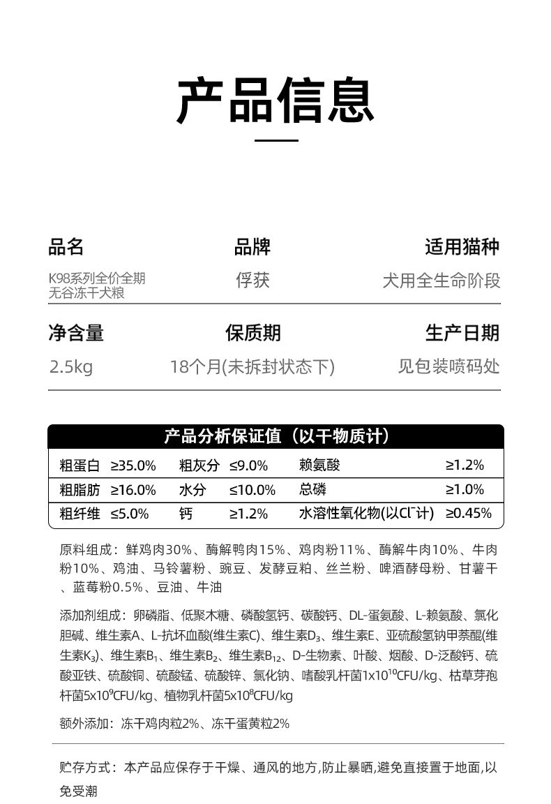 【余额抵扣】俘获升级款无谷K98冻干全价狗粮