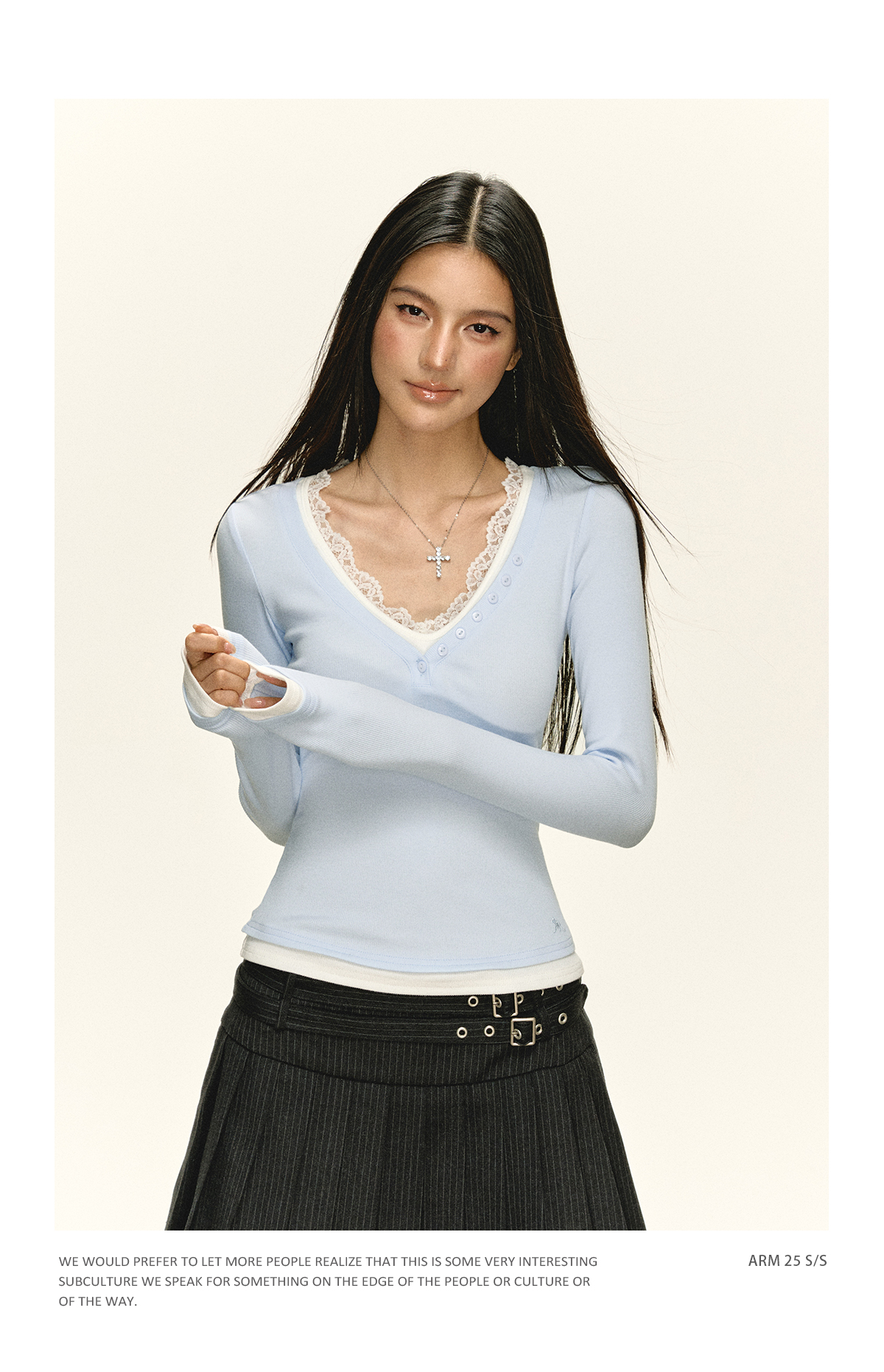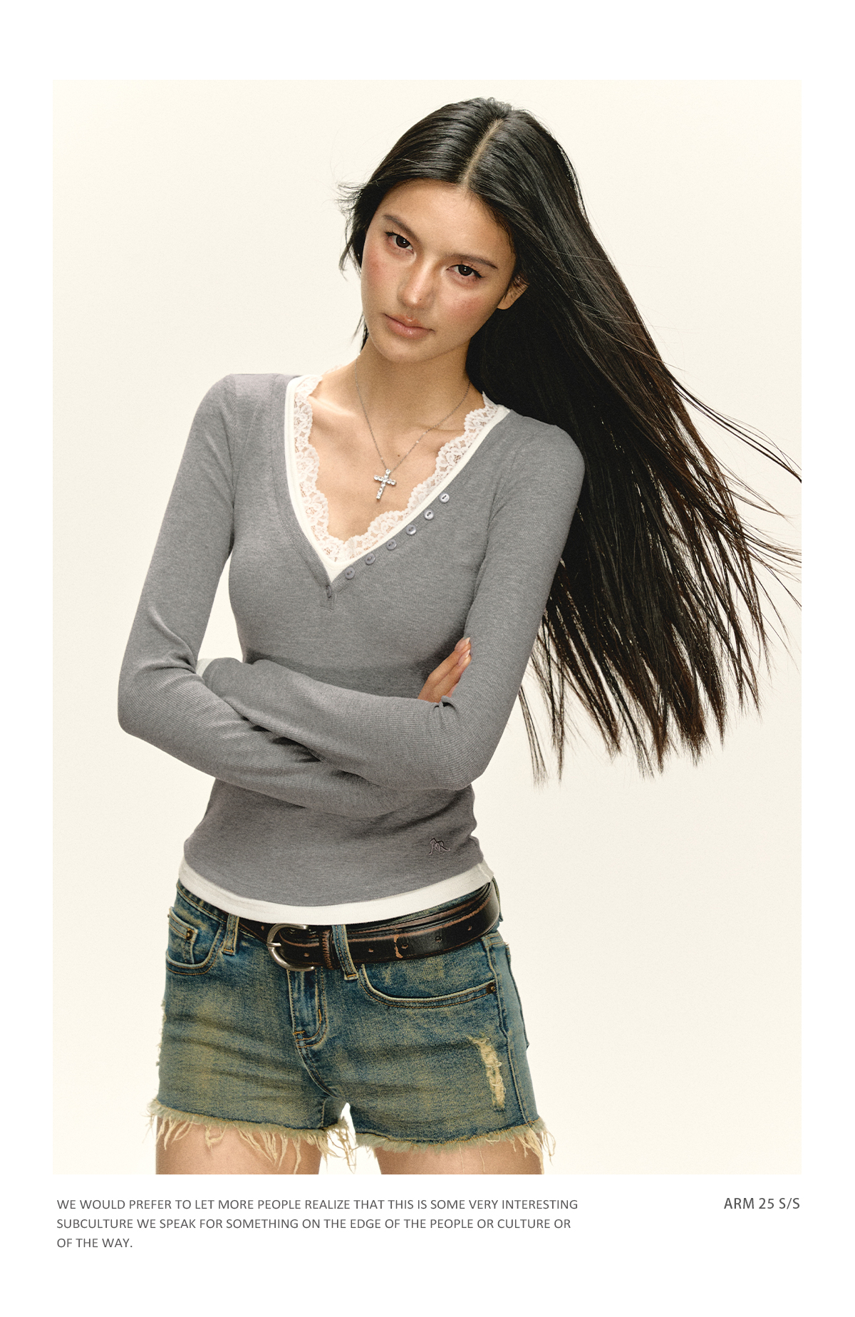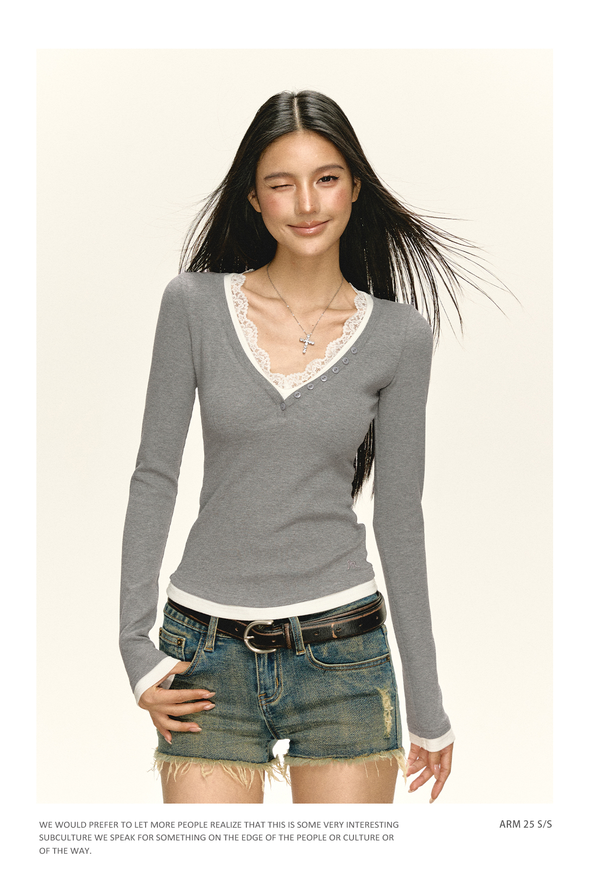 Ariseism 美式复古拼接蕾丝花边长袖T恤女秋季新款修身上衣