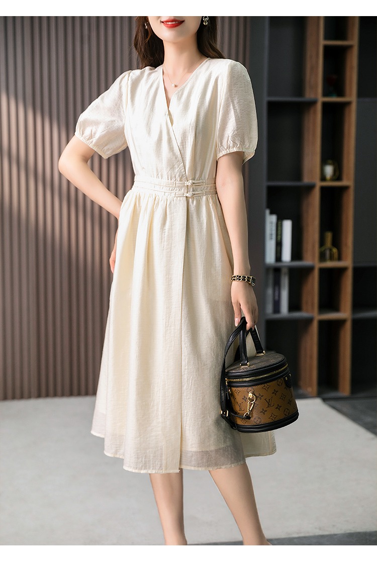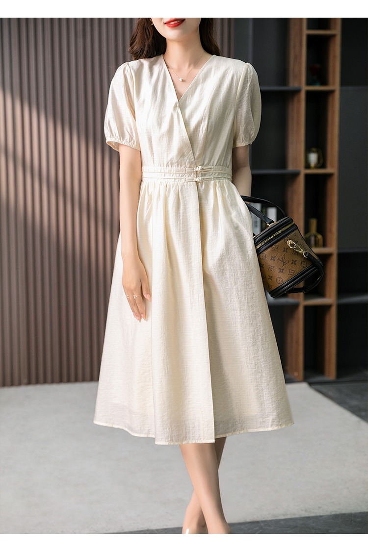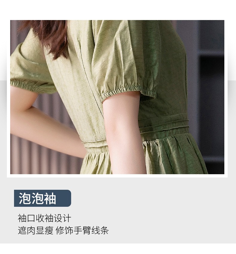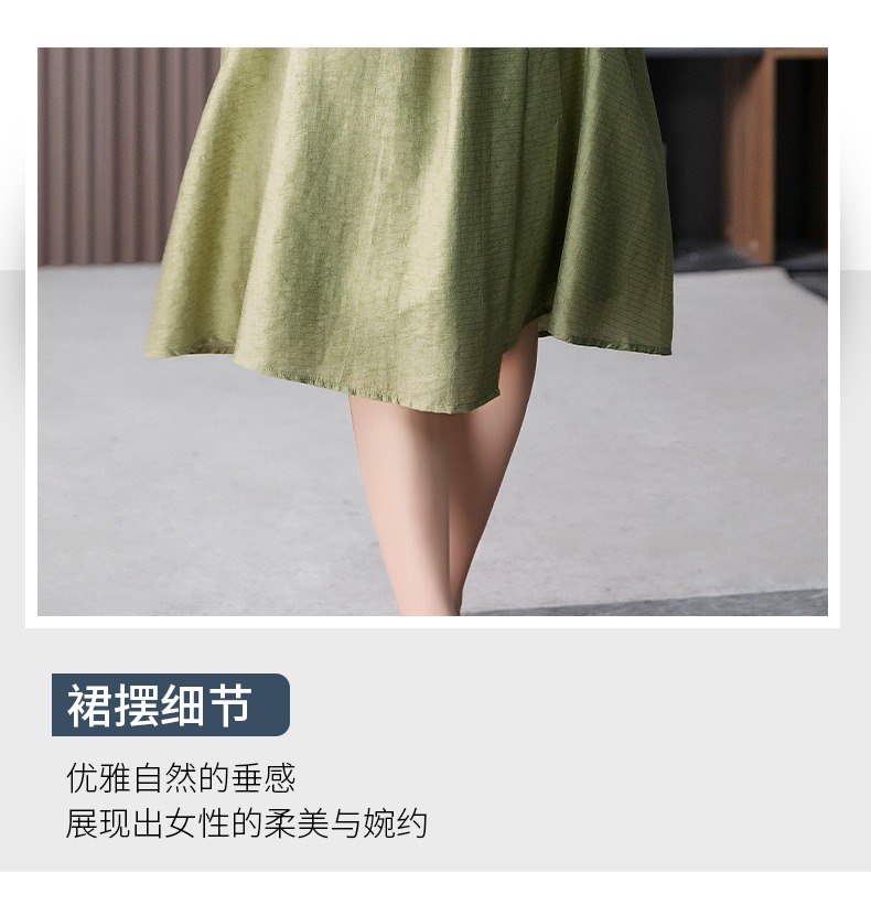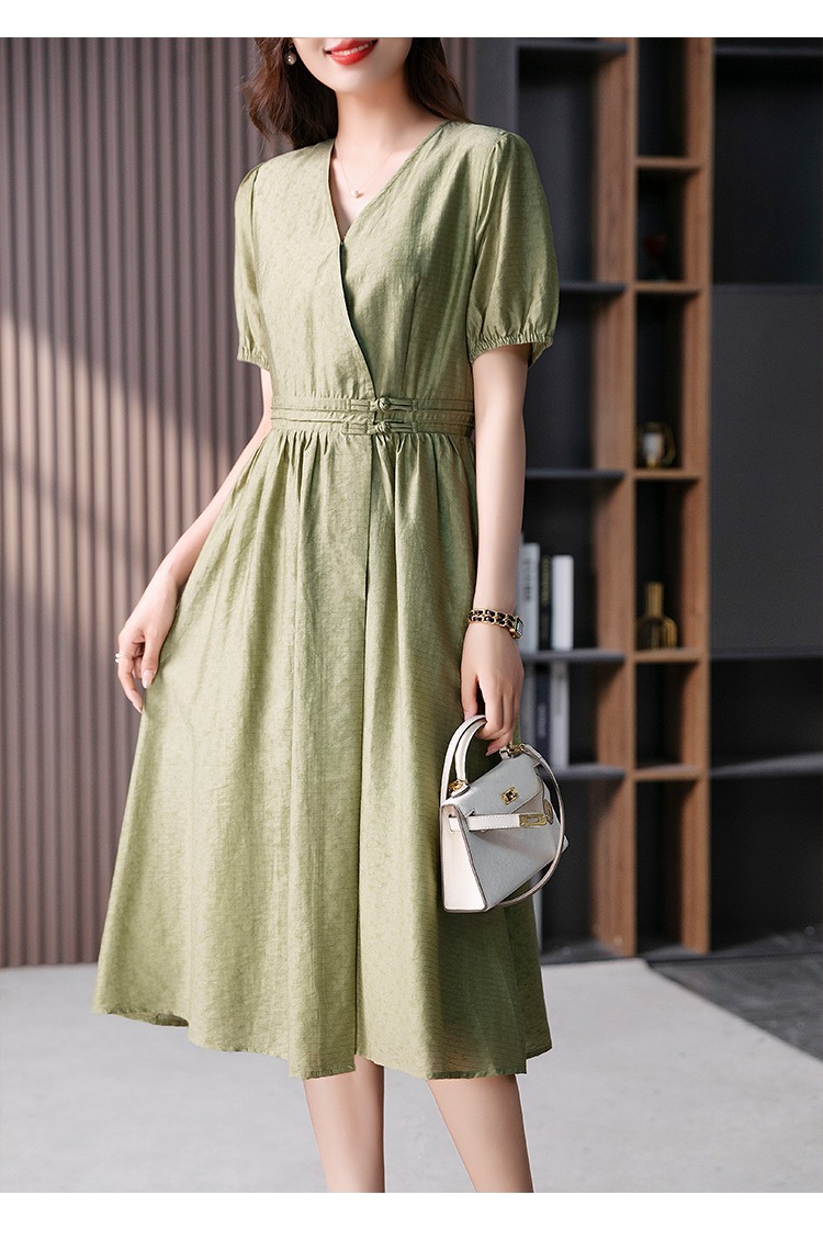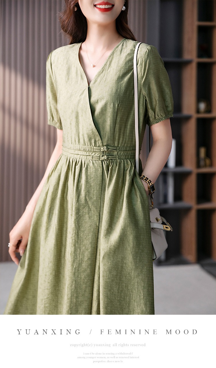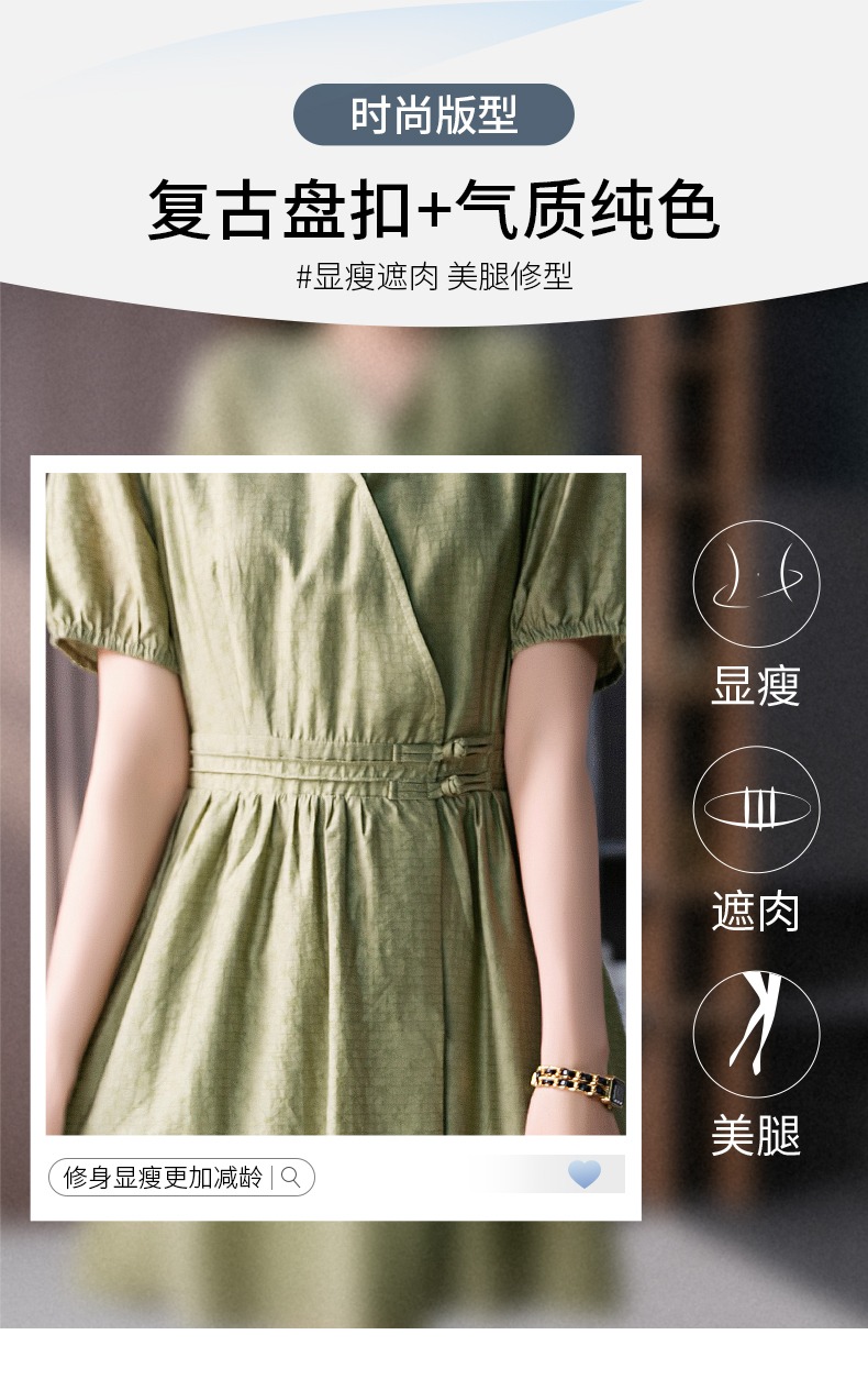 YX【定制15天】FSW天丝短袖连衣裙泡泡袖复古盘扣收腰A字裙
