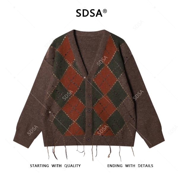 91289SDSA男士秋冬新款痞帅男装潮牌复古菱形格V领针织衫流苏开衫毛衣