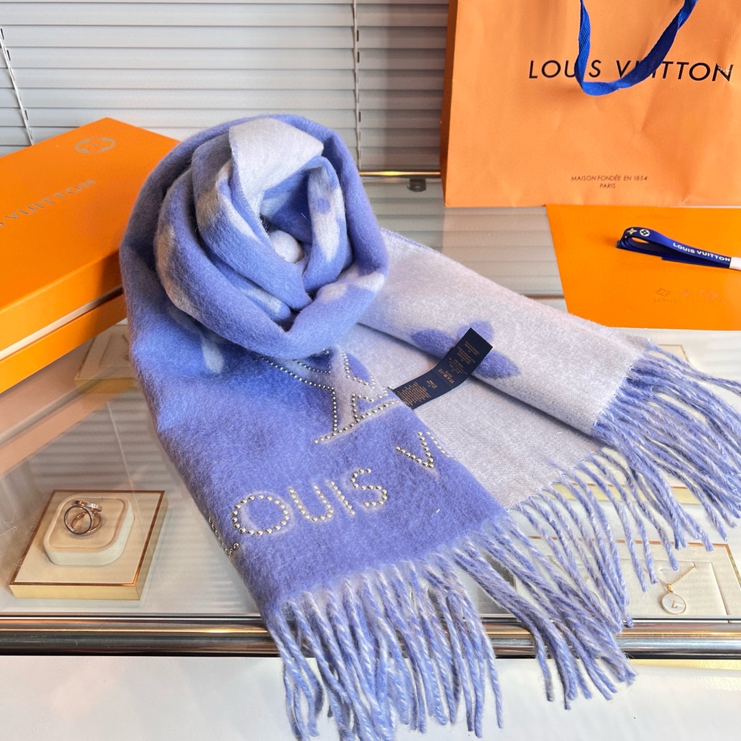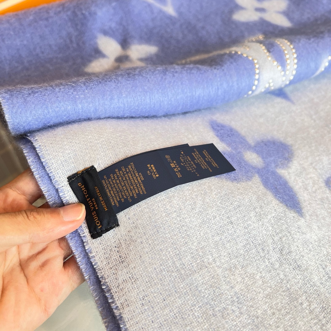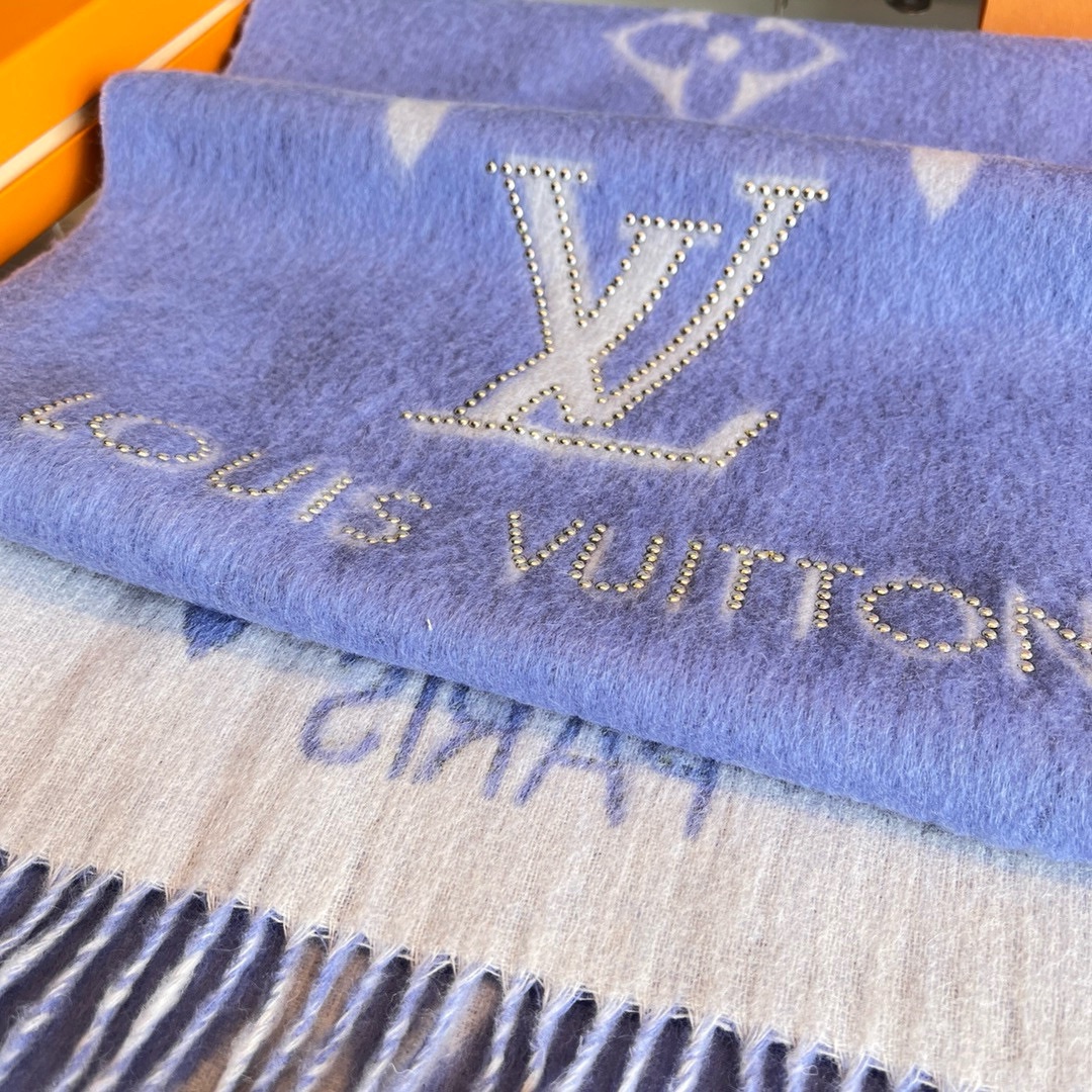 官网同步新款原单【雷克雅维克铆钉版]此款 Studdy R**kjavik 围巾融入了摇滚元素,为寒冷冬日带来摇滚韵律。柔软的羊绒面料上饰有大号Monogram Flowers 和LV 首字母织纹,搭配抛光饰钉装饰,质感轻盈,是理想的旅行伴侣Monogram Flowers 和 LV 首字母提花织纹背景,金色金属饰钉,底端饰有对比色路易威登英文字样,尺寸:170x45cm