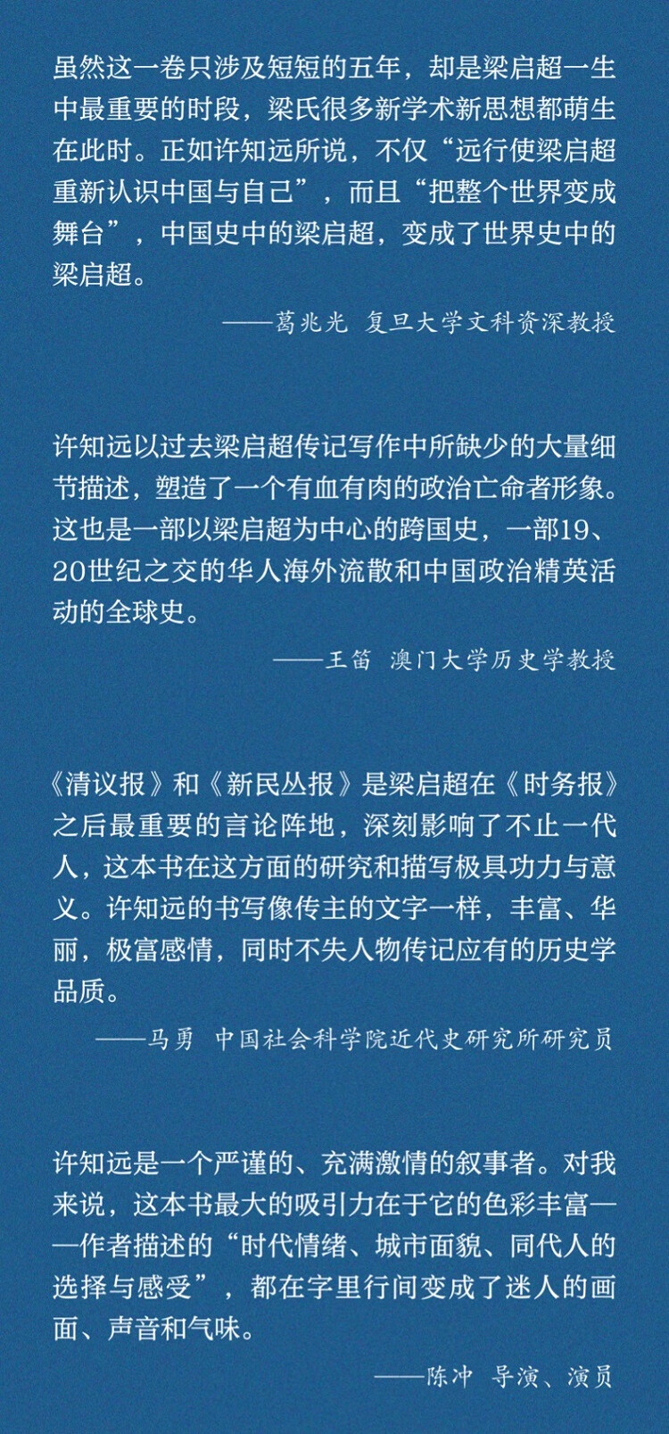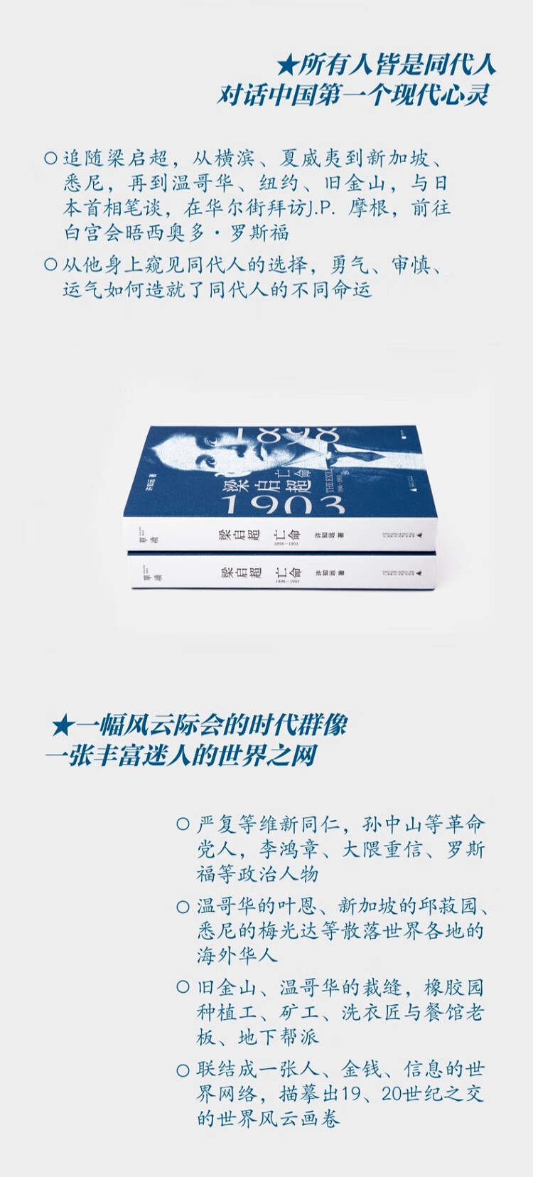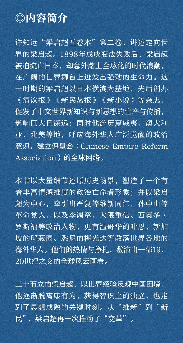 梁启超的广阔交游,串联起国内的维新同仁和江湖会党,日本的亚洲主义者和中国留学生,以及孙中山的革命力量;他的世界旅行,联结起散落各地的华人,织成一张人、金钱、信息的世界网络。透过梁启超,可以看到一个更广大的世界,和一个更广大的中国。