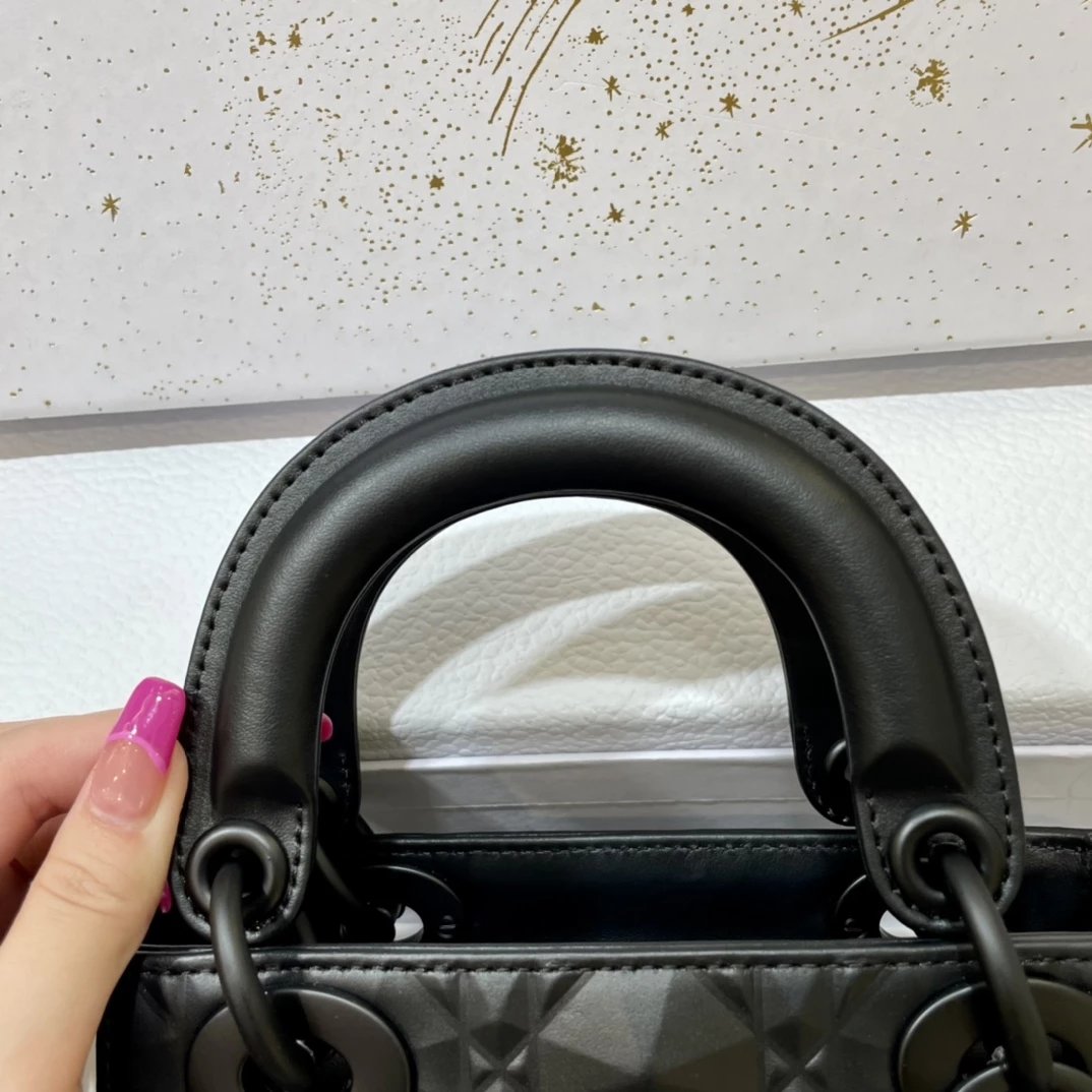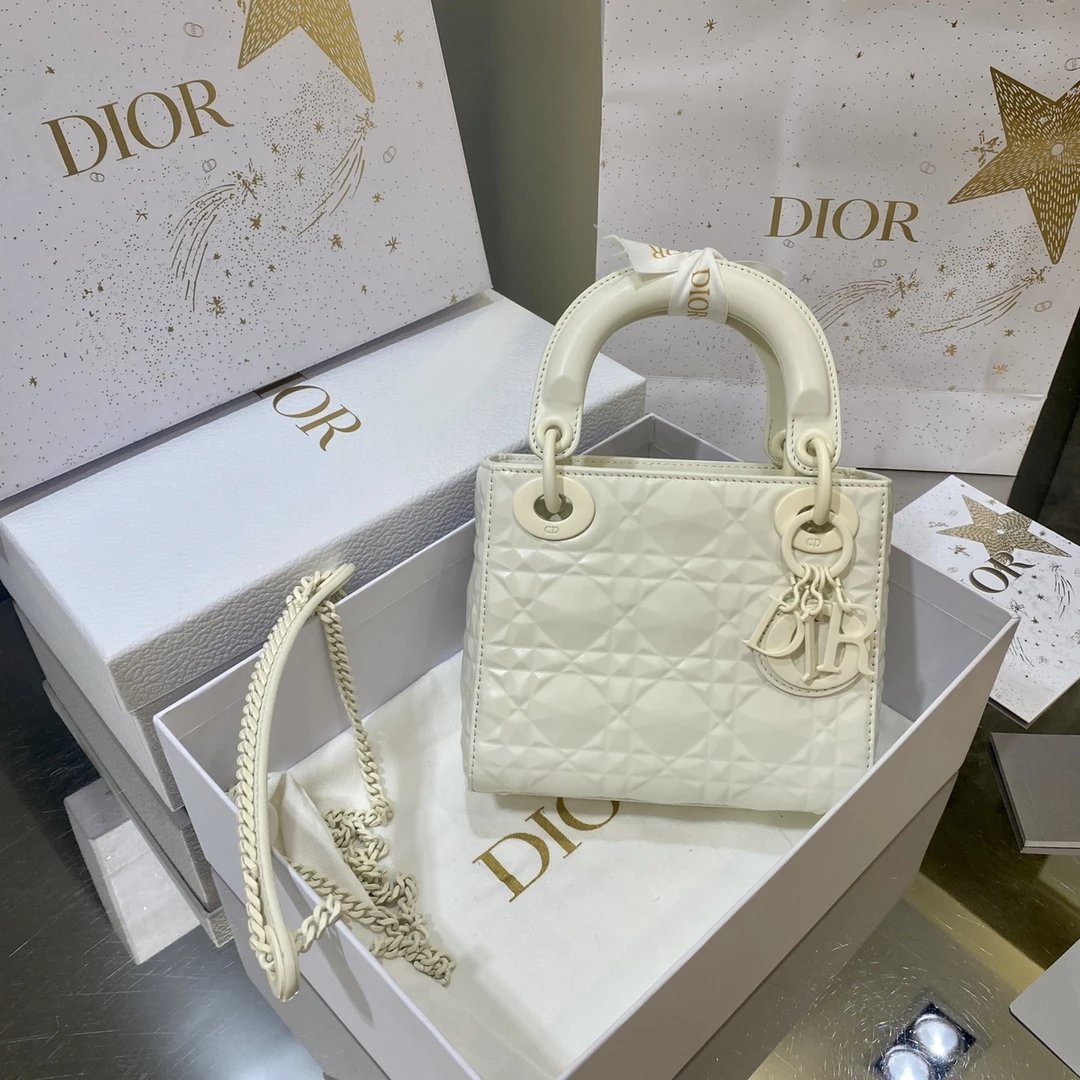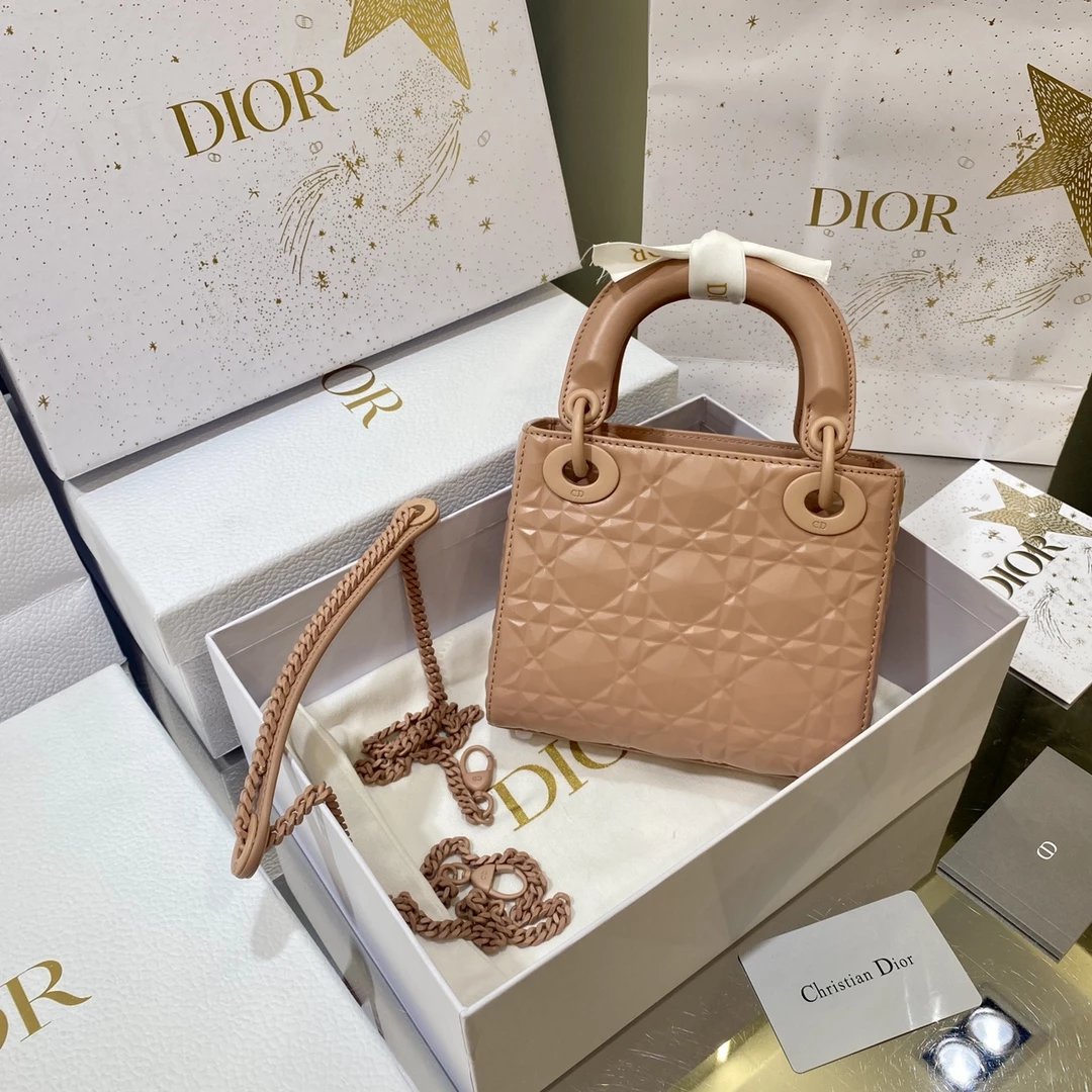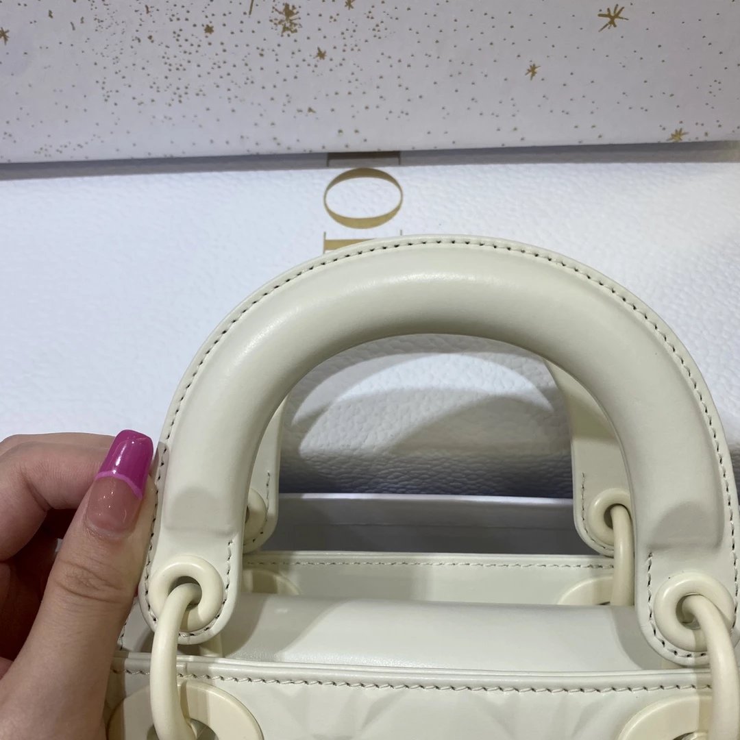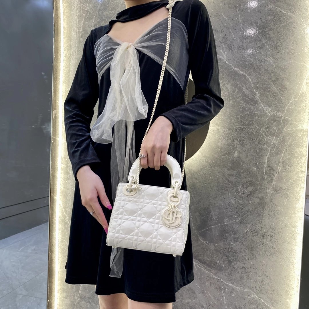 Dio.r lady 钻石藤格纹到货 采用全钢进口五金Lady 系列高雅经典的款式,采用钻石藤格纹缉面线羊皮革精心制作,迷你款式,搭配可拆卸的链条肩带,可手提、肩背或斜挎?尺寸:17 CM