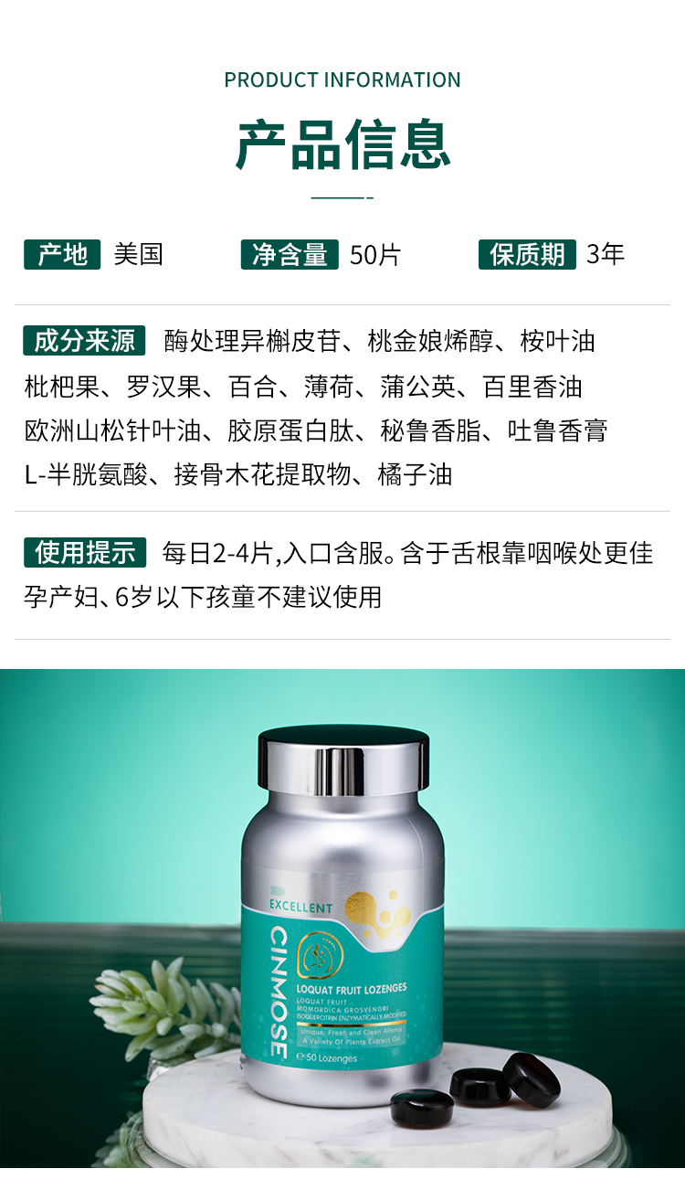【品名】美国Cinmose辛莫斯 咽肺宝糖果 去咳化痰 【规格】50颗/瓶(125g) 【产地】美国 【保质期】3年 【发货包装】独立包装盒 【发货地】河南 【发货快递】中通,圆通 【不发货区域】港澳台 【补邮费地区】新疆,西藏+15元 【发货时效】48-72小时,周末节假日顺延 |