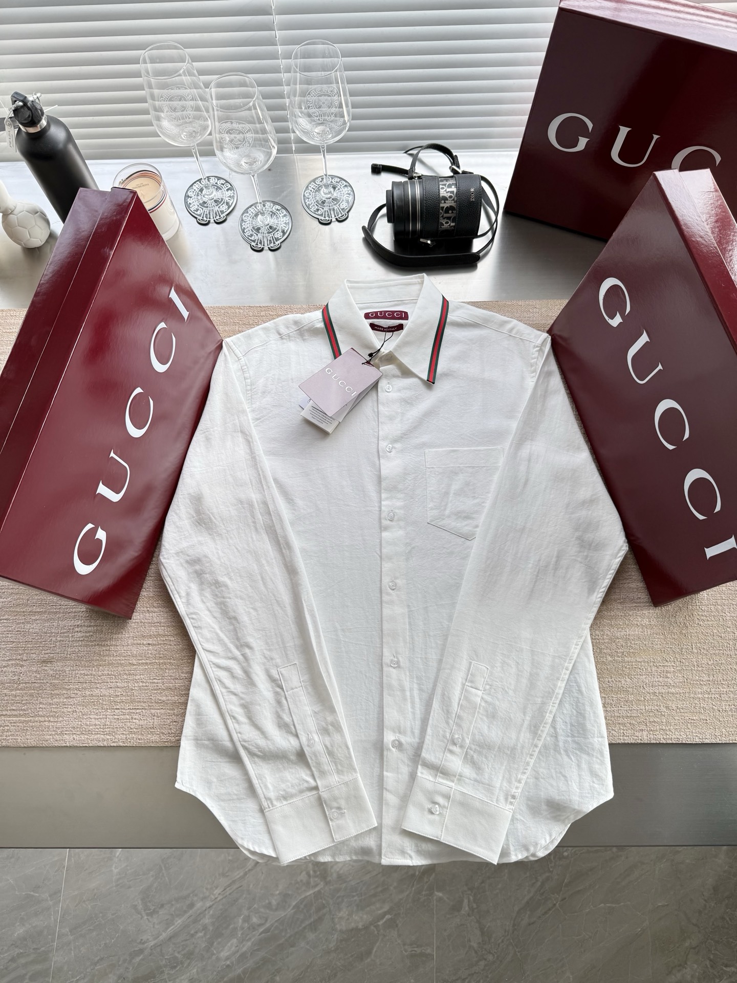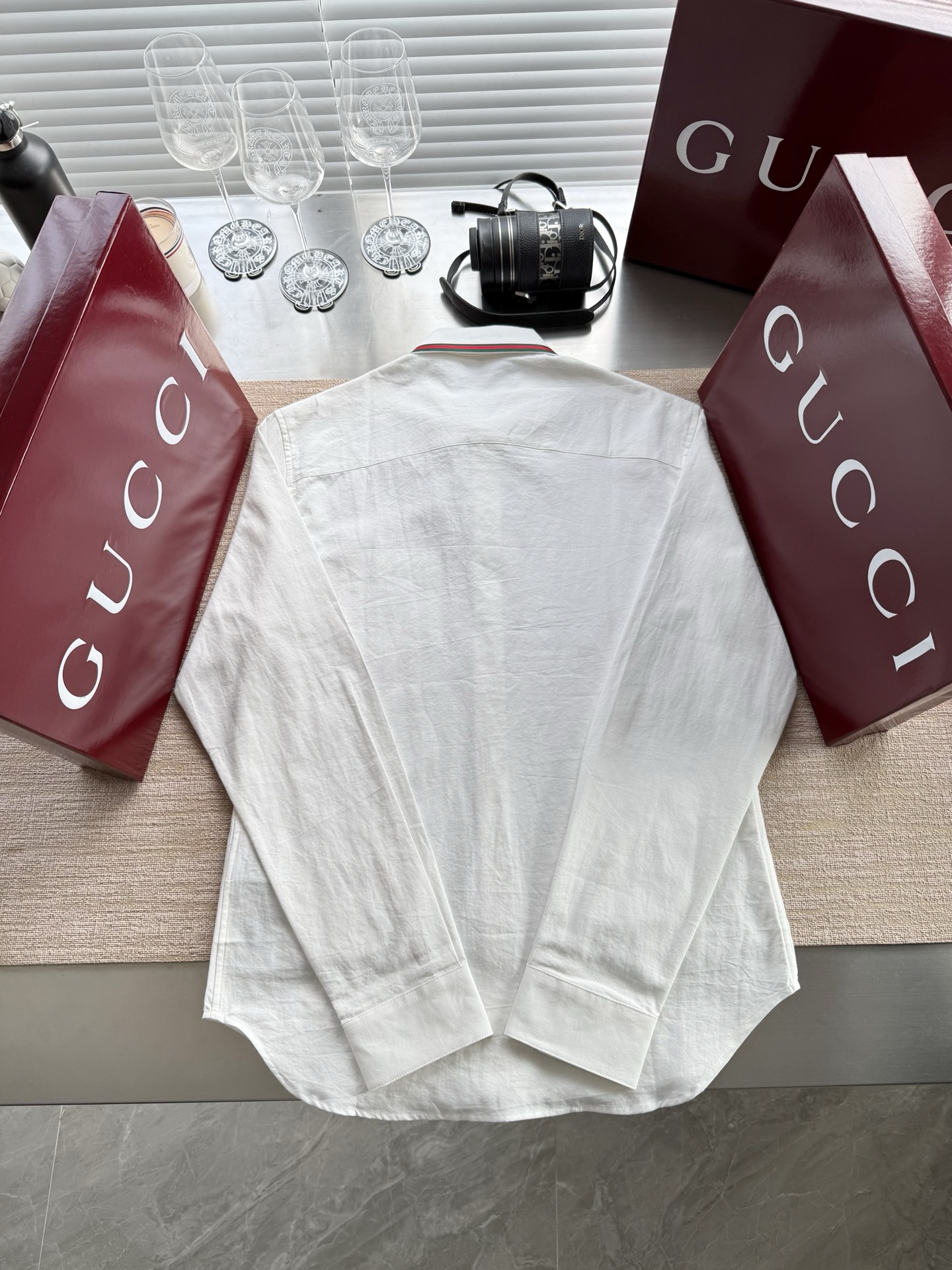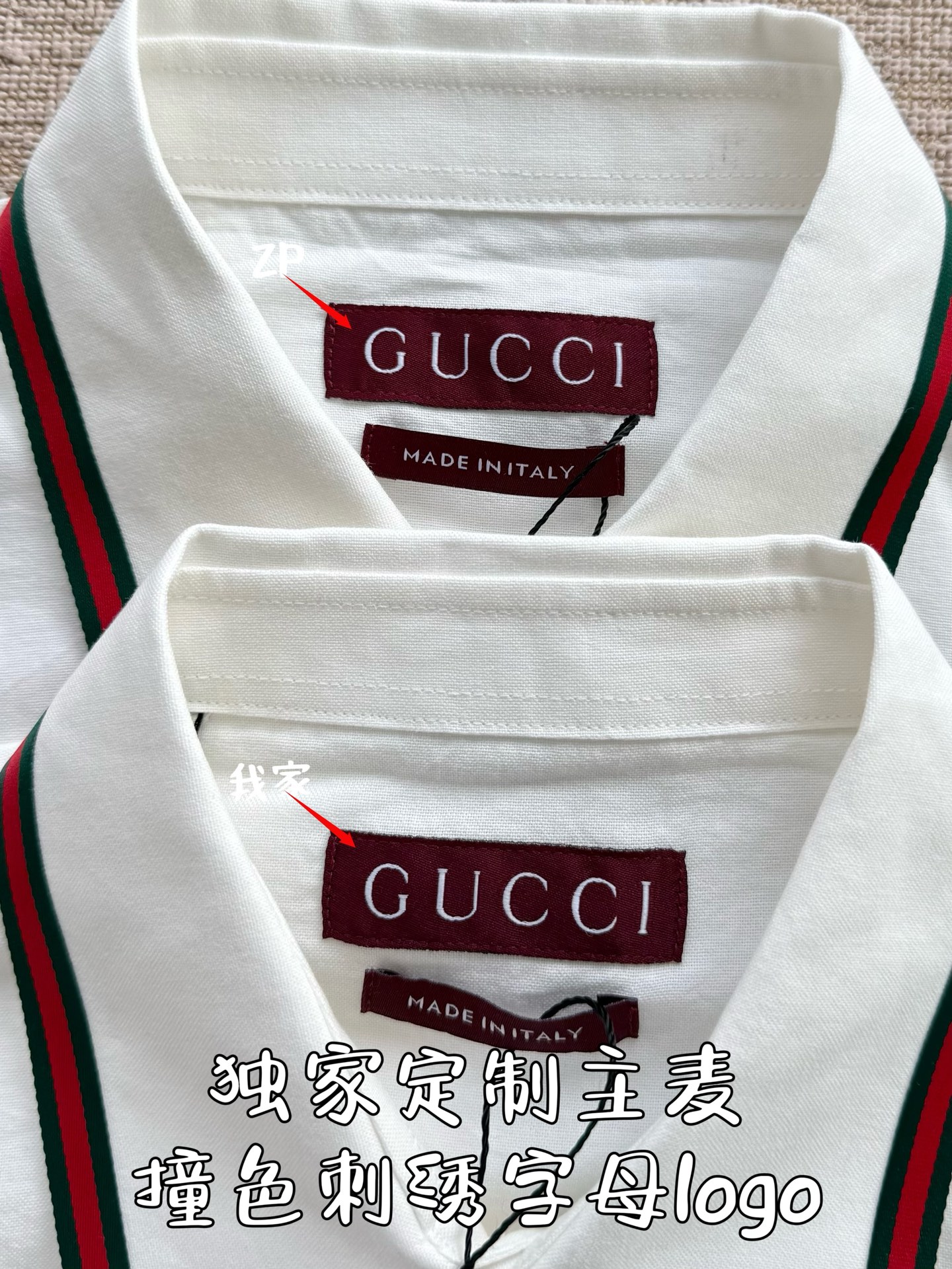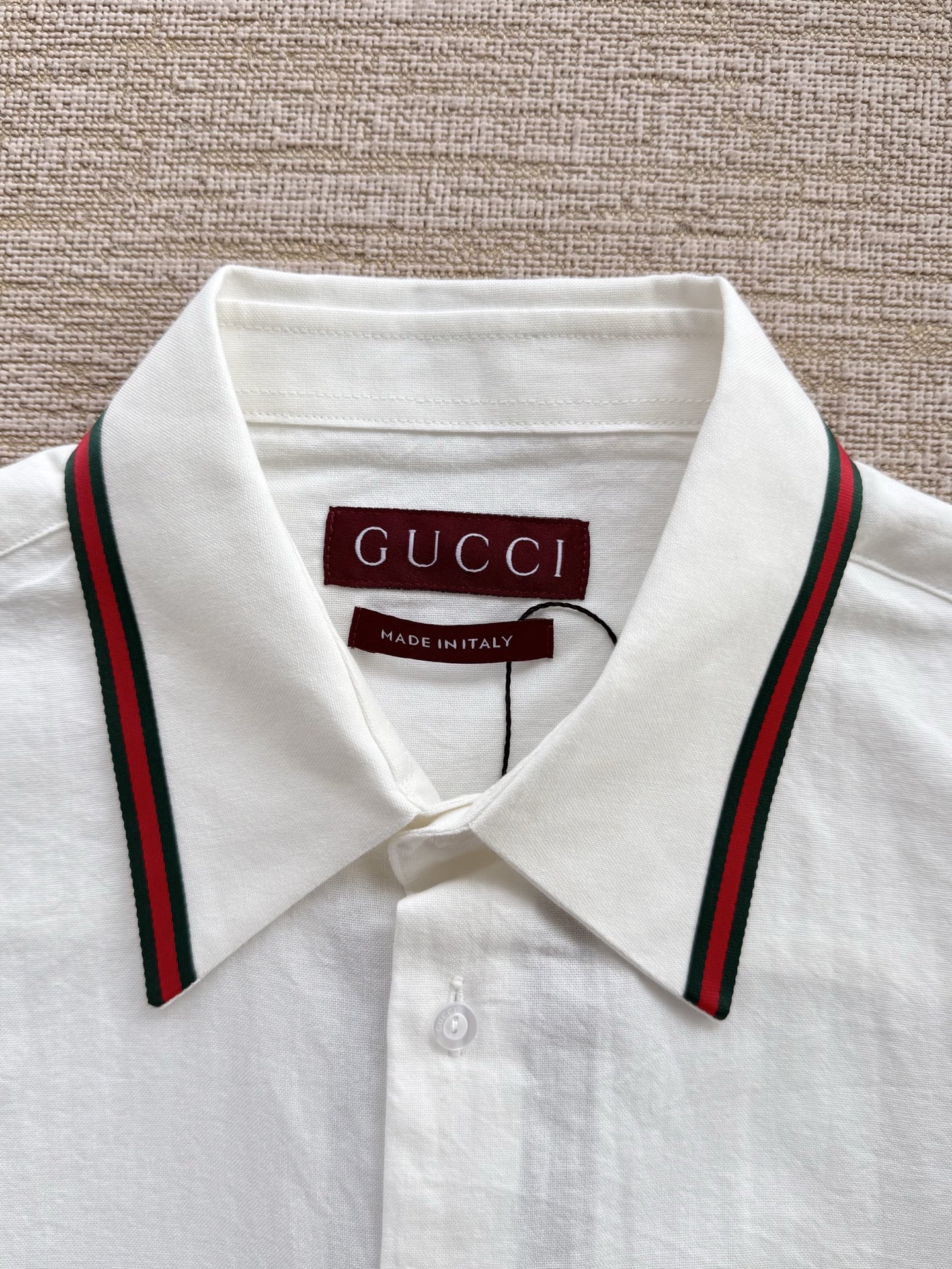 Gucci 2025 FW衣领经典条纹长袖衬衫‼️整件衣服7200购买Zp拆解打造,定制白色牛津棉面料,做到100%全棉进口纱线,定制标志性Polo领,饰以绿红绿经典织带,胸前饰以贴袋,门襟开模定制字母logo珍珠母贝纽扣,真正做到1:1copy 闭眼入