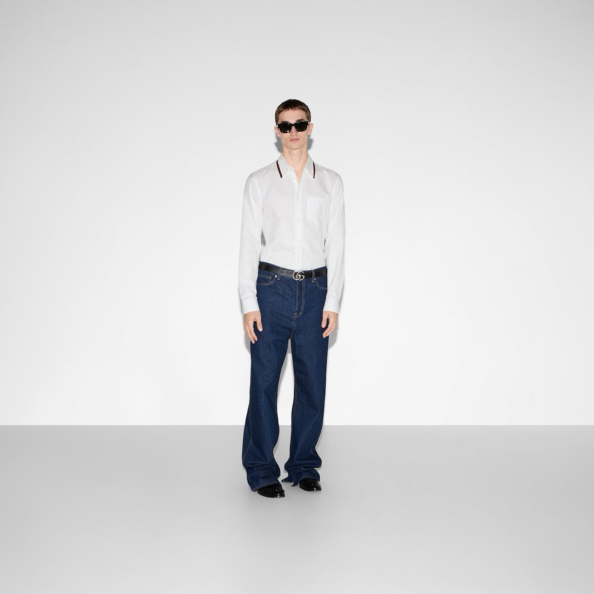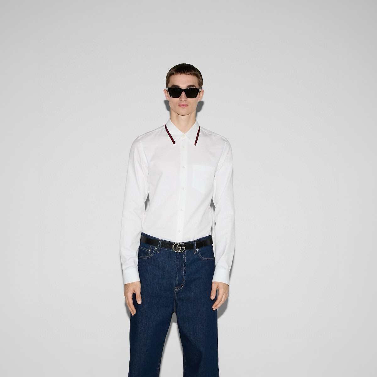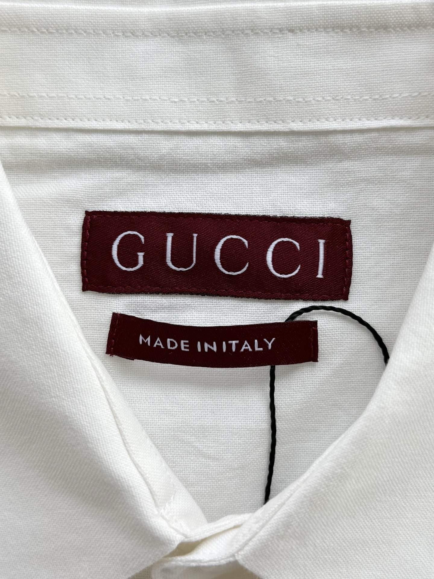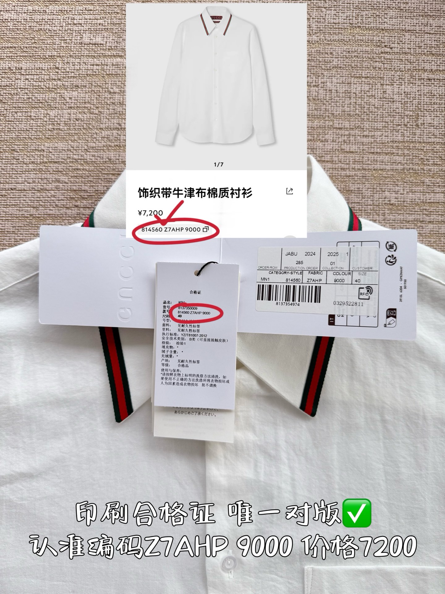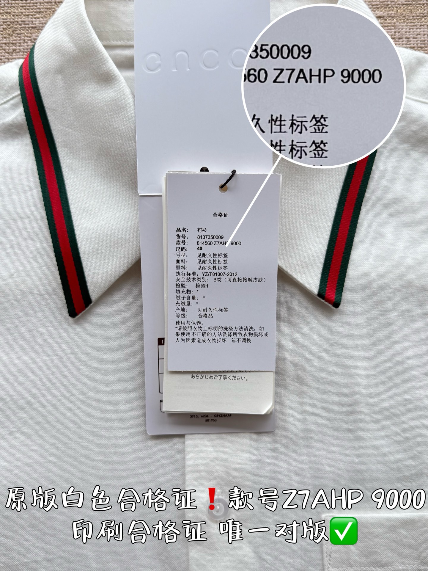 Gucci 2025 FW衣领经典条纹长袖衬衫‼️整件衣服7200购买Zp拆解打造,定制白色牛津棉面料,做到100%全棉进口纱线,定制标志性Polo领,饰以绿红绿经典织带,胸前饰以贴袋,门襟开模定制字母logo珍珠母贝纽扣,真正做到1:1copy 闭眼入