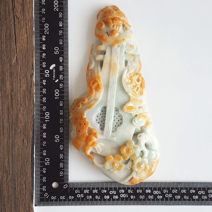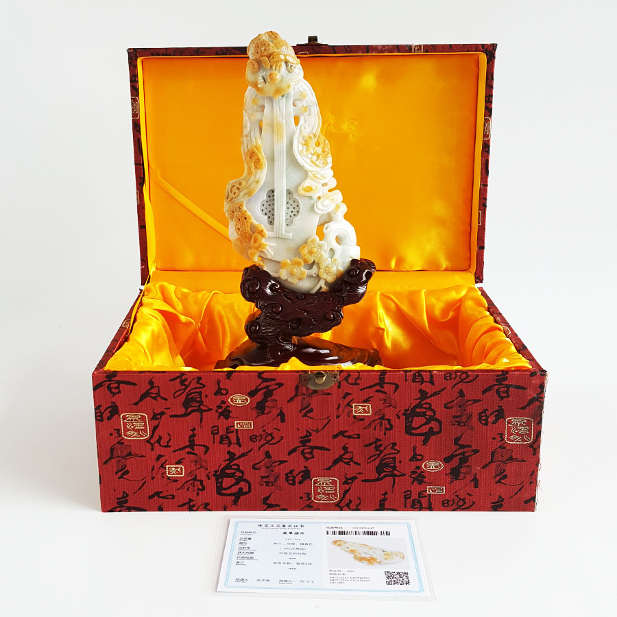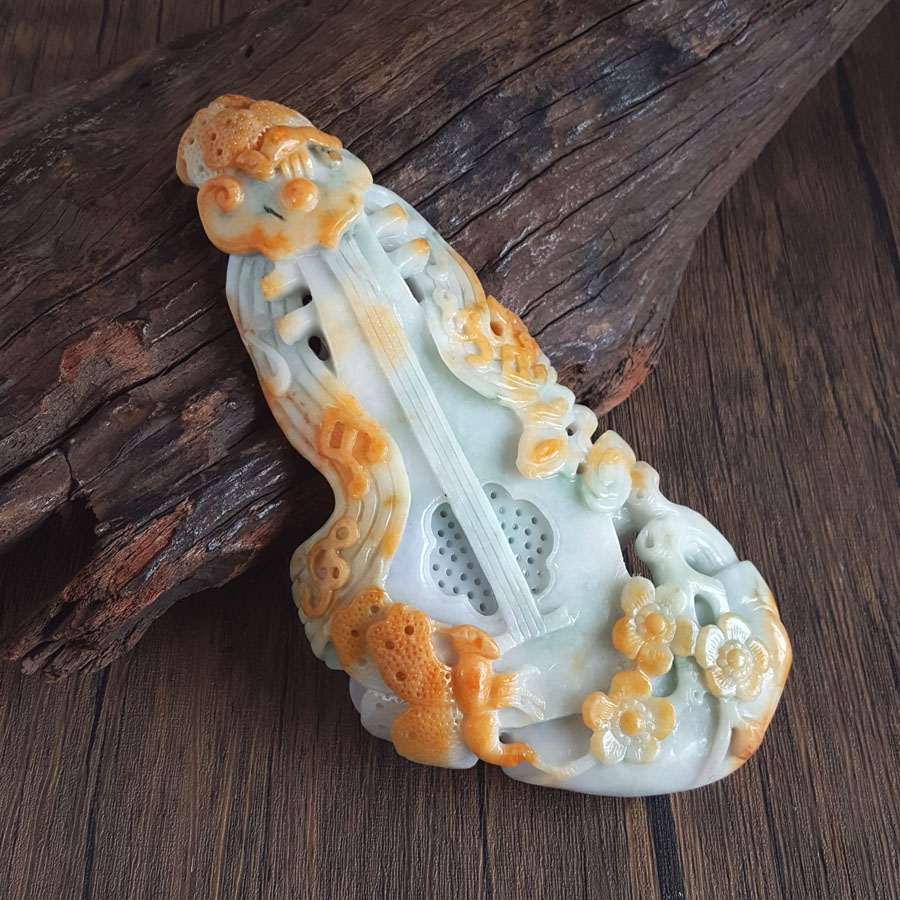 名称 | 天然细腻细豆种福禄寿琴瑟生花(幸福美满)翡翠配木架摆件 |