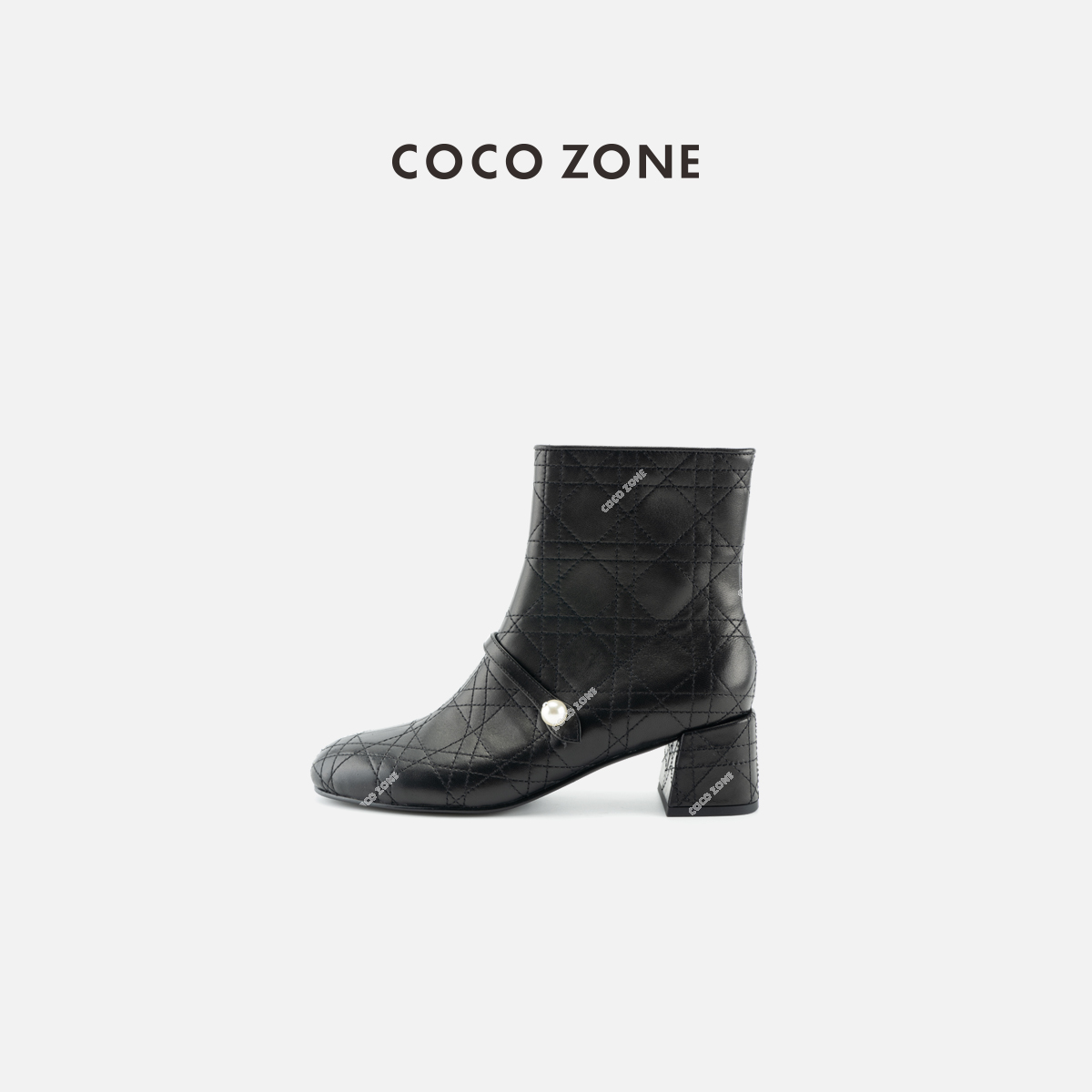 COCO ZONE 复古菱格粗跟短靴设计感侧拉链女靴CC2C2001