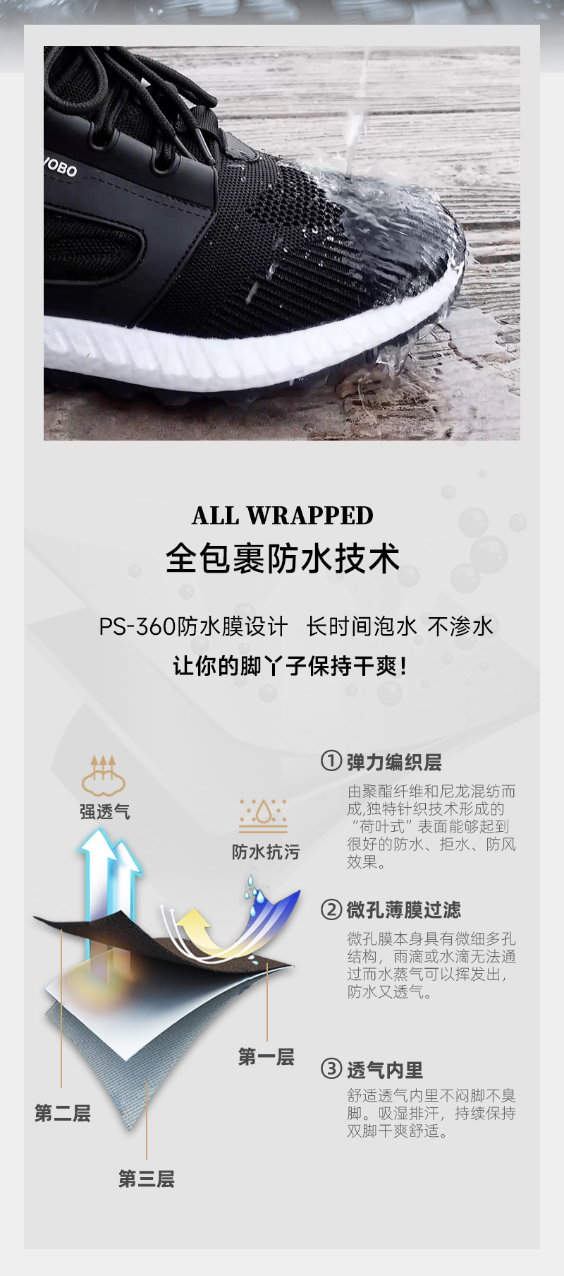 鞋子的防水功能,也是在面料上下足了功夫,面料有三层: