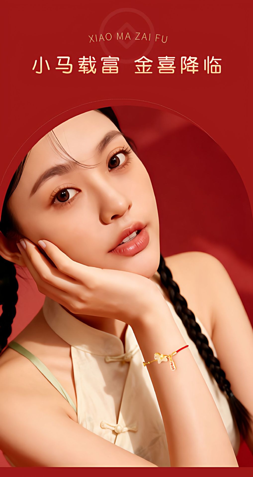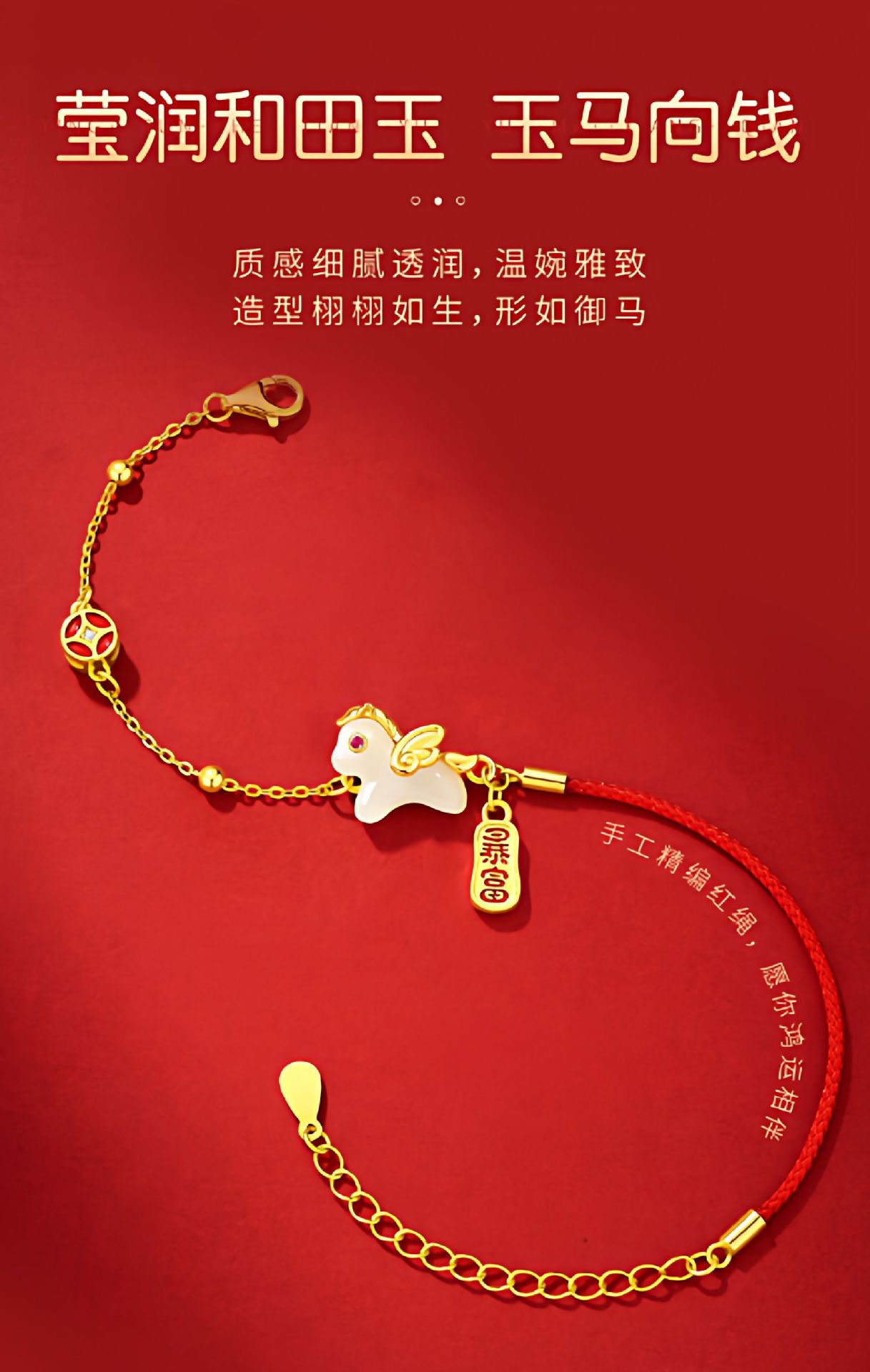 六鑫珠宝 马上有钱S925银暴富小飞马轻奢和田玉本命年手绳 马年礼物