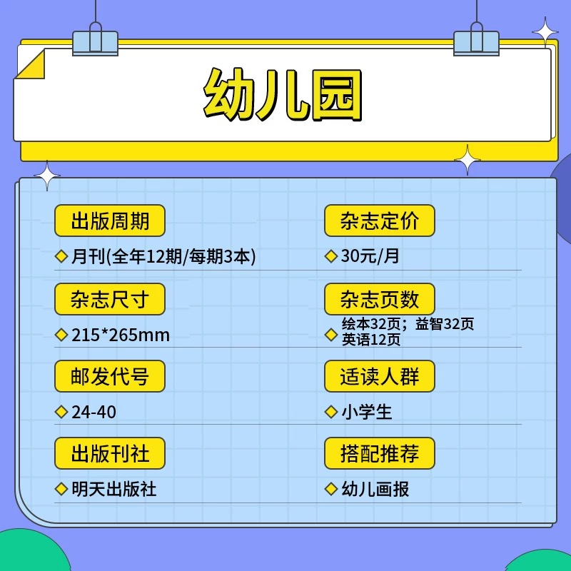 3~7岁 |《幼儿园》杂志 单月/订阅自选 已更新至2025年十一月刊(第11期) 国家新闻出版署推荐优秀报刊 每月绘本表达+益智探索+英语启蒙 共3期 全年36期 明天出版社
