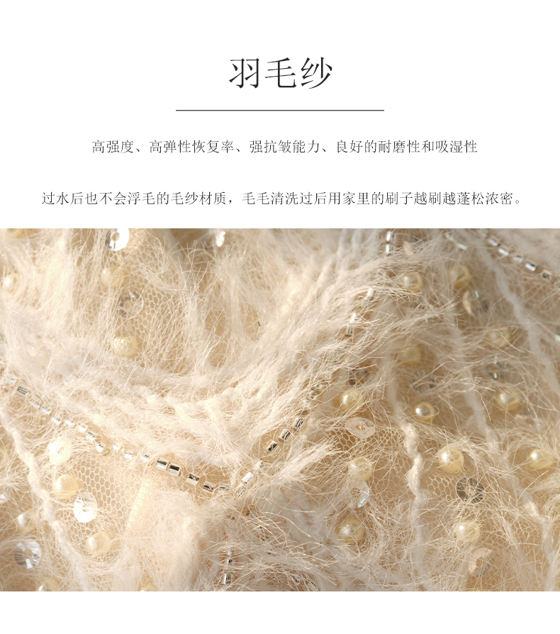 羽毛纱并不是动物毛,属于纺织品类中的真毛。其特点在于高强度、高弹性恢复率、强抗皱能力、良好的耐磨性和吸湿性、防污性,且不易收缩或毡缩,过水后也不会浮毛的毛纱材质,这款上衣的毛毛清洗过后用家里的刷子越刷越蓬松浓密。