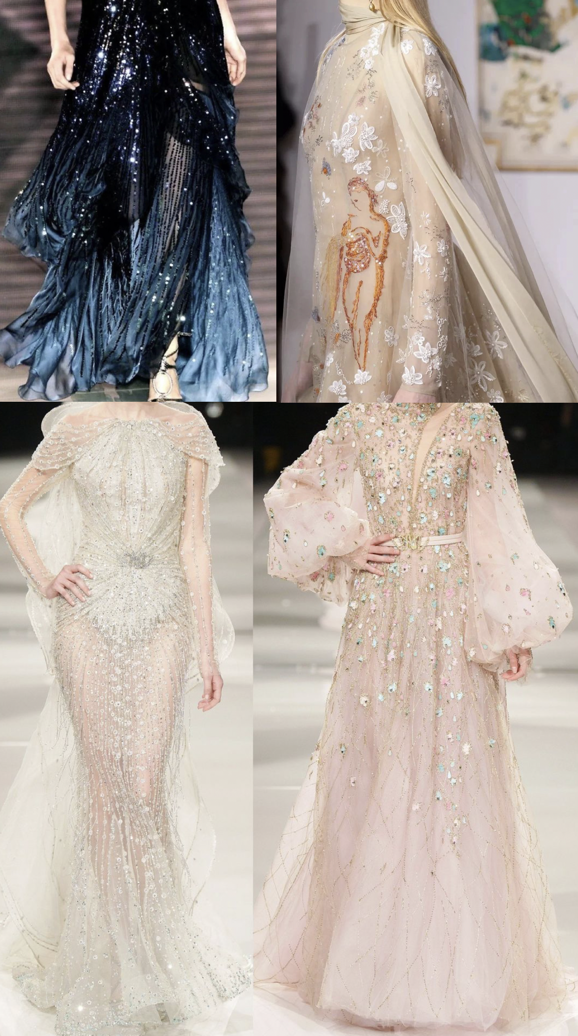 珠绣常用语高定中,点缀精细刺绣、钉珠与亮片,流光溢彩,高级奢华~!