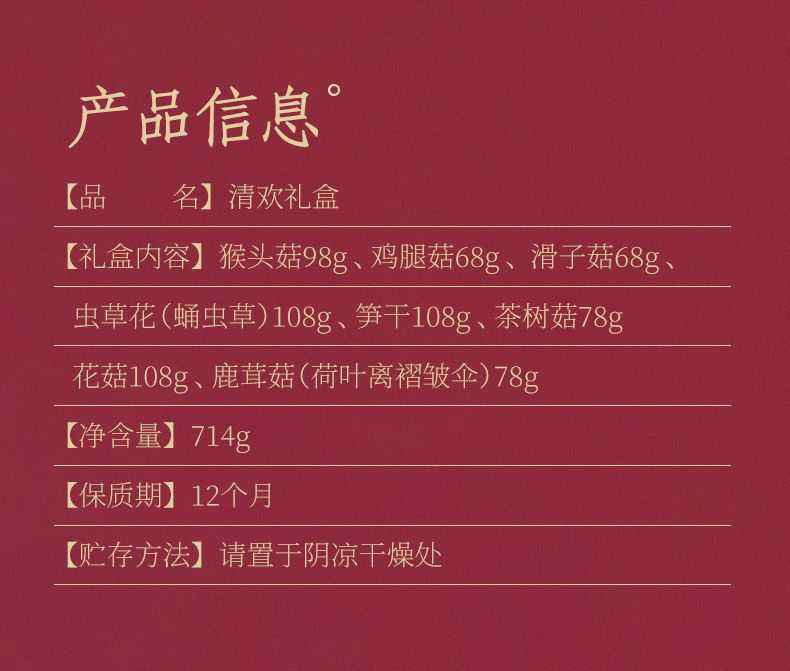 燕之坊清欢礼盒714g 高端干货礼盒 猴头菇 鸡腿菇 滑子菇 虫草花 笋干 茶树菇 花菇 鹿茸菇