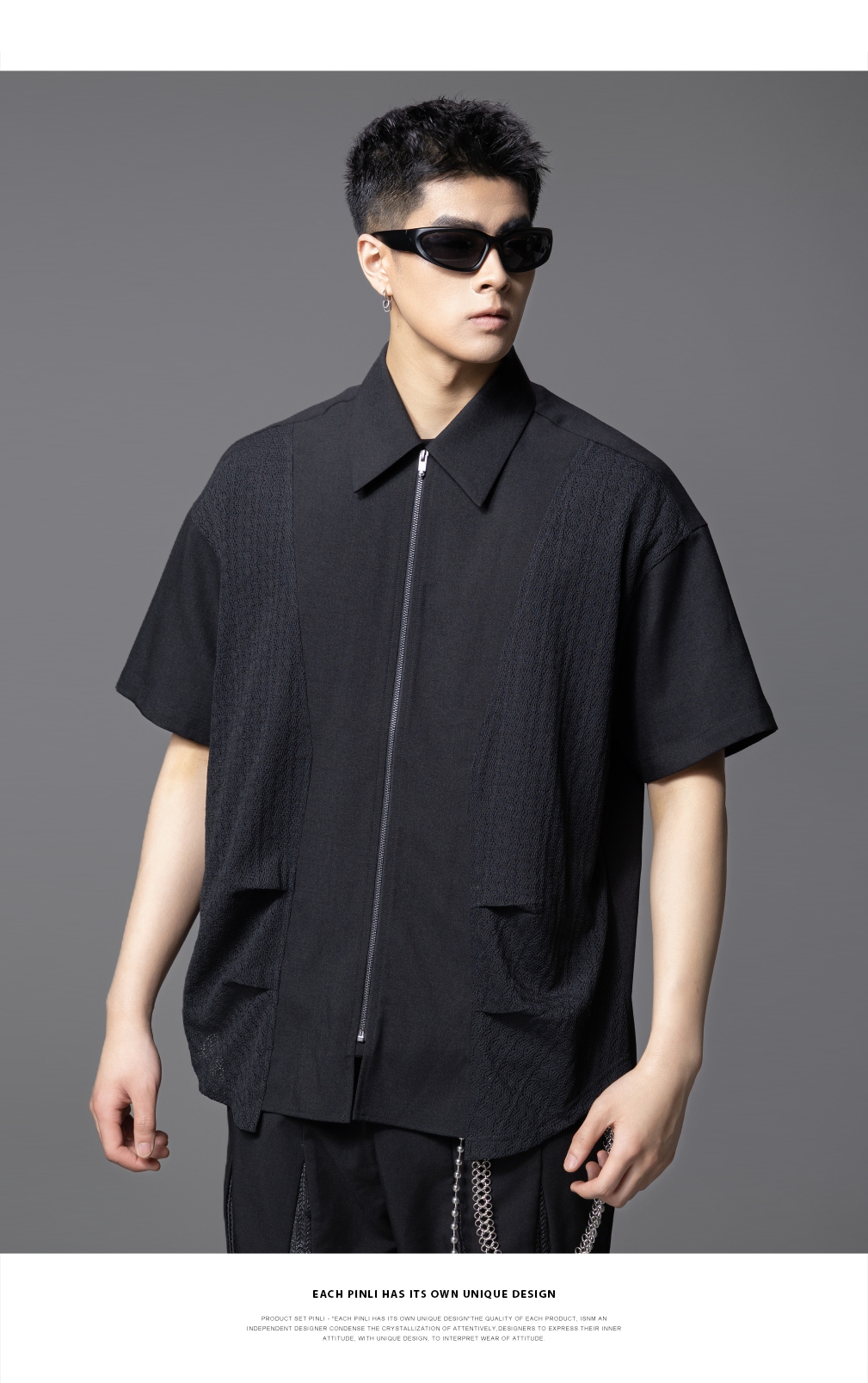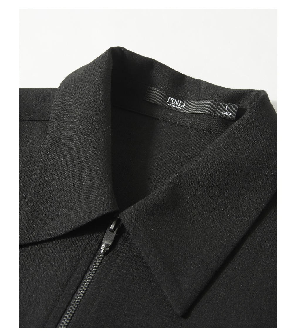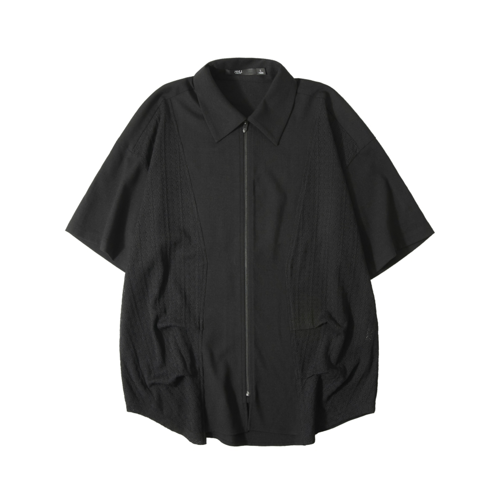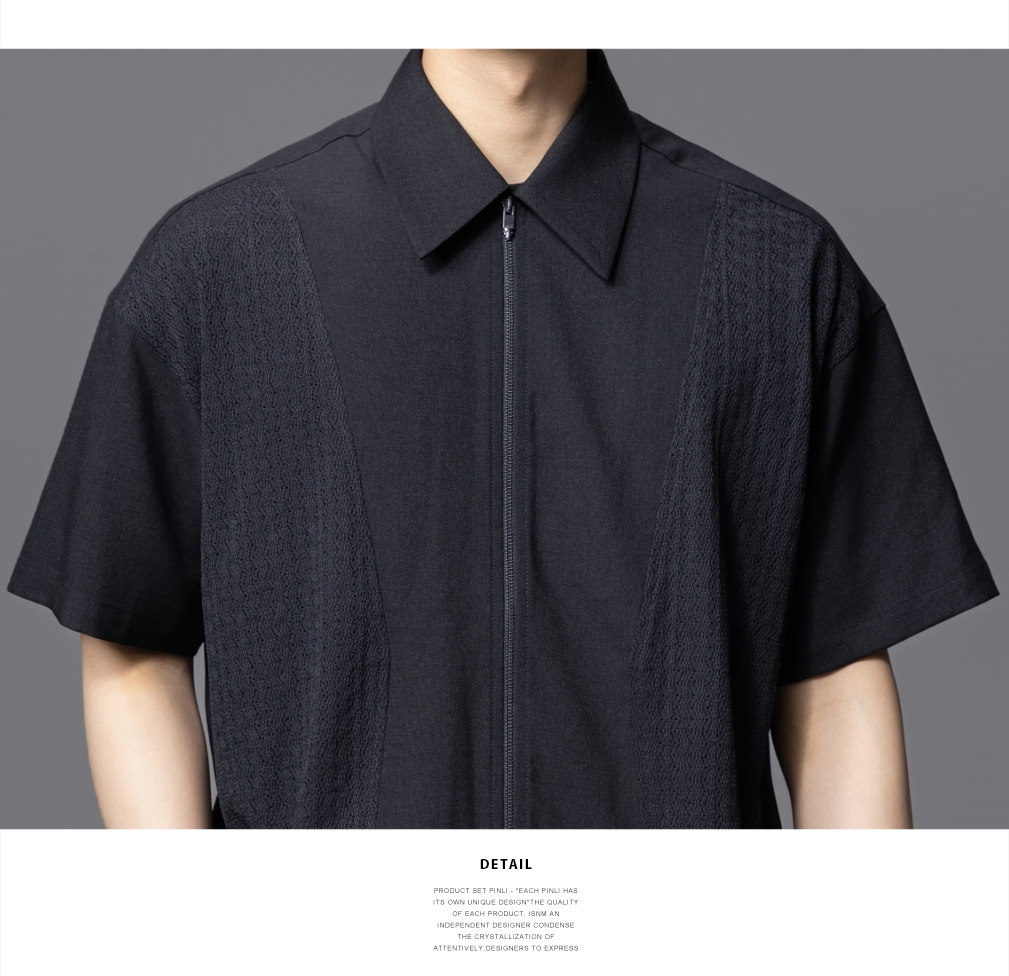 PINLI品立夏季新款设计感拼接短袖衬衫潮牌拉链宽松翻领上衣B252113039