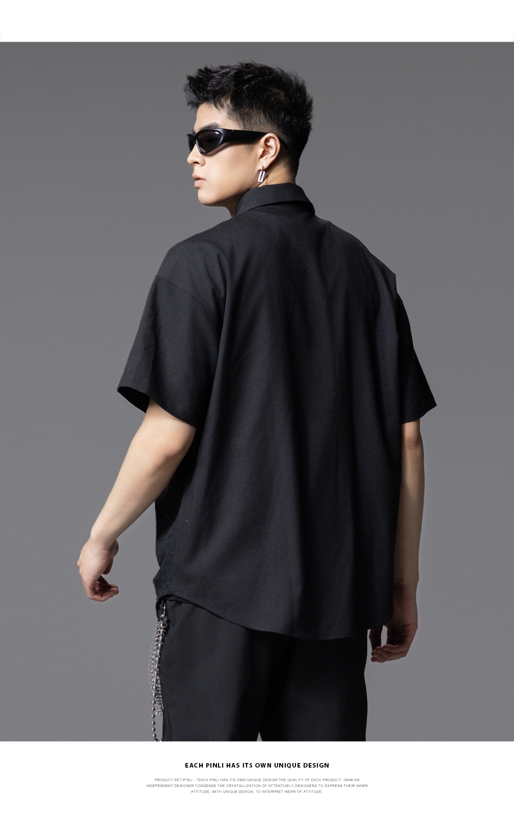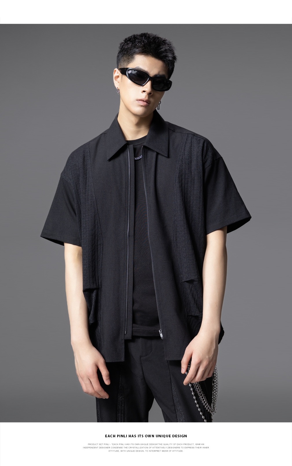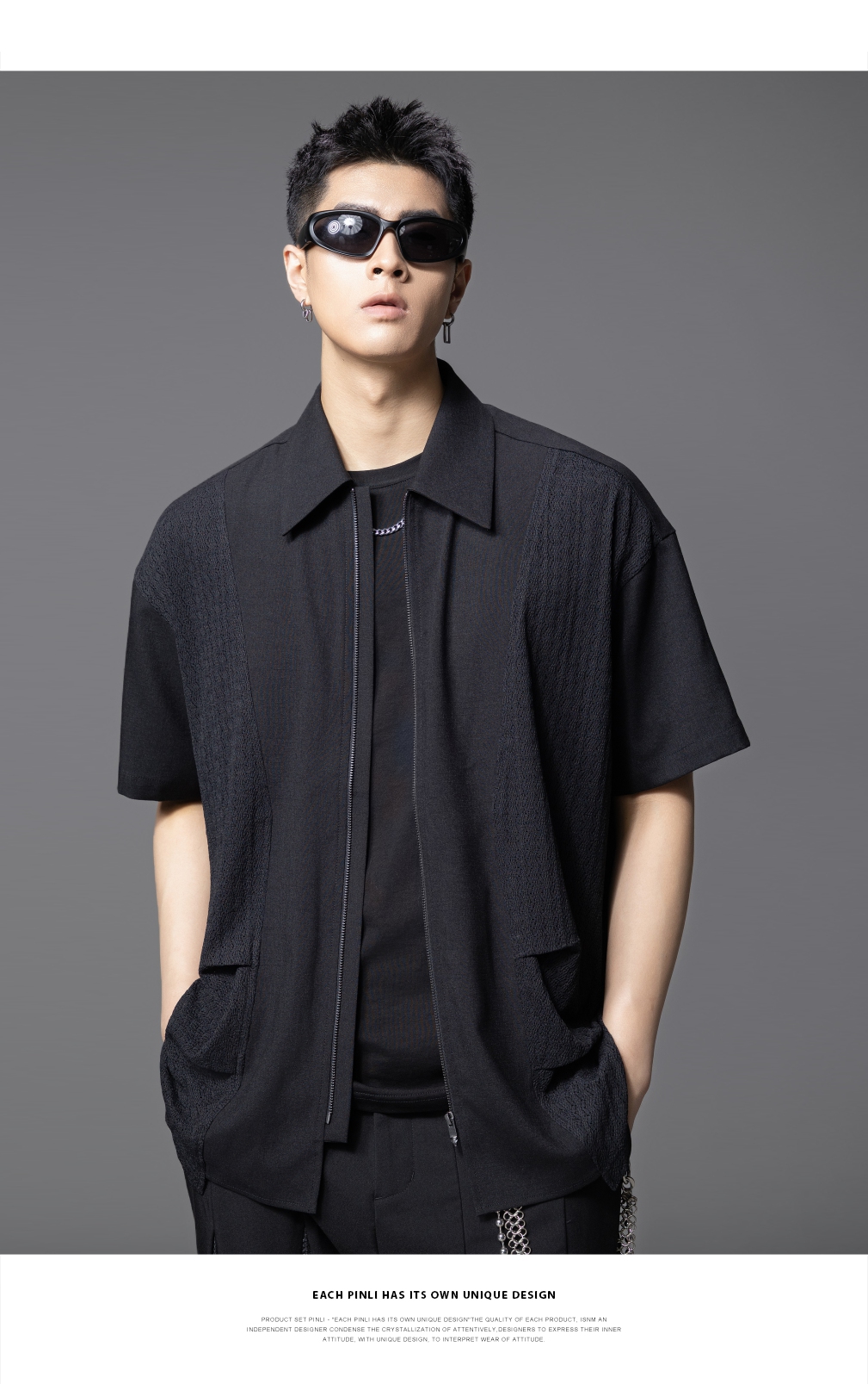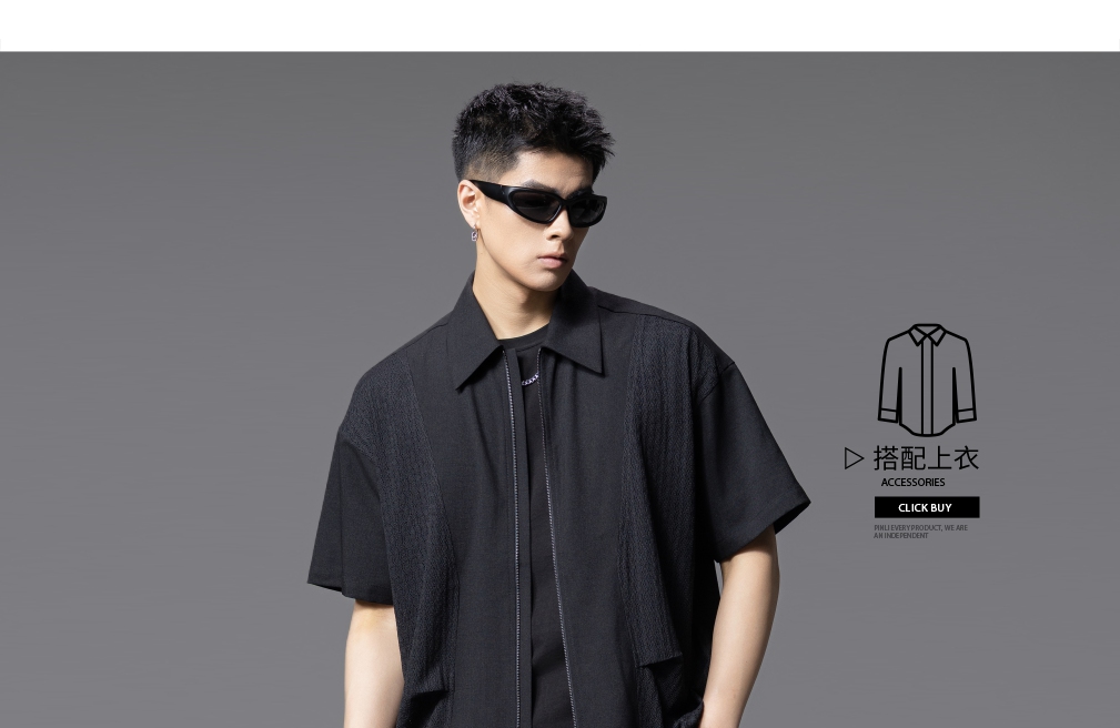 PINLI品立夏季新款设计感拼接短袖衬衫潮牌拉链宽松翻领上衣B252113039