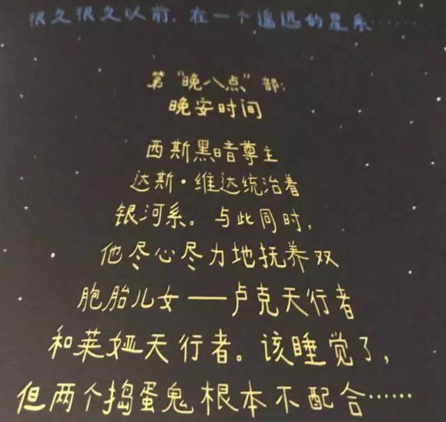 • 《晚安,达斯·维达》则是黑武士给两个孩子讲的晚安故事,当然也适合喜欢星战的爸爸们讲给孩子听。