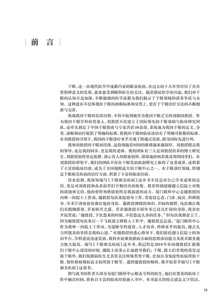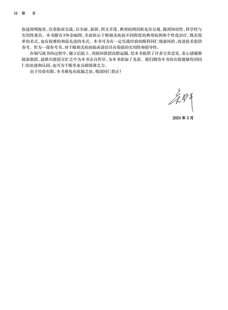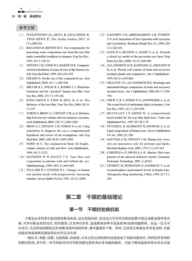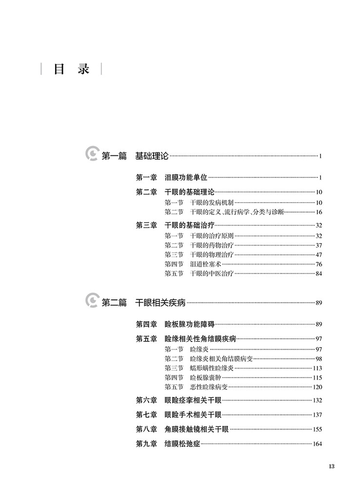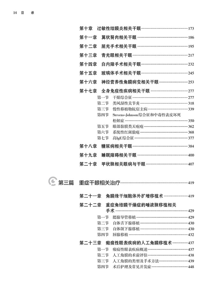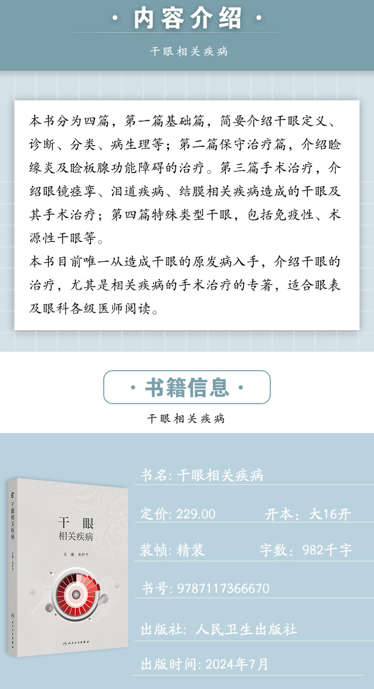 本书分为四篇,第一篇基础篇,简要介绍干眼定义、诊断、分类、病生理等;第二篇保守治疗篇,介绍睑缘炎及睑板腺功能障碍的治疗。第三篇手术治疗,介绍眼镜痉挛、泪道疾病、结膜相关疾病造成的干眼及其手术治疗;第四篇特殊类型干眼,包括免疫性、术源性干眼等。 本书目前唯一从造成干眼的原发病入手,介绍干眼的治疗,尤其是相关疾病的手术治疗的专著,适合眼表及眼科各级医师阅读。