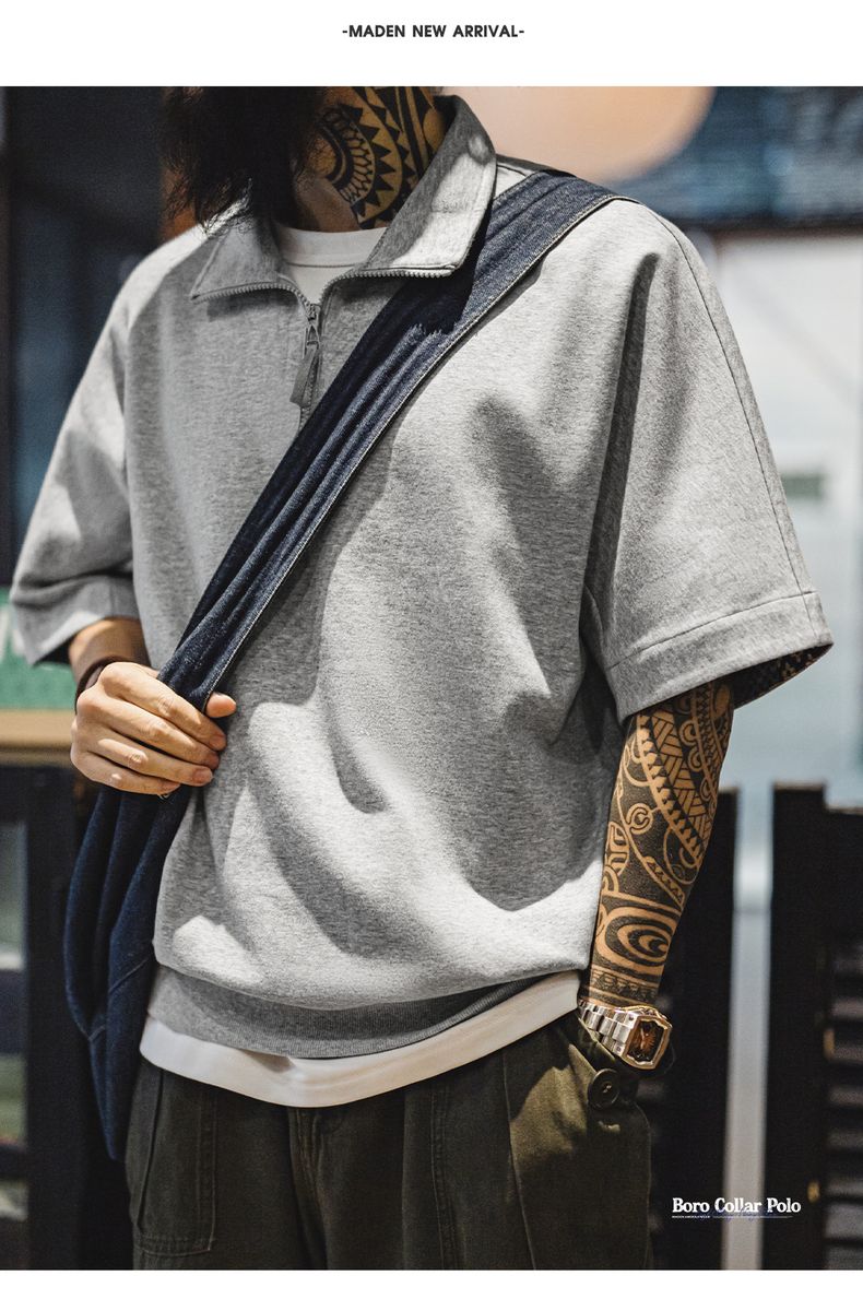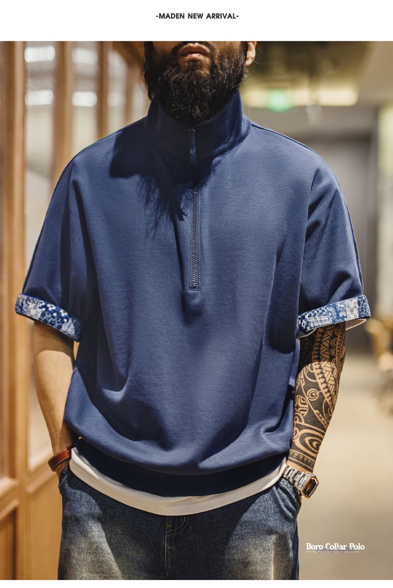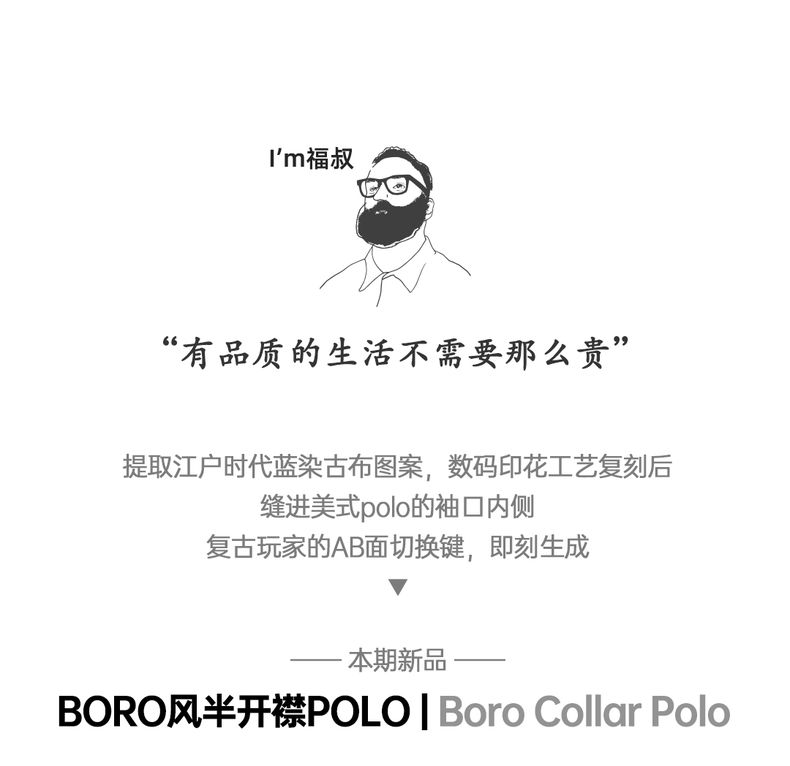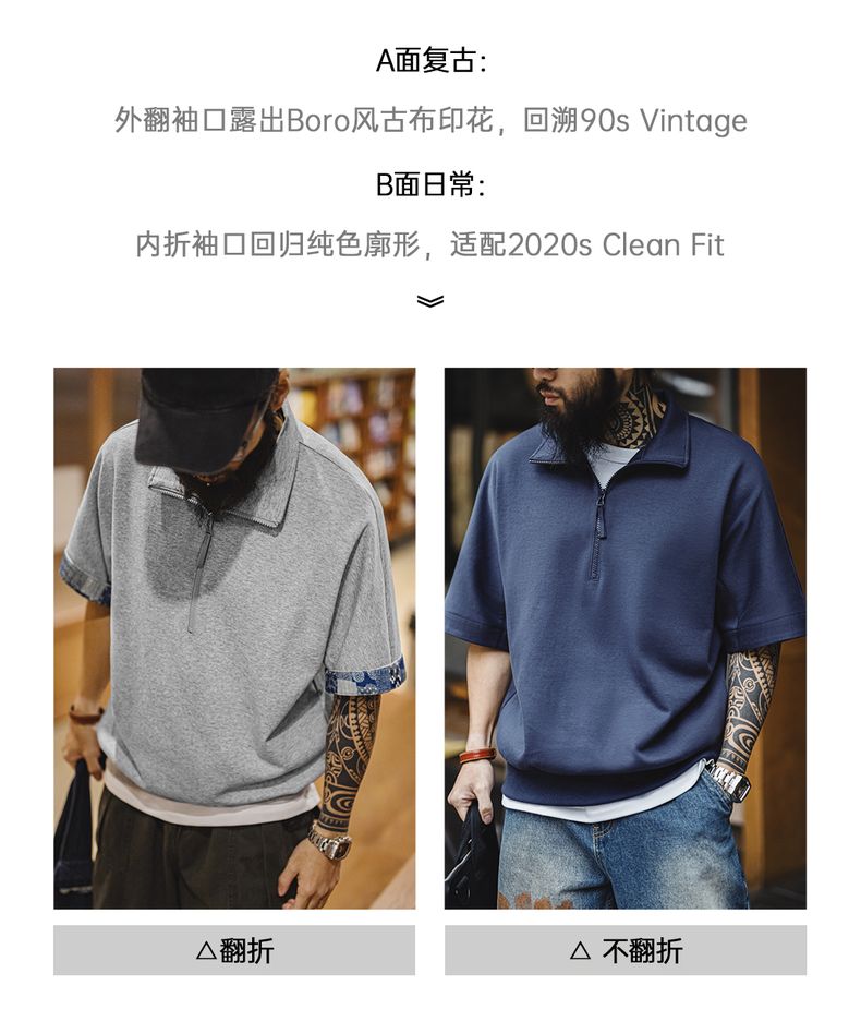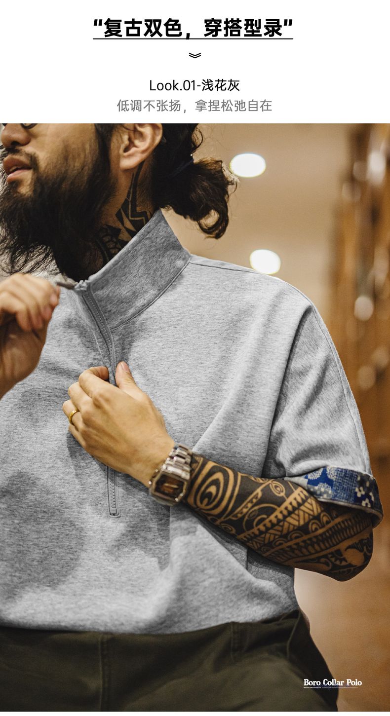工装优选 美式复古boro风半开襟polo古布印花宽松休闲翻领T恤男夏