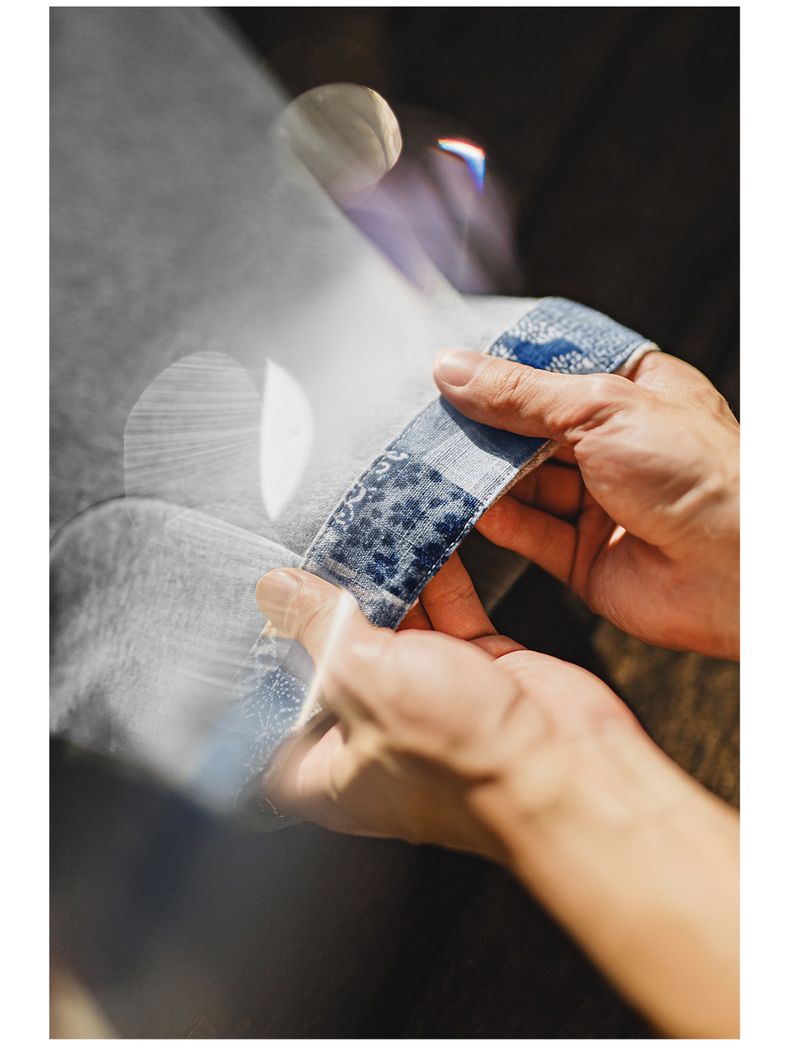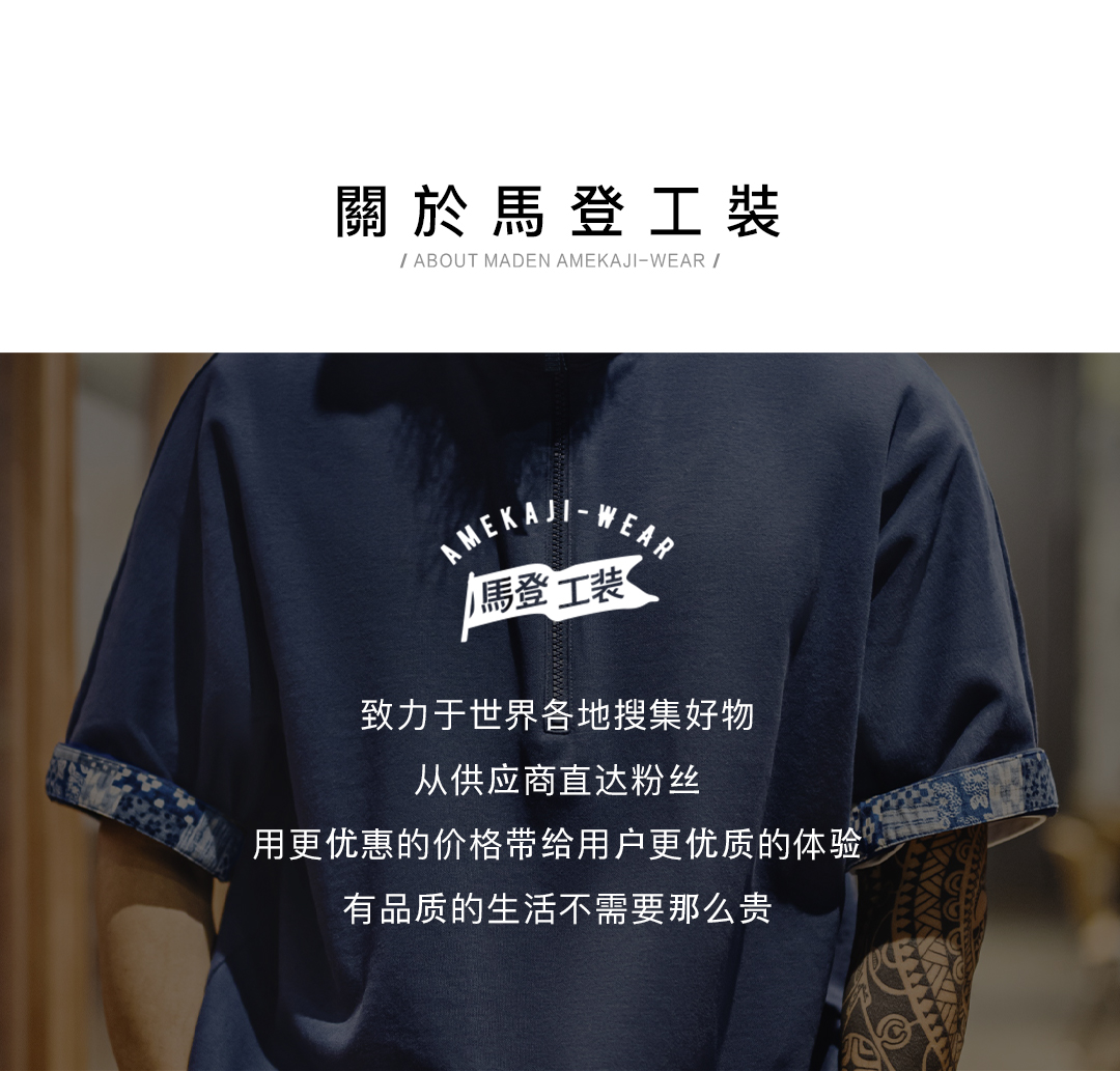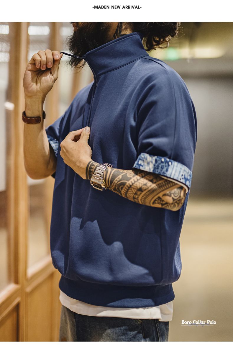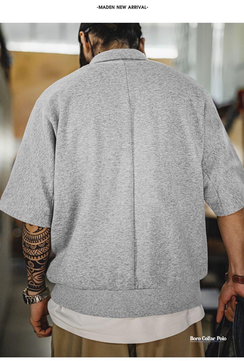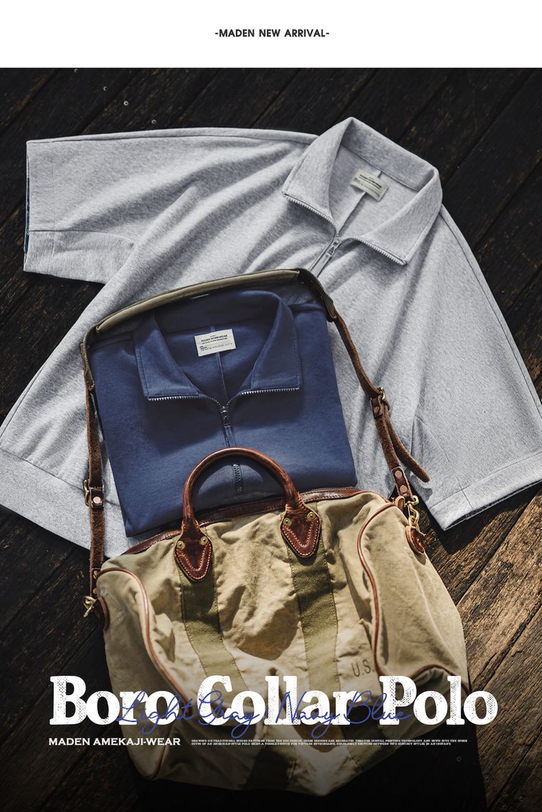 工装优选 美式复古boro风半开襟polo古布印花宽松休闲翻领T恤男夏