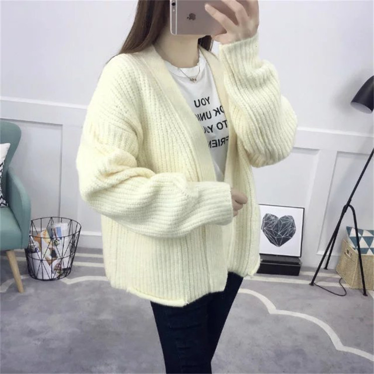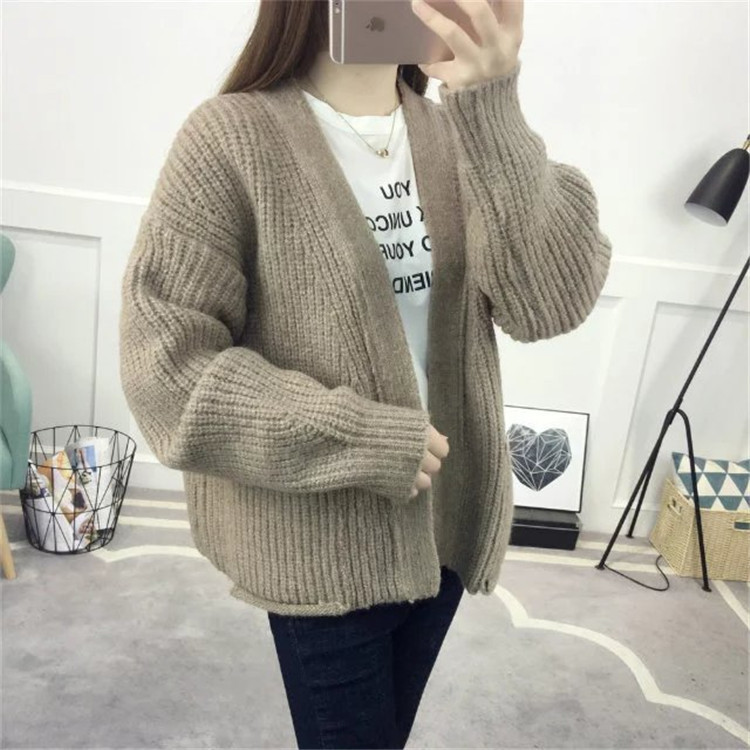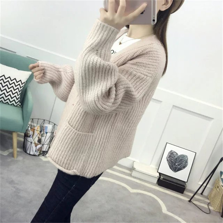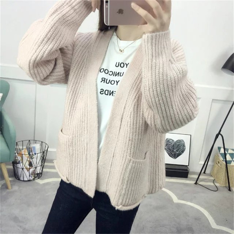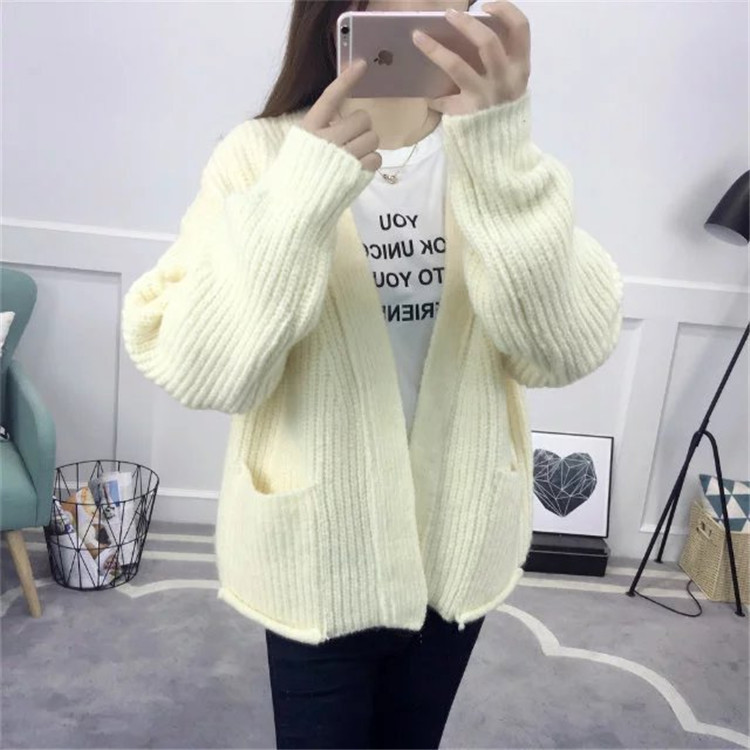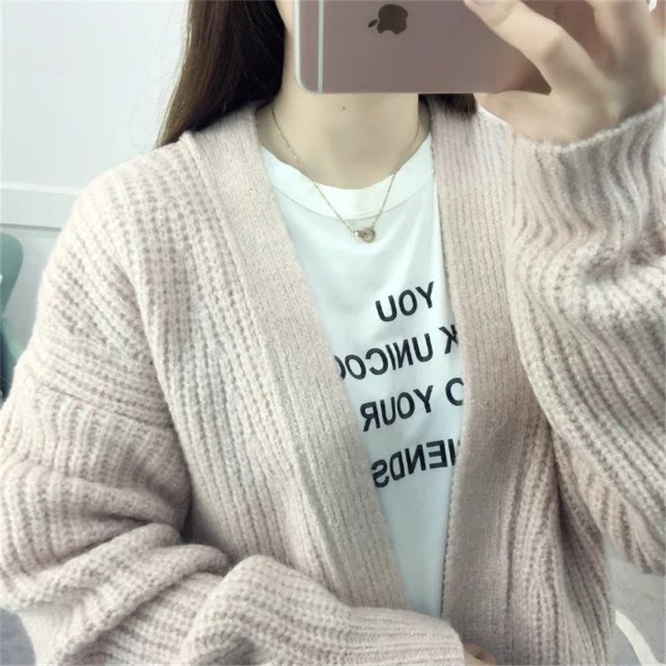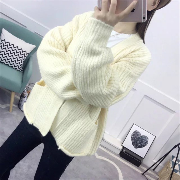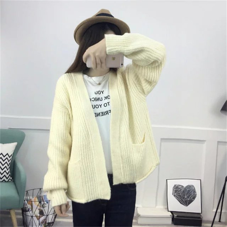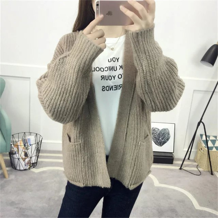 【针织开衫】春装新款宽松口袋毛衣外套女短款V领针织衫百搭学生加厚开衫