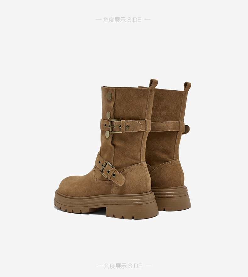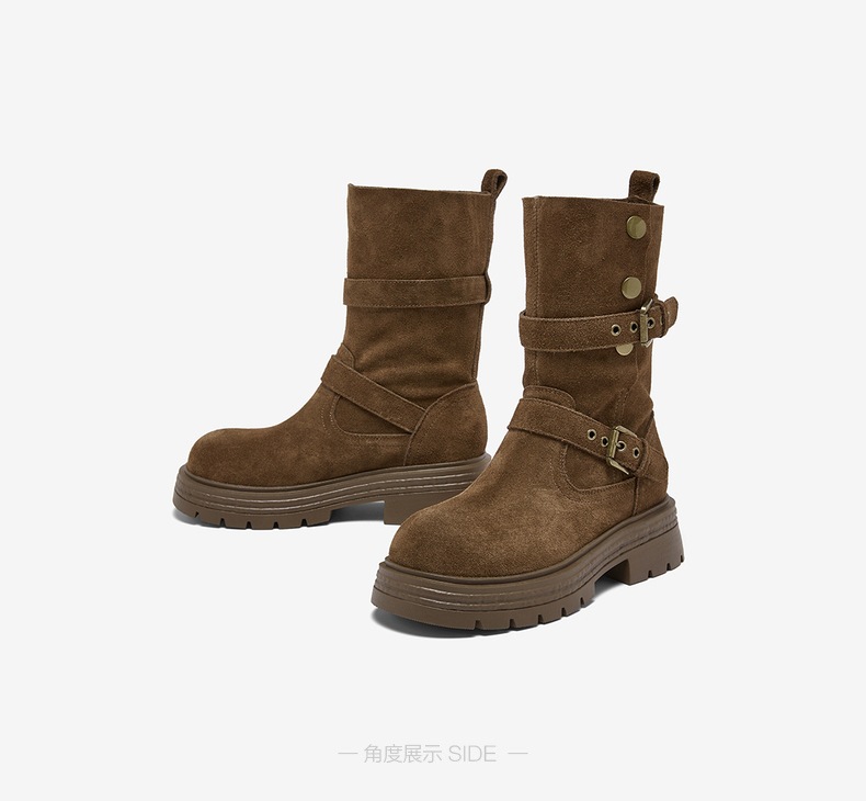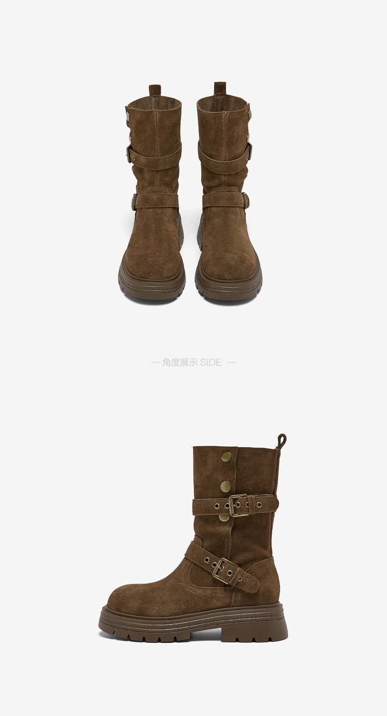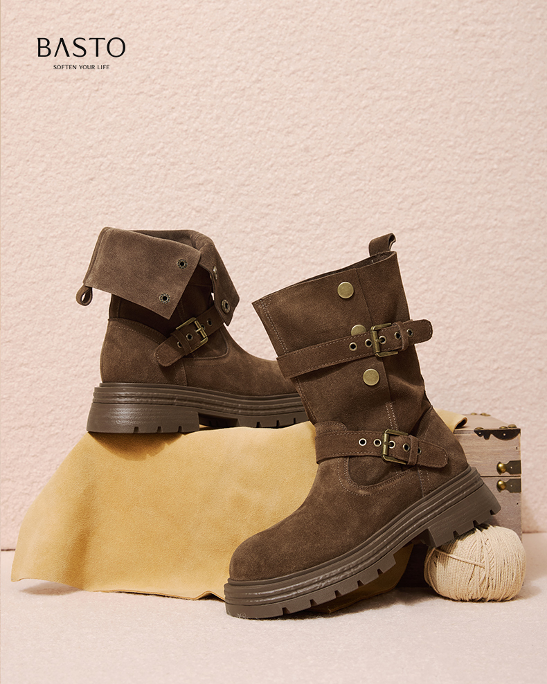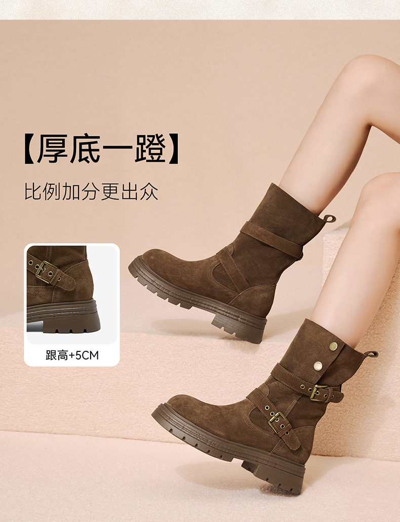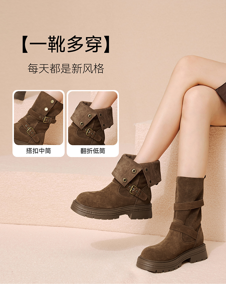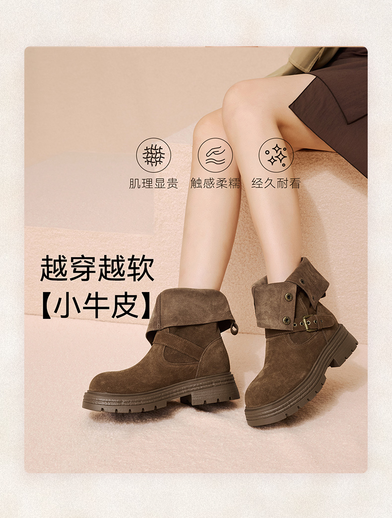 【云粉节】 BF楼百思图2025冬季新款真皮西部靴堆堆靴厚底女棕色短靴BP338DZ5吊牌价1159.现价539