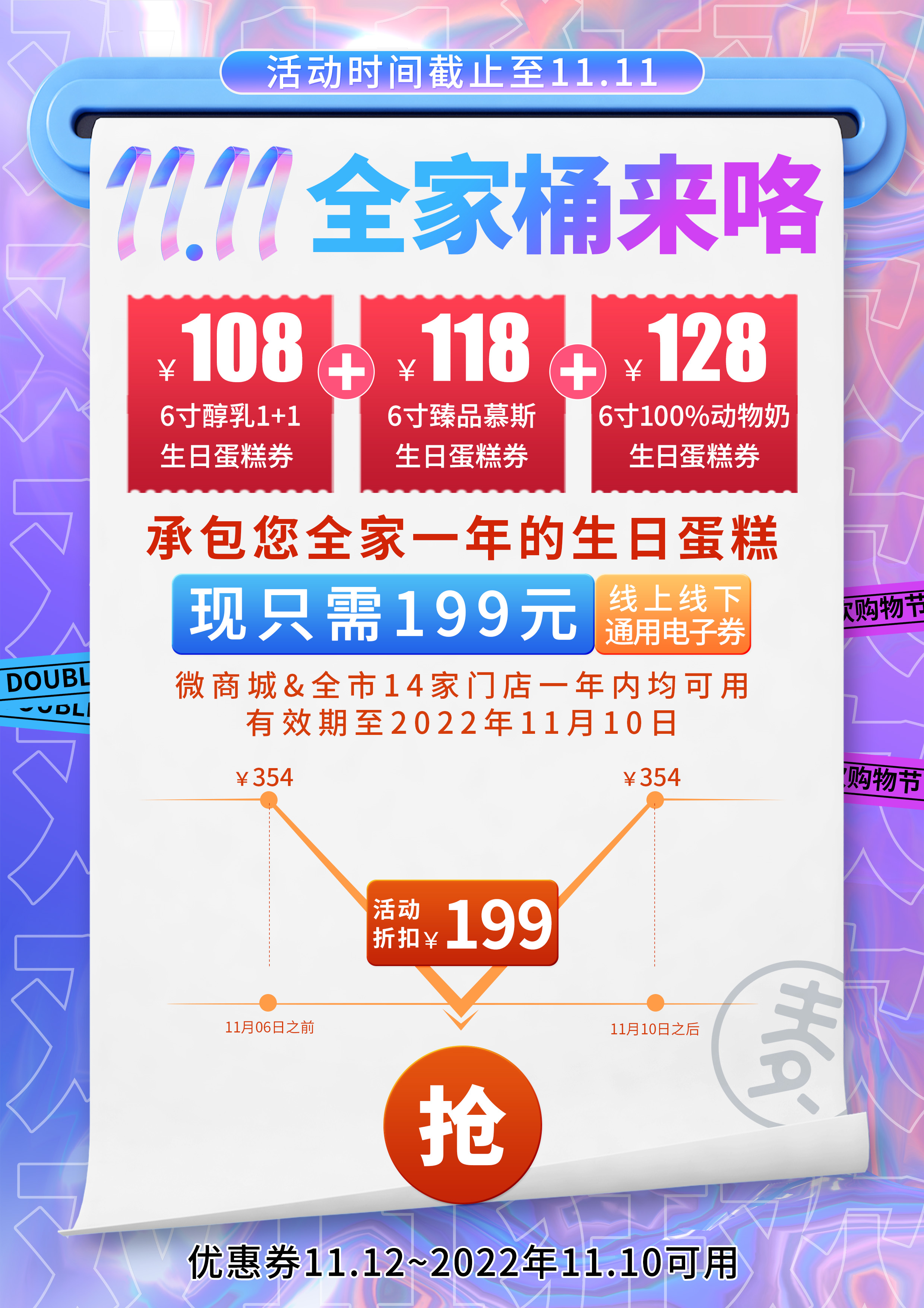 活动结束券在个人中心 【全家桶】仅需199元 ,您全家一年的生日蛋糕【可用于购买6寸以上尺寸】