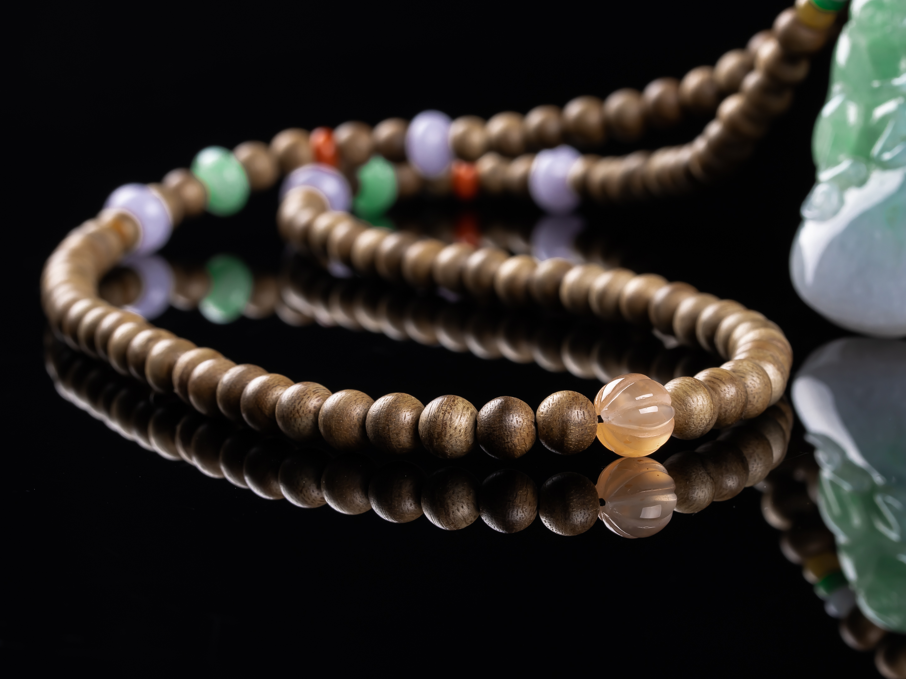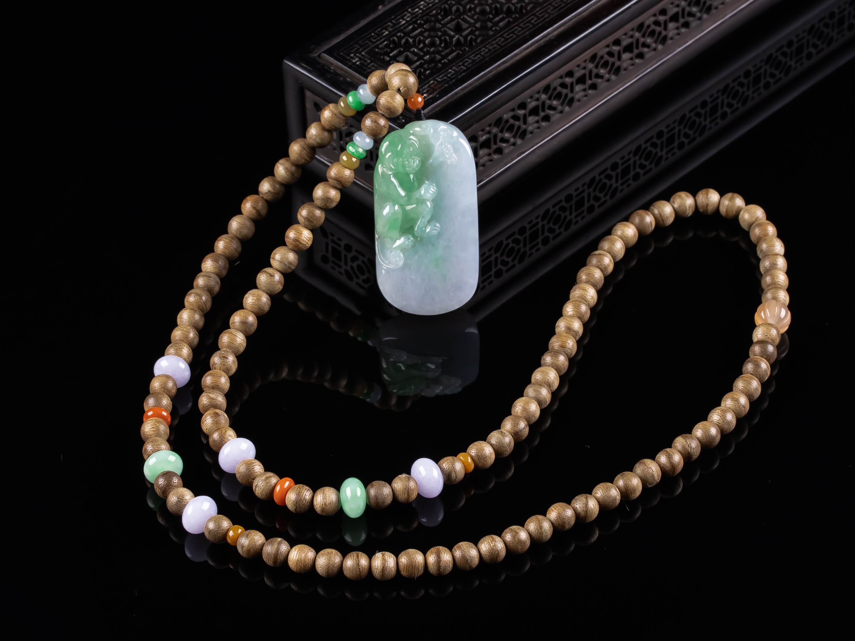 天然沉香+翡翠灵猴套链。沉香珠子尺寸约7mm,链子总长36厘米,配珠:翡翠、南红。整体材质无优化、原色原味、香气淡雅、古色古香。翡翠雕刻灵动、栩栩如生,背后巧色巧雕成尾巴,更是增添了立体感。猴子具有聪明、机灵的形象特点,象征聪明伶俐、封侯如意,当猴子手持如意时,有“灵猴献瑞”的意味,仿佛是猴子带着祥瑞和好运来到人们身边,为佩戴者带来福气和吉祥,能让生活充满喜悦和幸福。