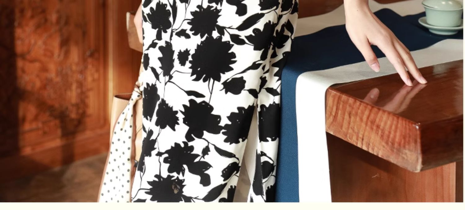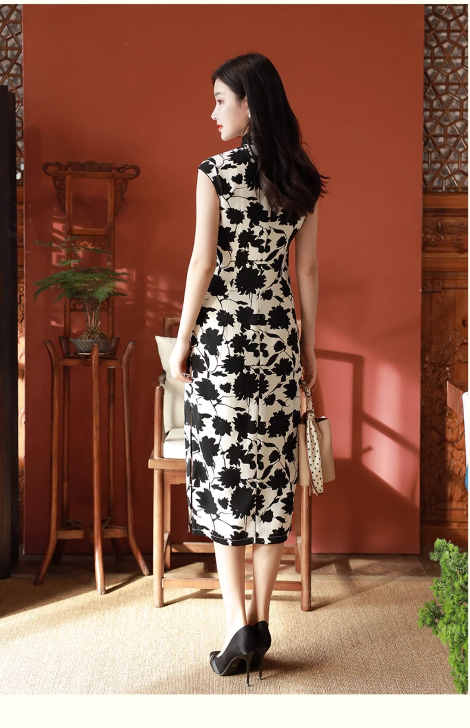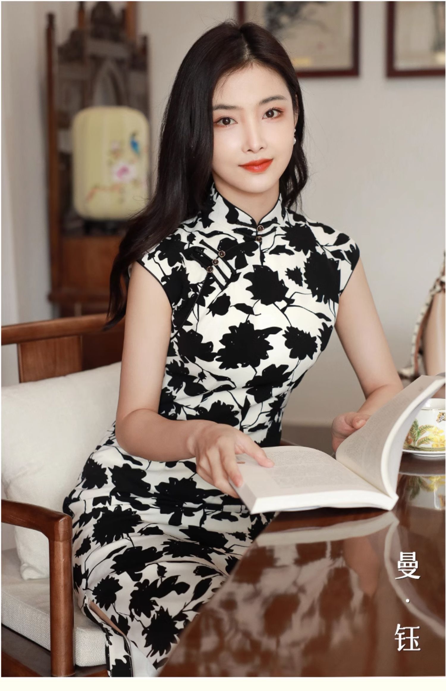 原创新中式改良旗袍夏女白底印花雪纺修身包肩袖长款日常裙子曼钰