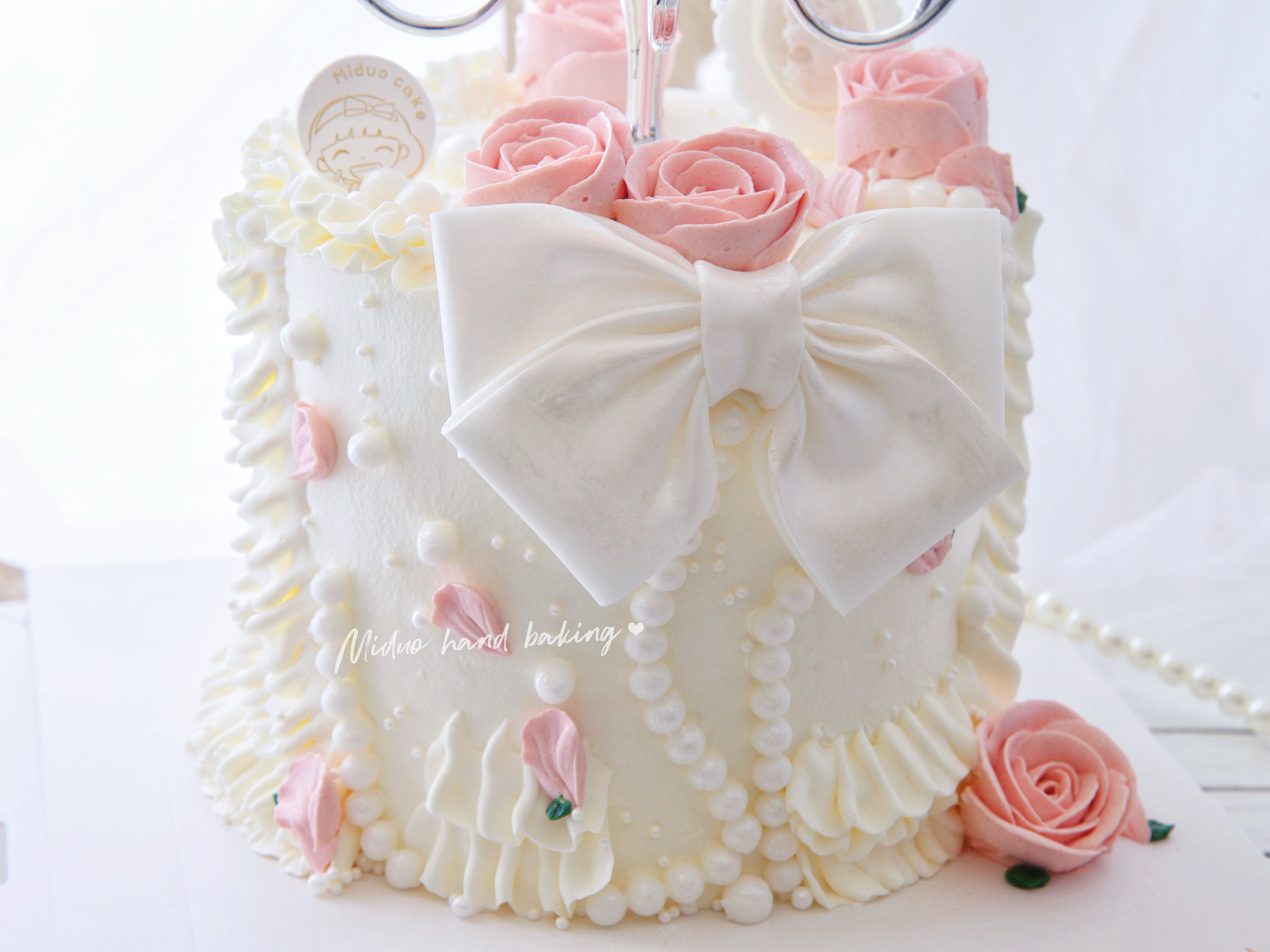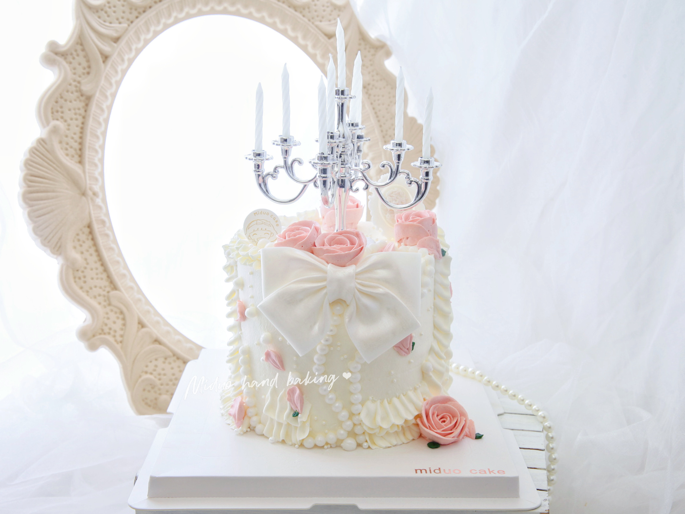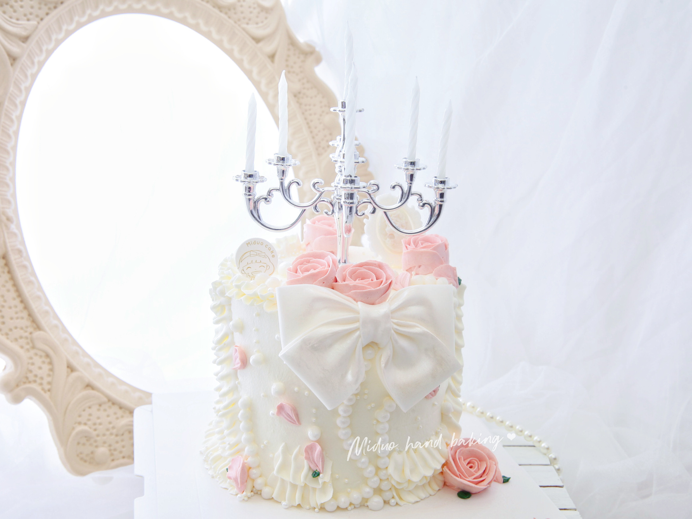 女士款 珠光宝气 蝴蝶结 烛台 粉粉小玫瑰 翻糖 韩式裱花蛋糕