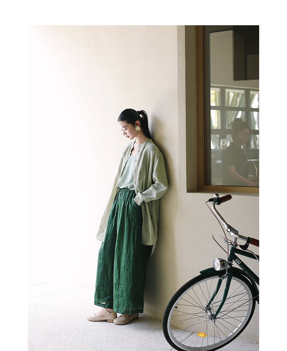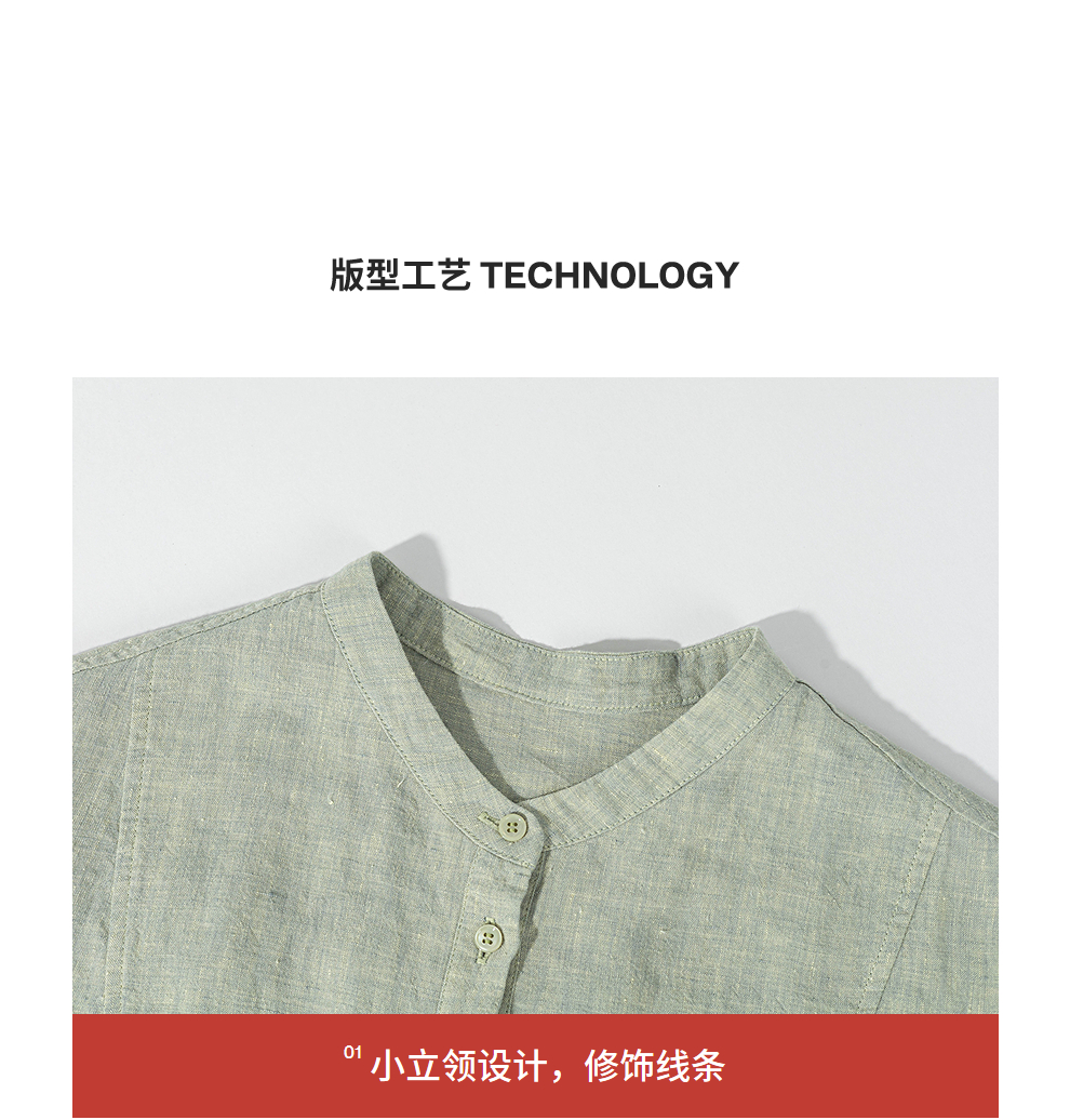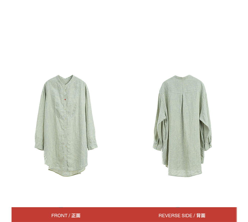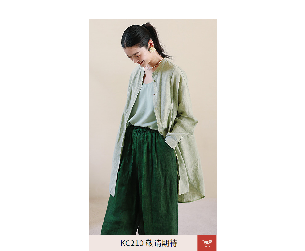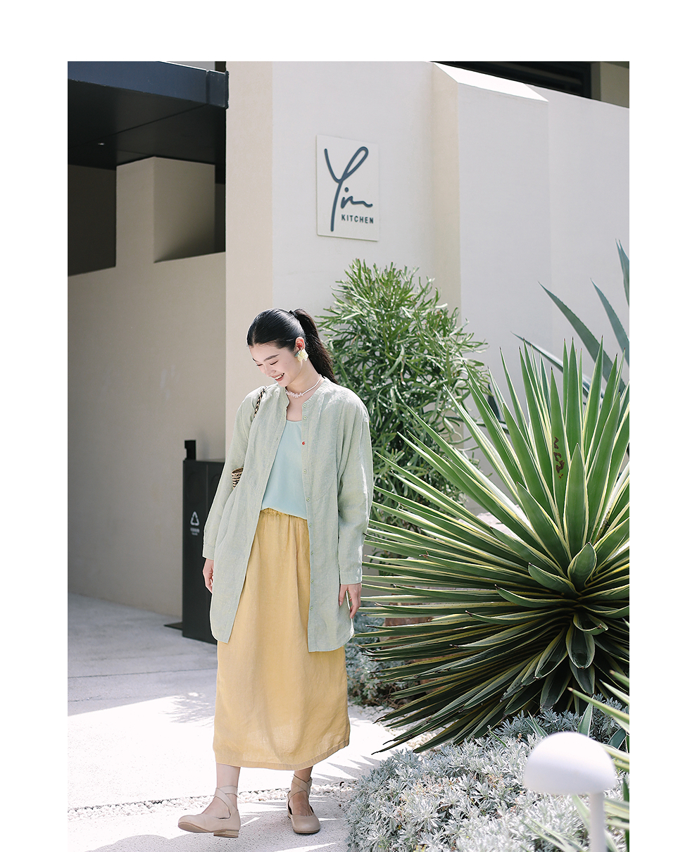绽放旅行女装204朵/嫩芽绿衬衫色织亚麻酵磨洗小立领中长款外套