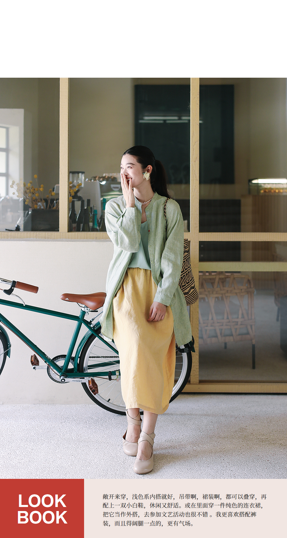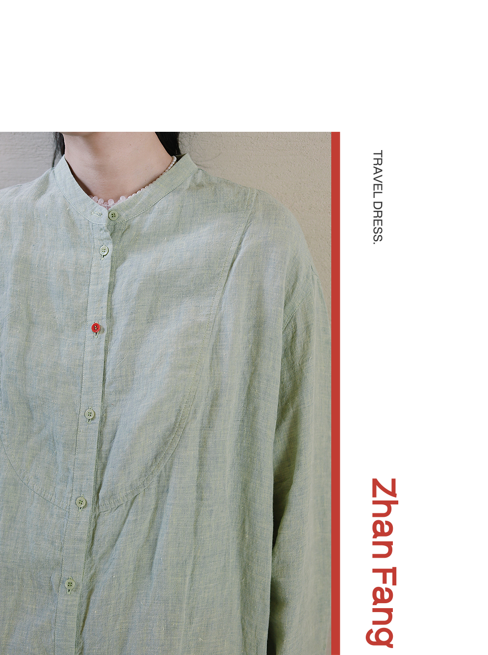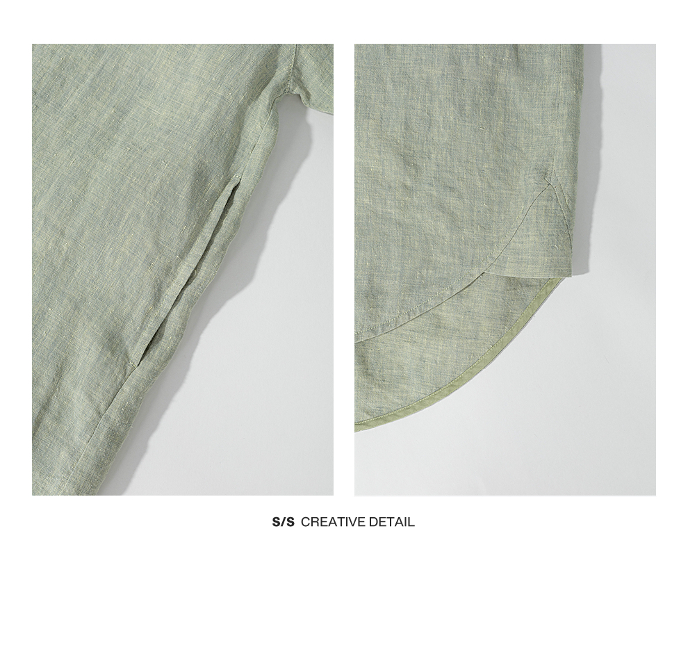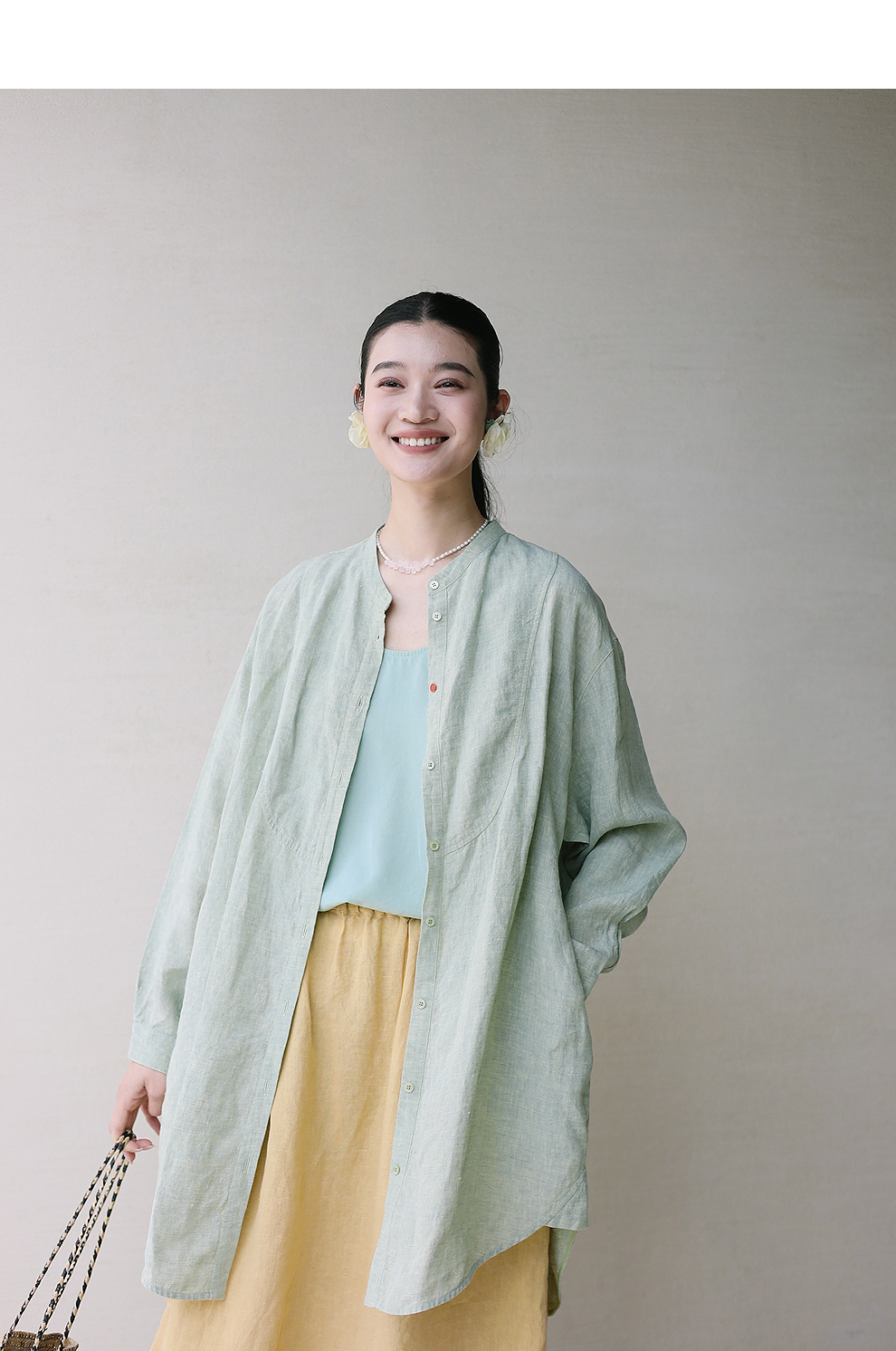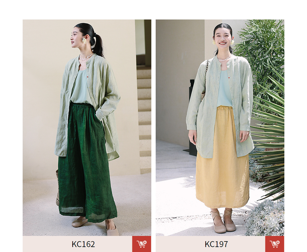 绽放旅行女装204朵/嫩芽绿衬衫色织亚麻酵磨洗小立领中长款外套