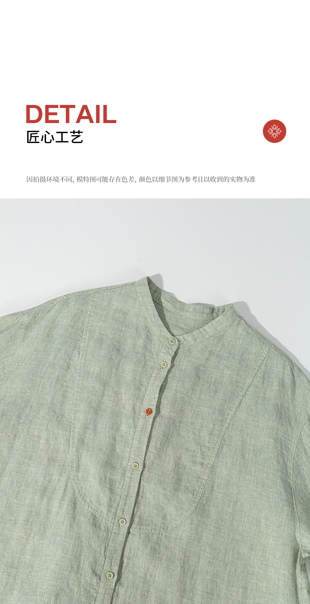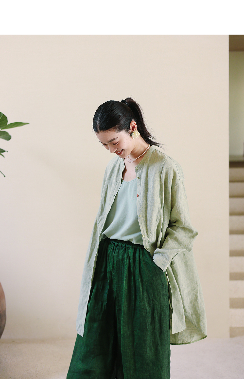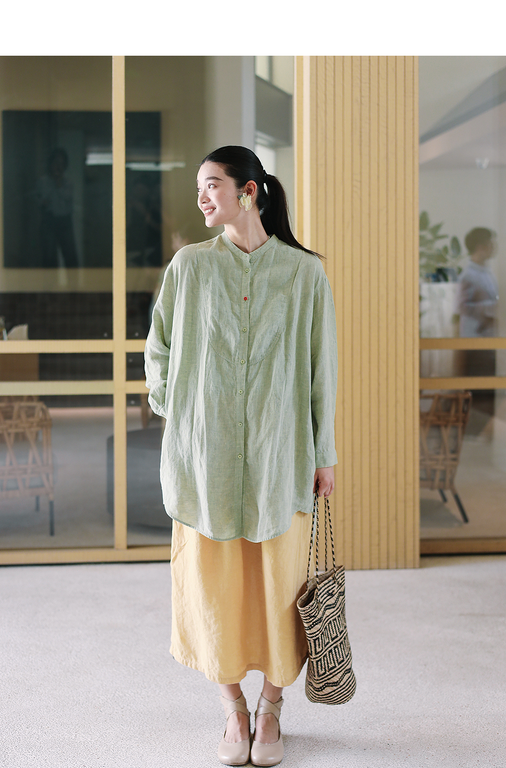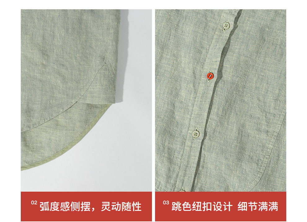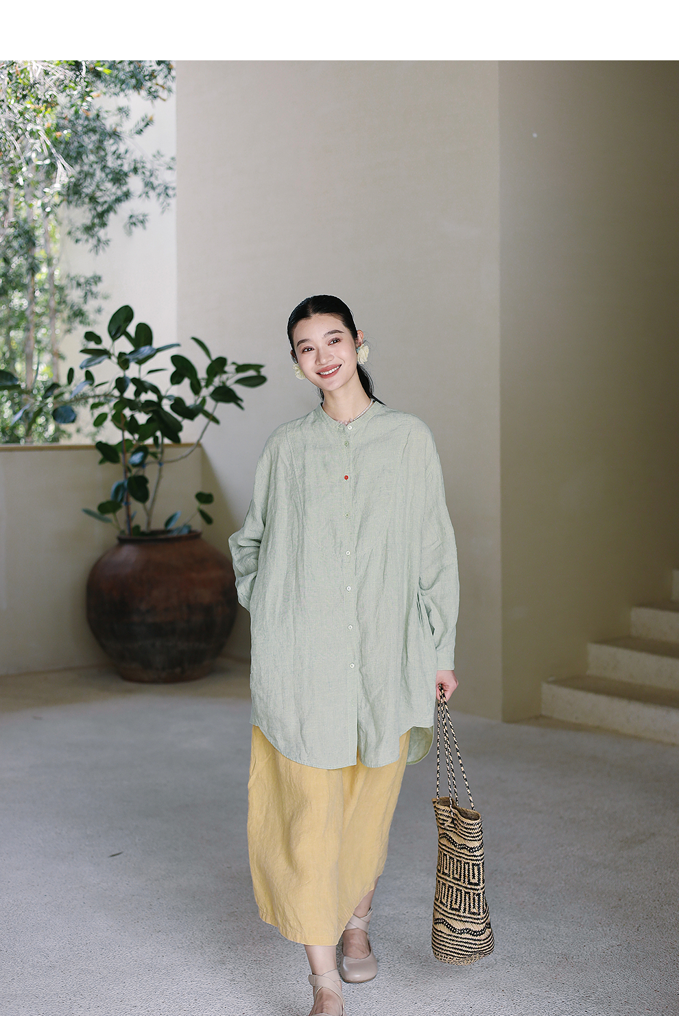 绽放旅行女装204朵/嫩芽绿衬衫色织亚麻酵磨洗小立领中长款外套