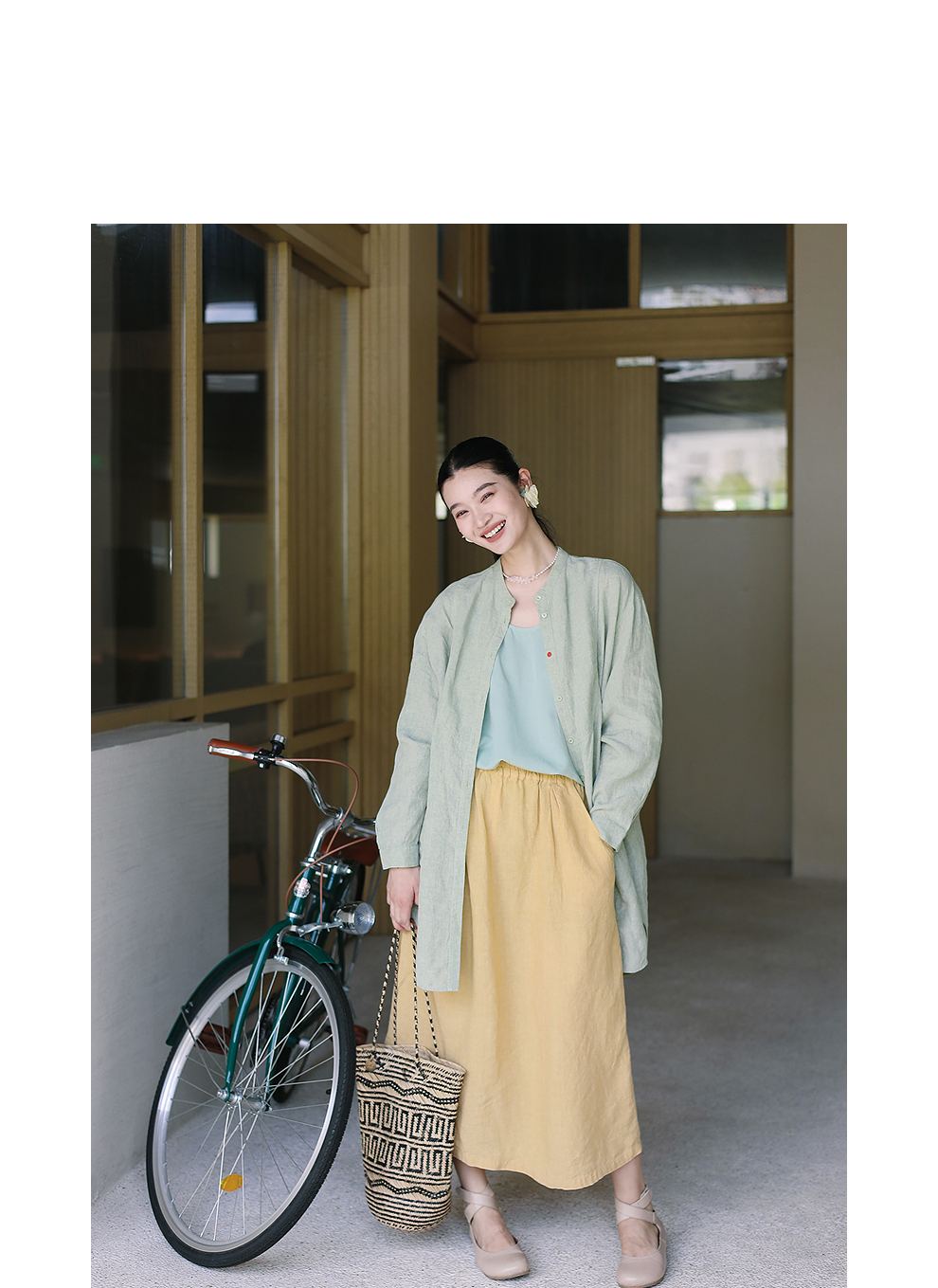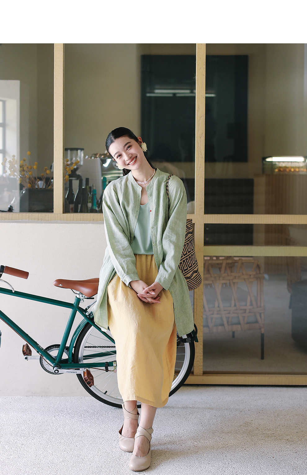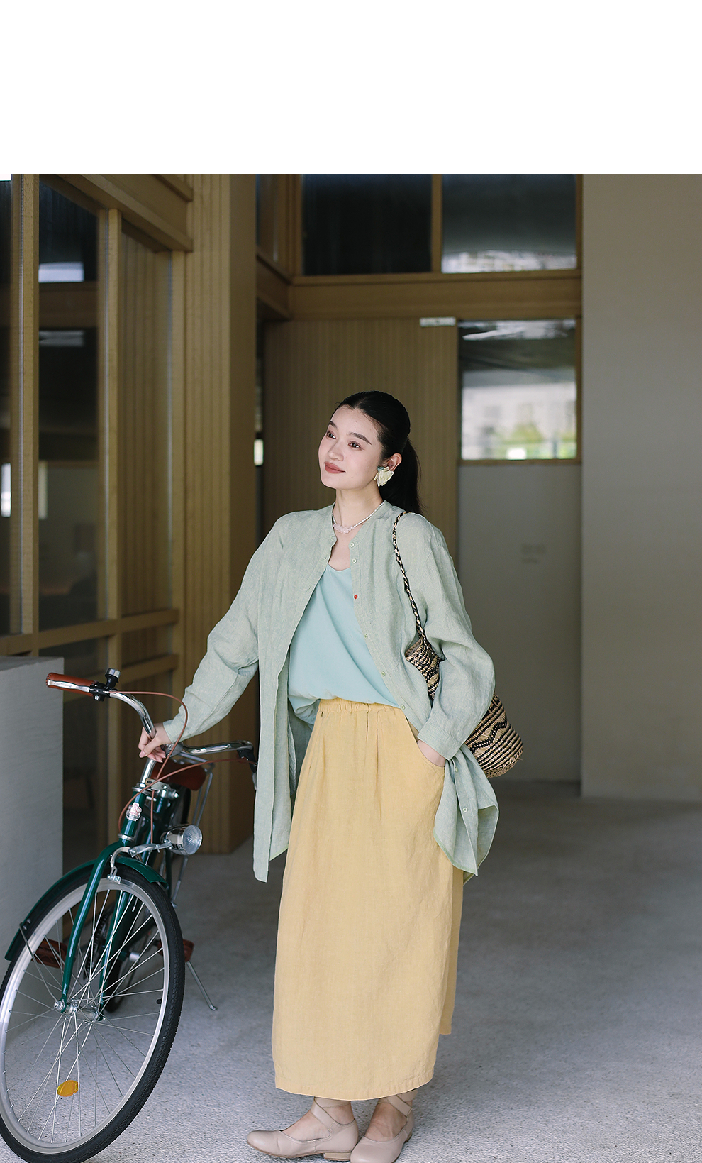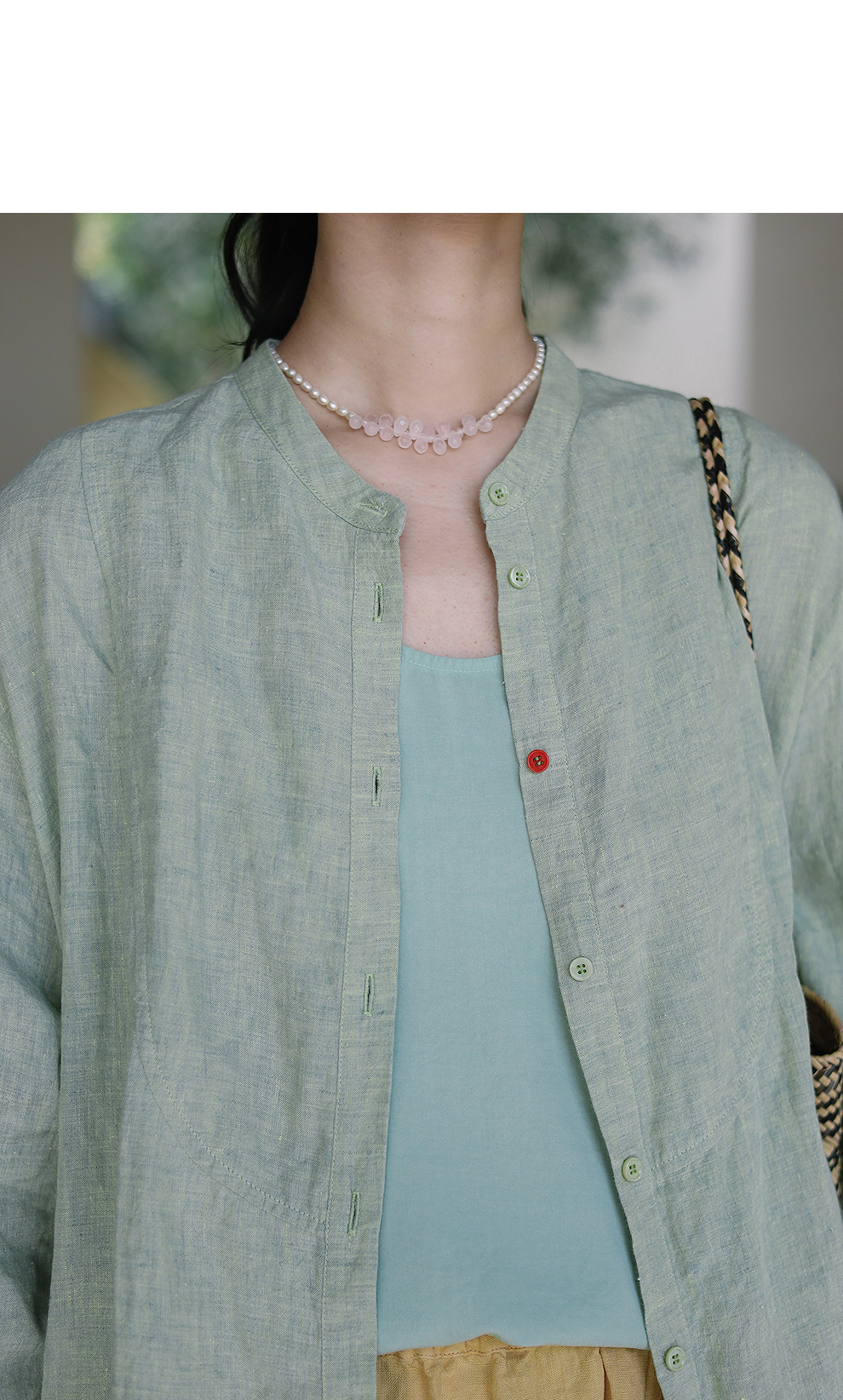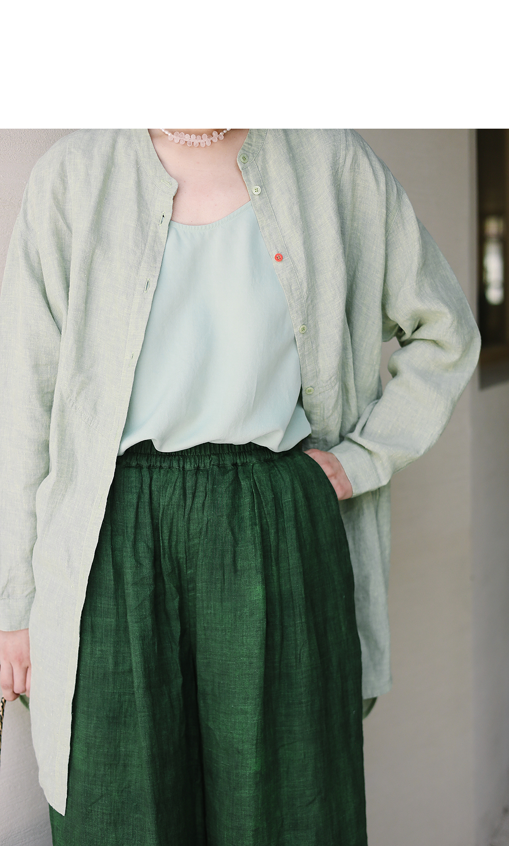 绽放旅行女装204朵/嫩芽绿衬衫色织亚麻酵磨洗小立领中长款外套