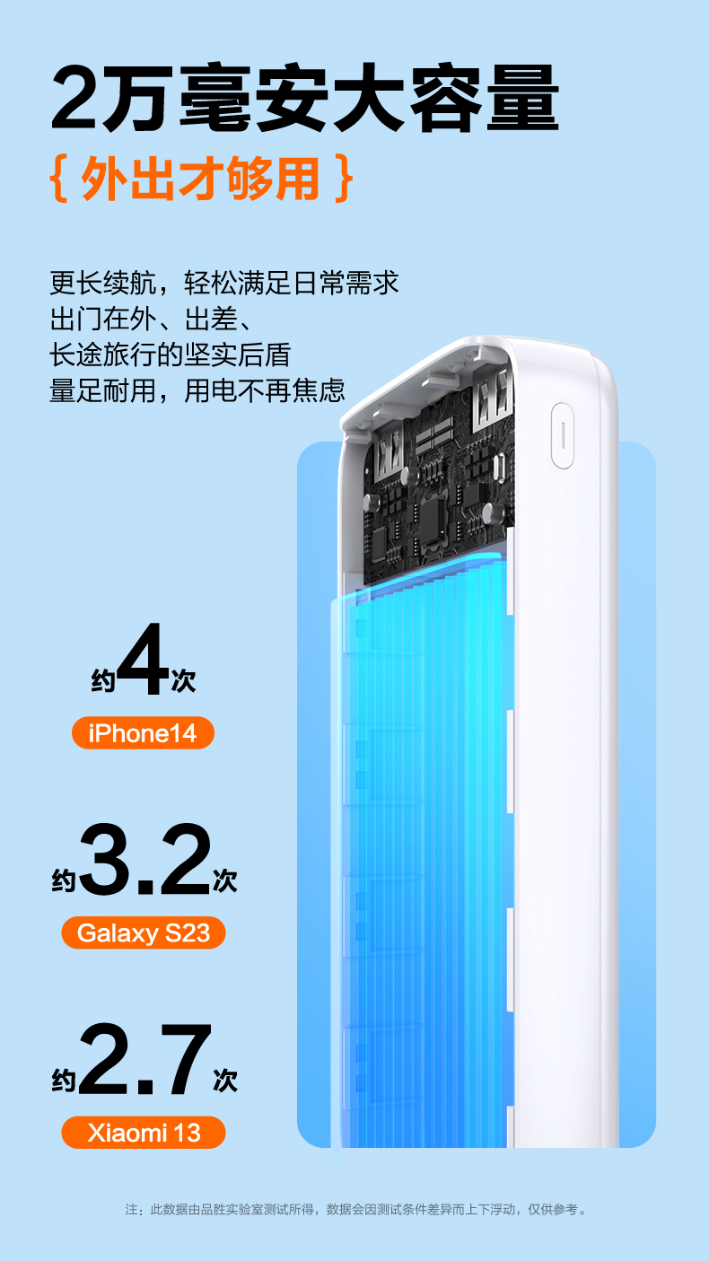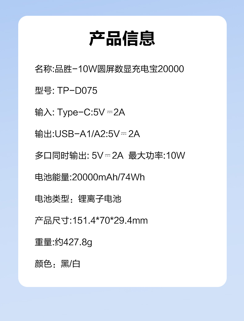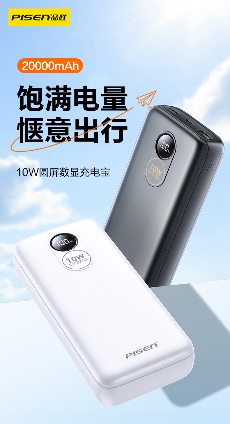品胜 10W圆屏数显充电宝20000毫安移动电源 支持苹果/华为/小米/荣耀等设备