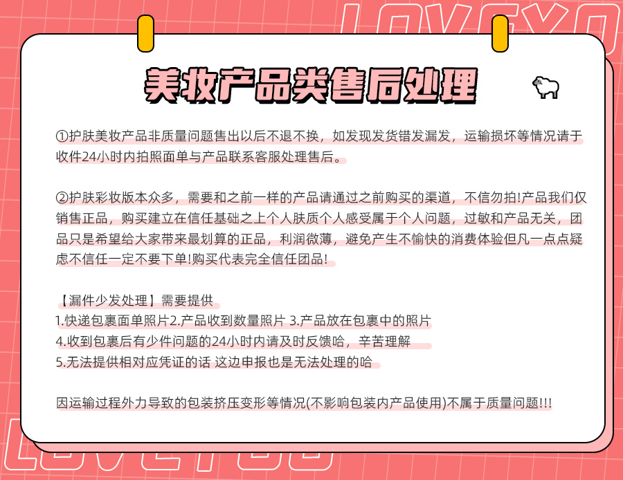 2、由于美妆品类更新换代较快,会出现包装版本、批次不同,不属于产品质量问题3、产品已经发出的情况下,不可更改地址,拒绝任何形式的拒签,收到产品后当场验货,4、如出现异常情况,请带面单+产品拍照并与我们联系,我们会第一时间处理,如产品有质量问题可在收货24小时之内,联系客服进行赔付换货或者补发;5、留错地址、电话等信息导致货物不能正常送达均不在售后范围内;