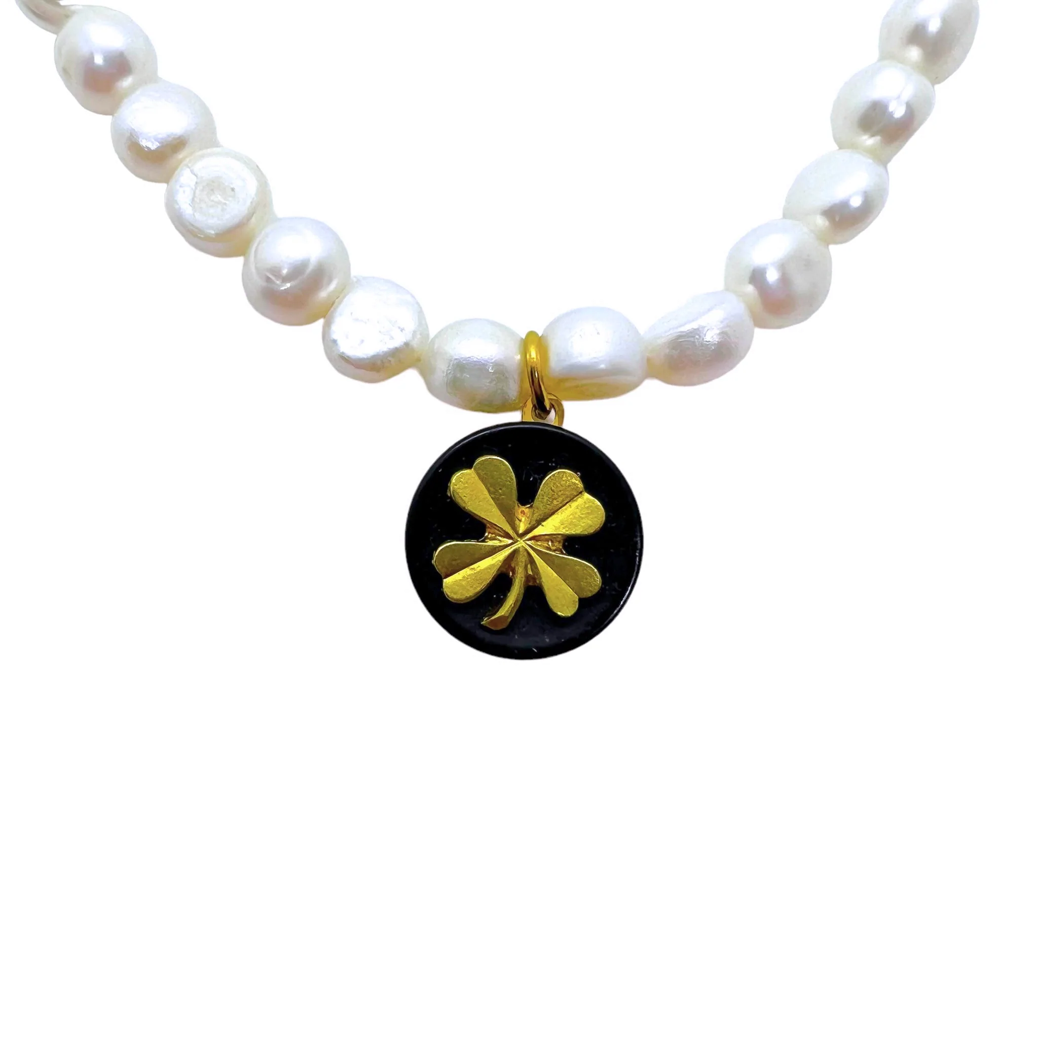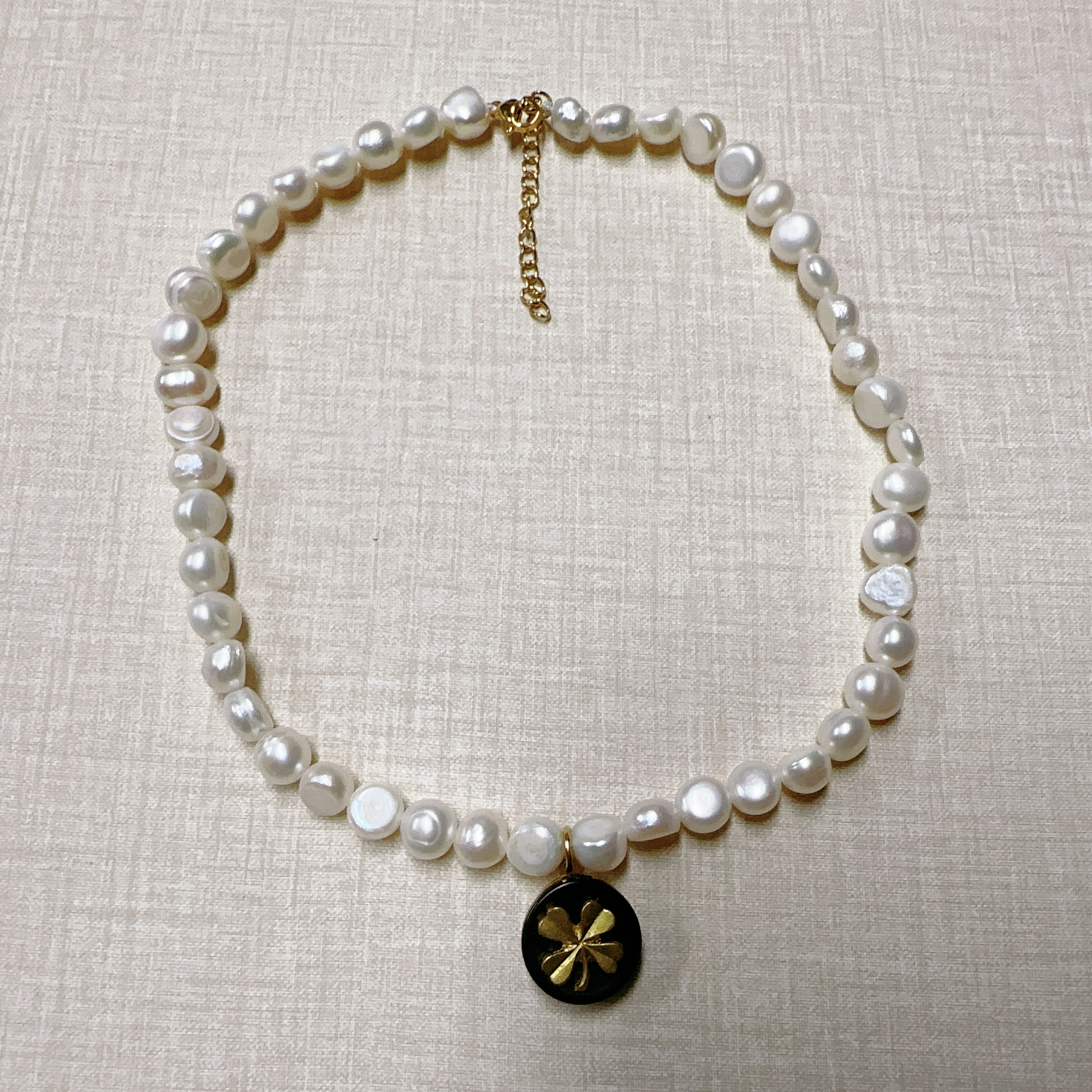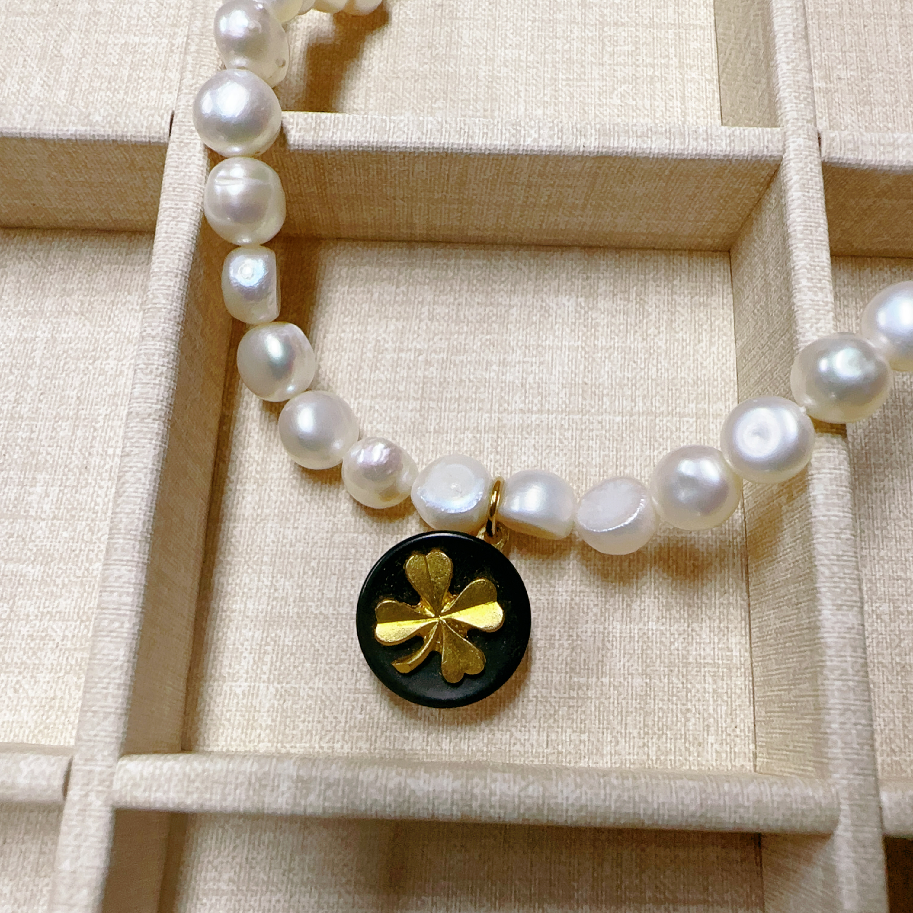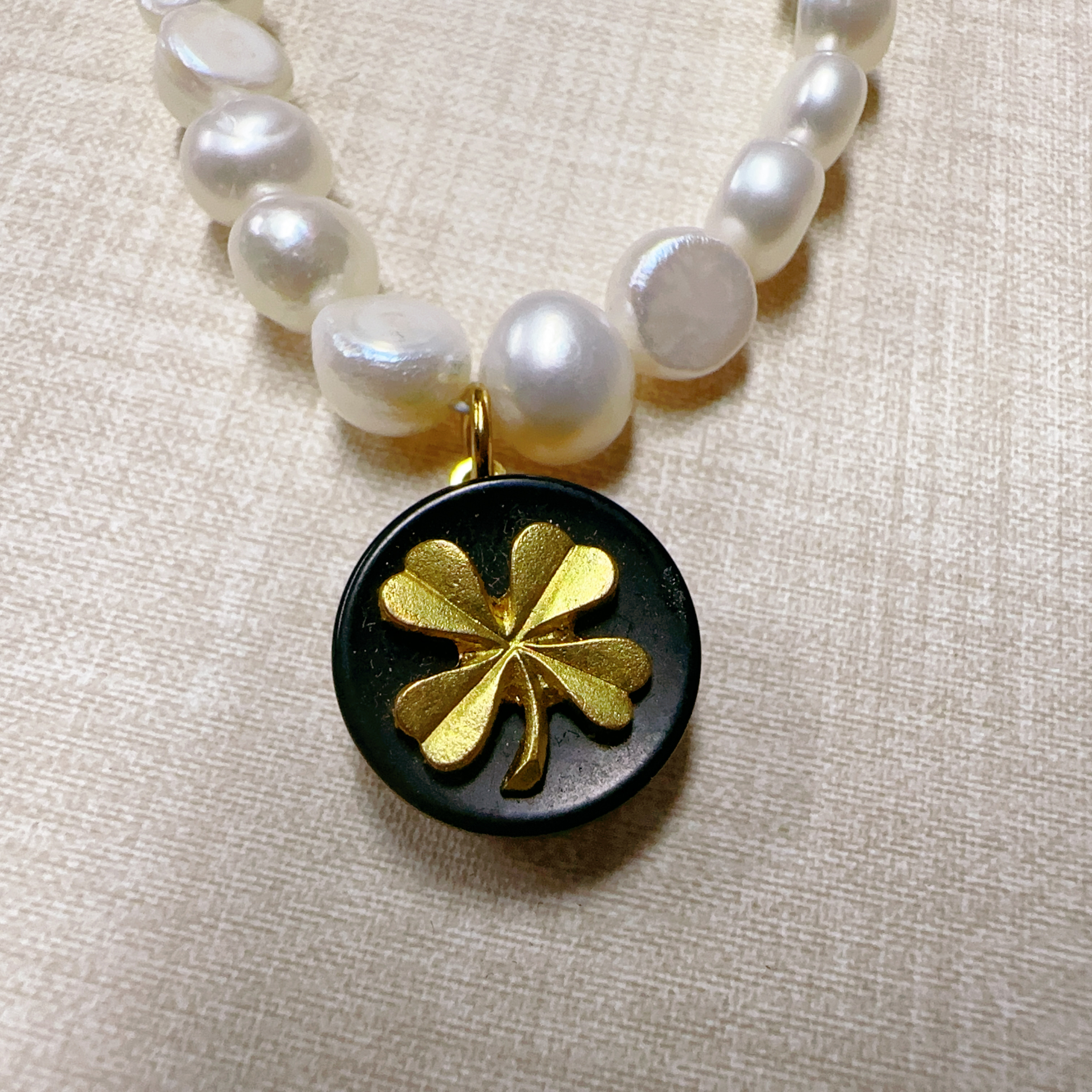 北京仓|Gigi Paris-黑金 四叶草-中古纽扣 珍珠 项链[法国设计师]