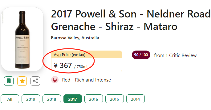 这款老藤 GSM 混酿干红在国际葡萄酒比价网站 wine-searcher 上的国际税前均价为 367 元人民币,此次红酒百科全书满减后的价格比均价还要低,实属高性价比之选。
