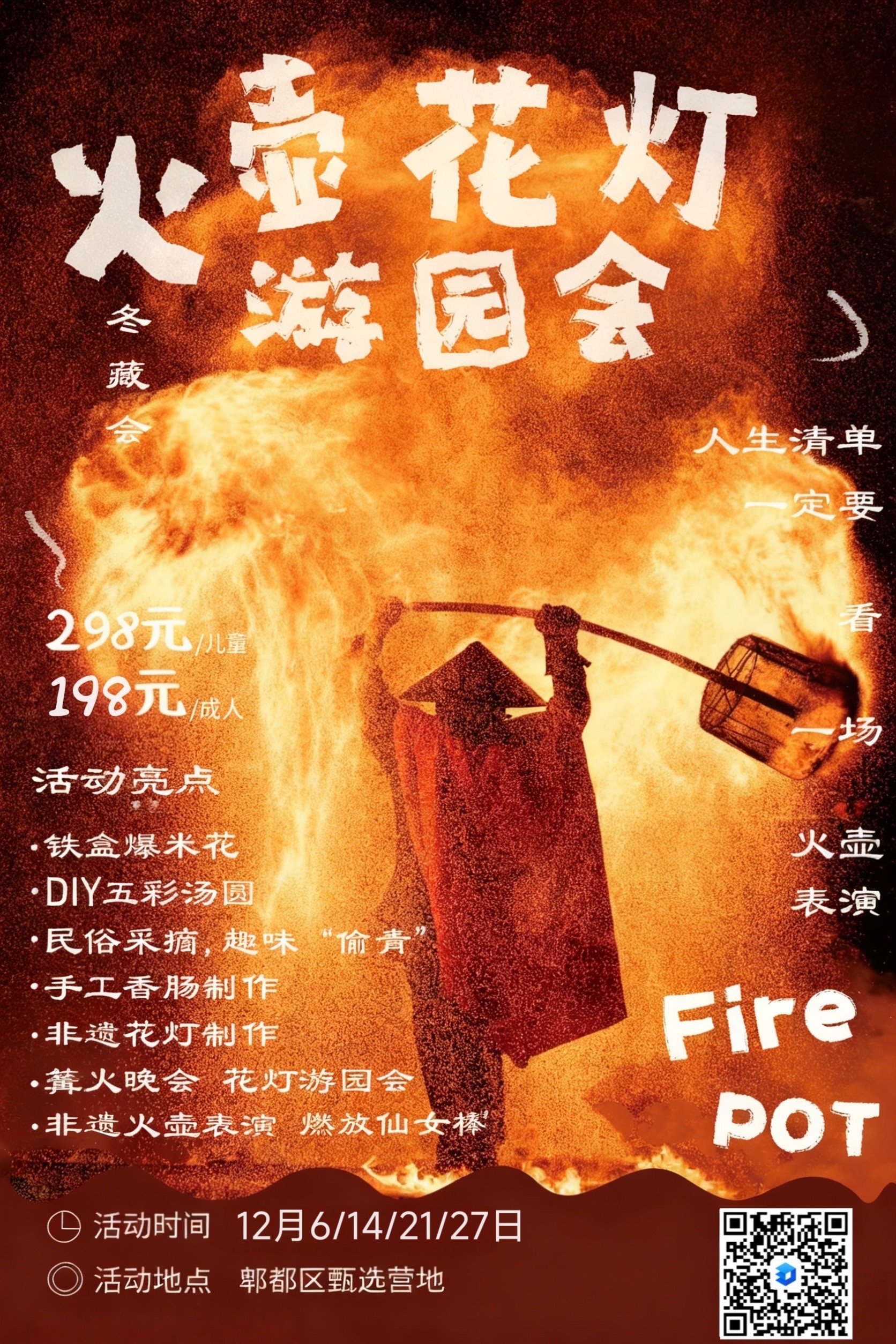 12.21,郫都区【火壶花灯游园会】Diy铁盒爆米花/五彩汤团,自制手工年味香肠,非遗花灯制作,篝火晚会,非遗火壶表演