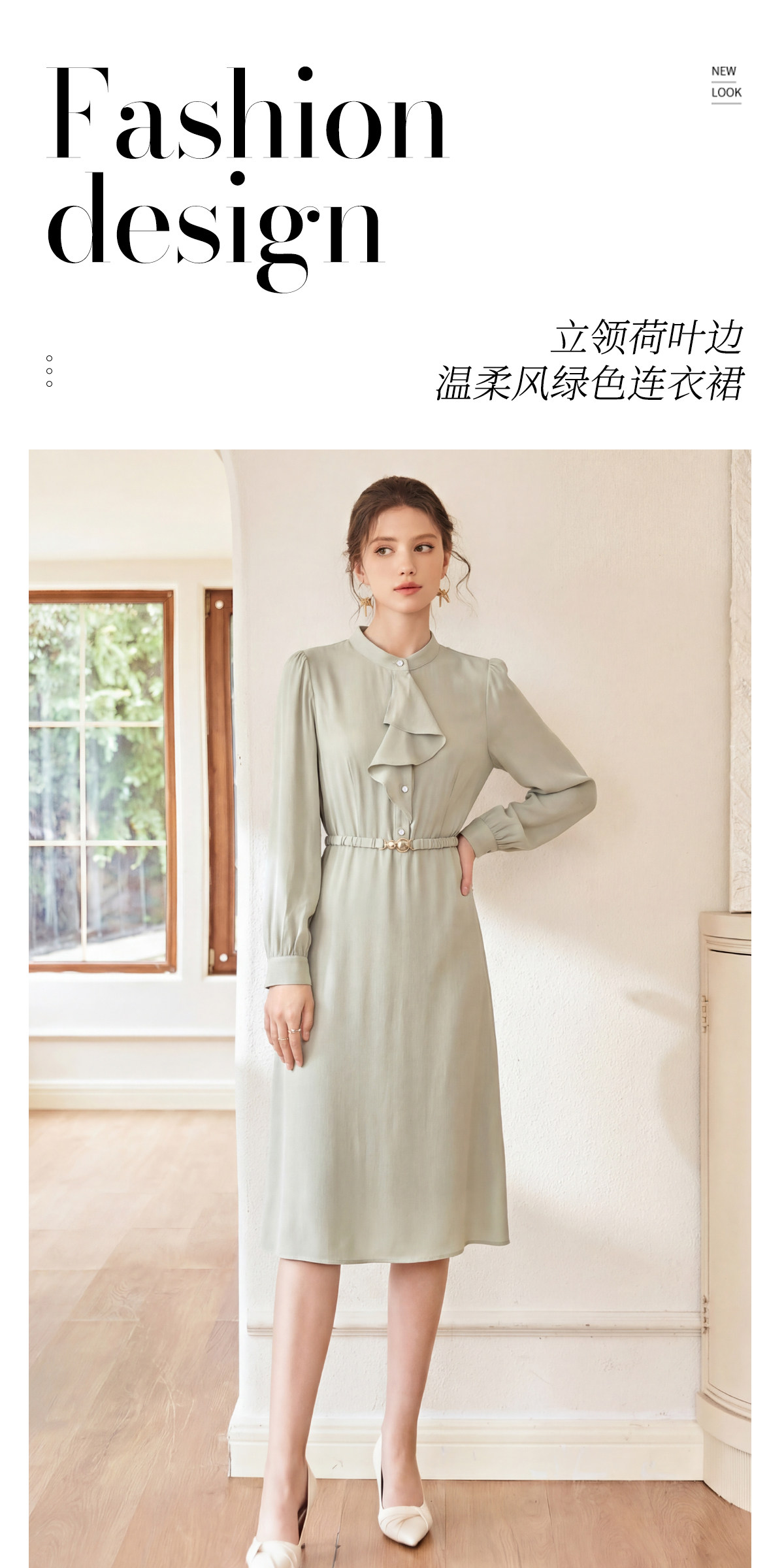 艾尚臣清冷松弛荷叶领浪漫衬衫裙连衣裙女收腰显瘦中长裙通勤早春