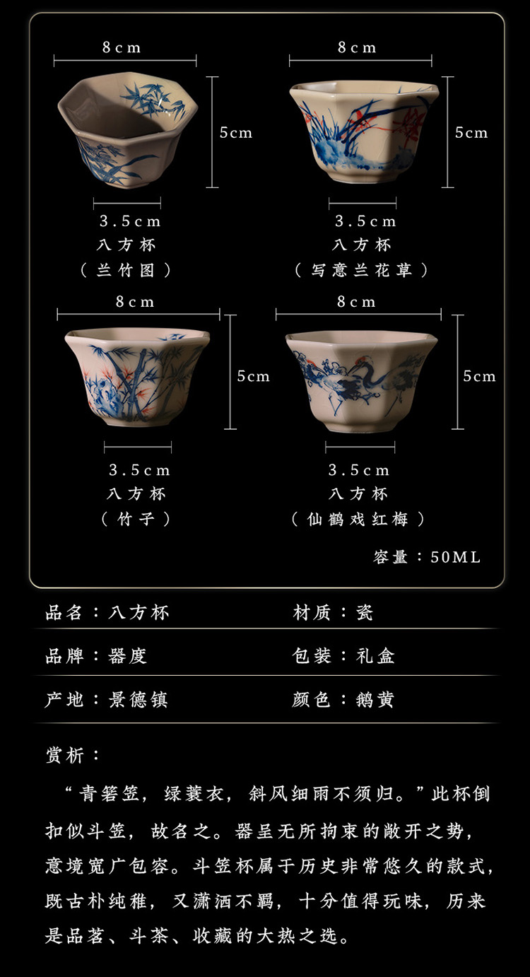 问鼎器度汝窑鹅黄青花八方杯(仙鹤戏红梅)八方杯(写意兰花草)八方杯(竹子)八方杯(兰竹图)(缺货)