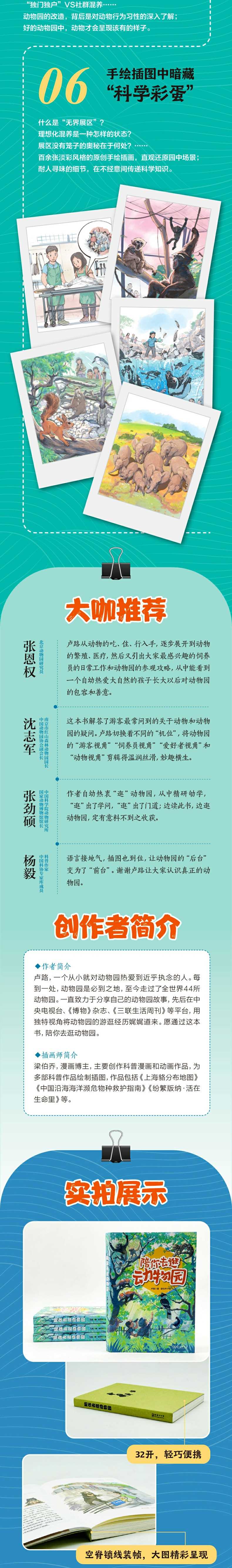 手绘插图中暗藏;科学彩蛋什么是;无界展区?理想化混养是一种怎样的状态?展区没有笼子的奥秘在于何处?百余张淡彩风格的原创手绘插画,直观还原园中场景;耐人寻味的细节,在不经意间传递科学知识。