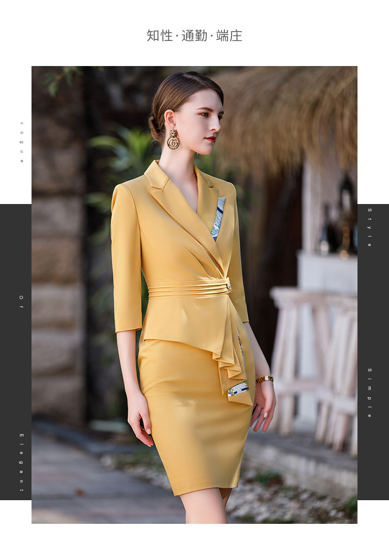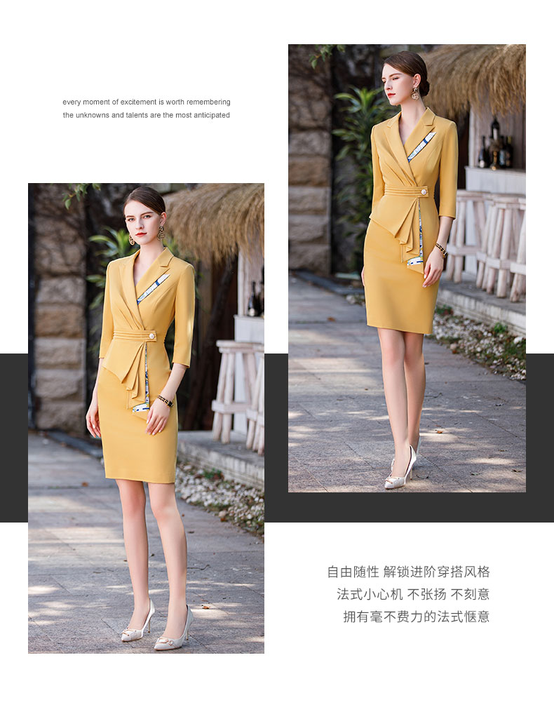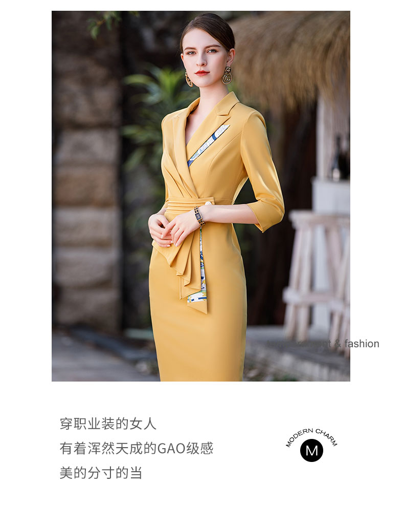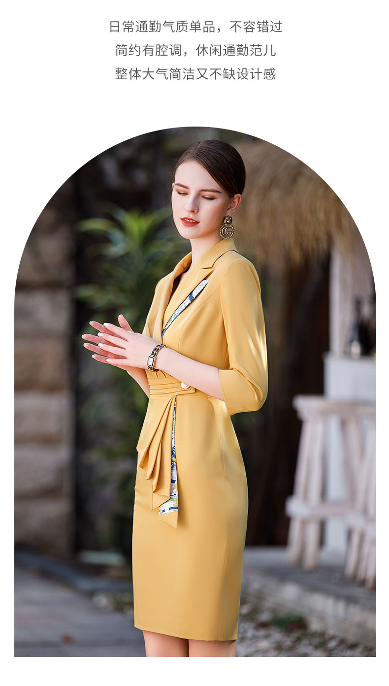 AD御姐范职业连衣裙女秋季七分袖黄色工作服时尚气质假两件丝裙子